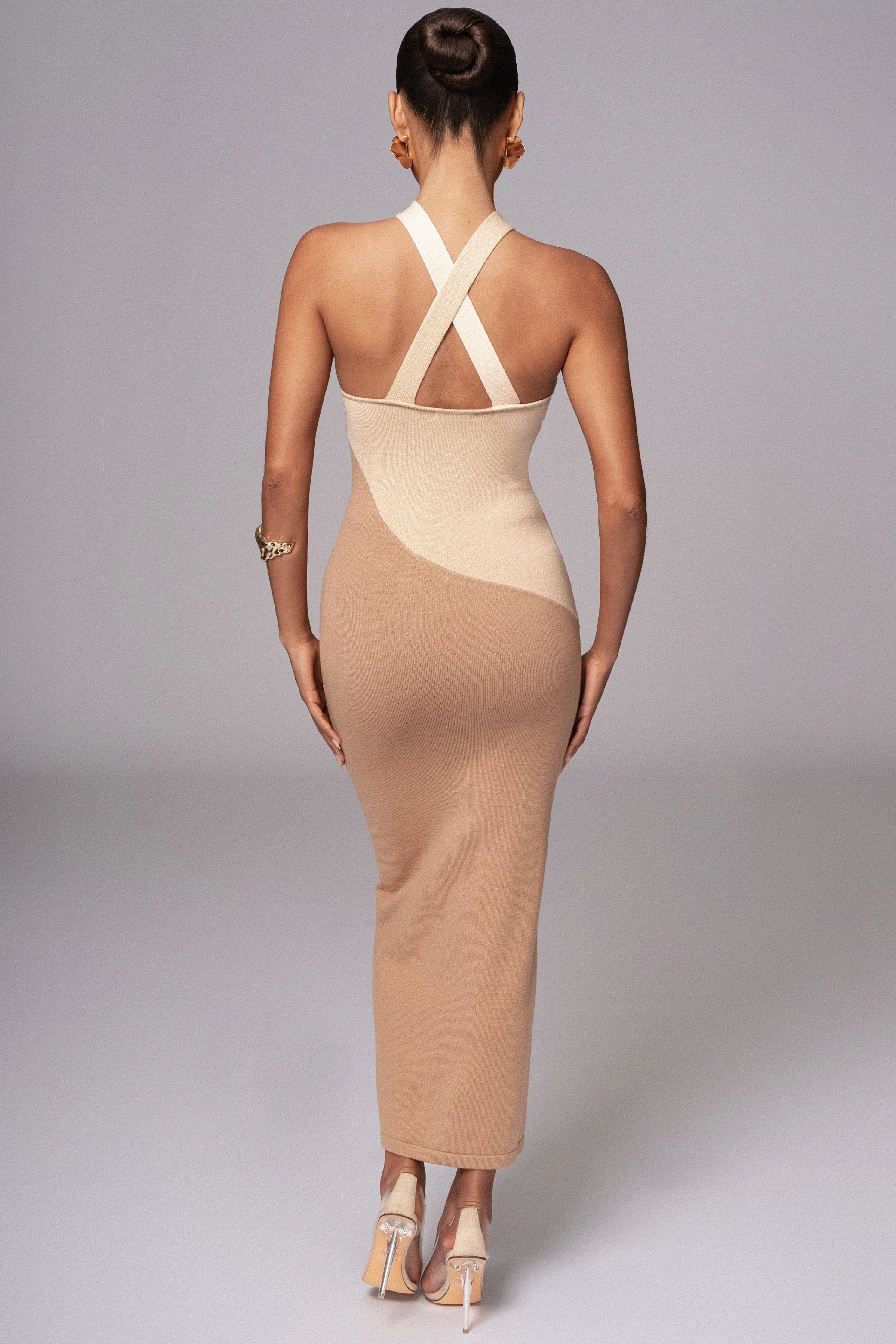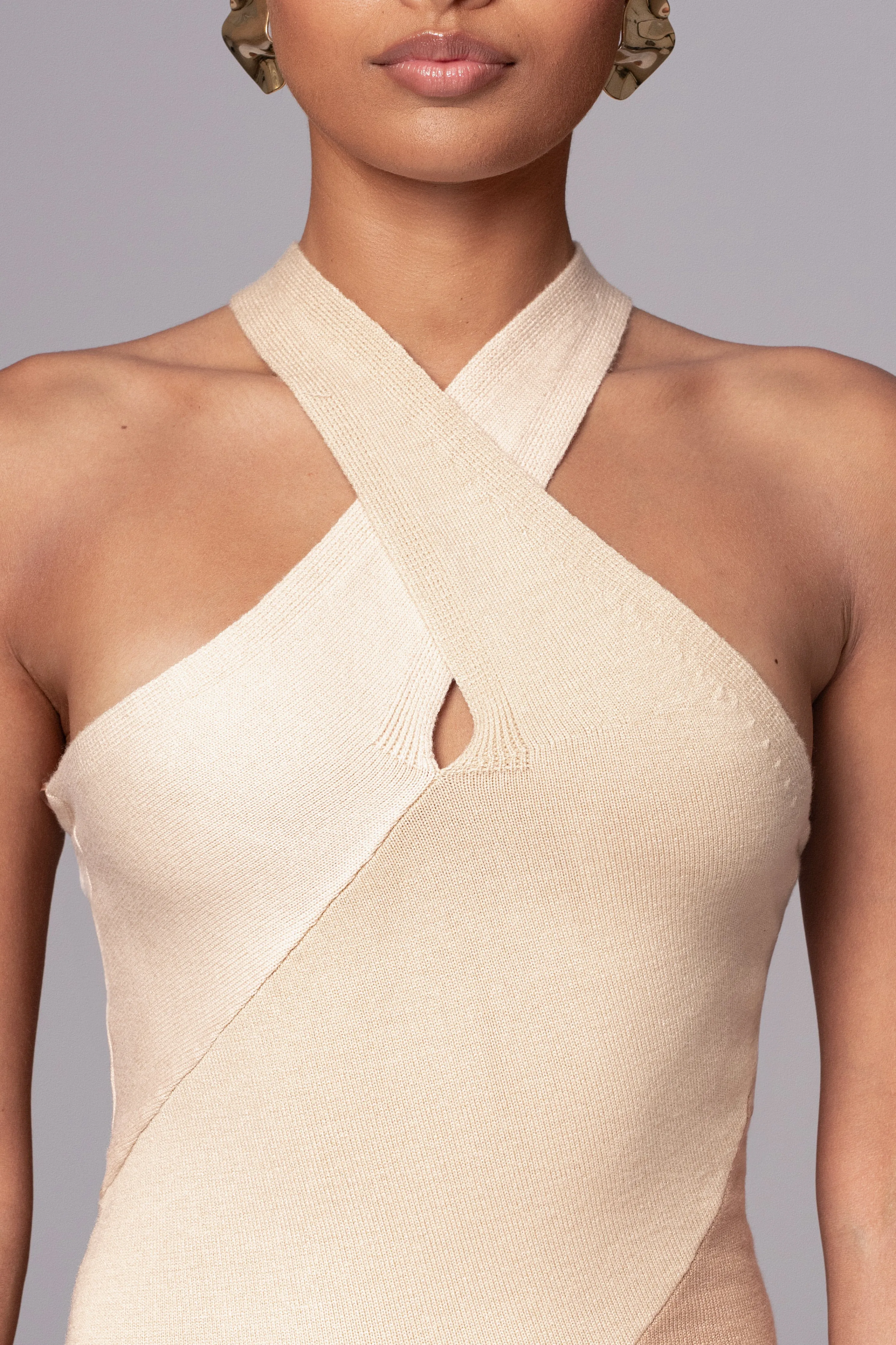 Embrace the perfect blend of sophistication and style with our Beige Steph Halter Dress. This stunning halter dress features a crossover design with a center keyhole, elegantly accentuating your figure with its fitted silhouette and midi-length hem. Crafted from a single-lined knit fabric in shades of beige and soft brown, this dress offers both comfort and style. Stretchy.