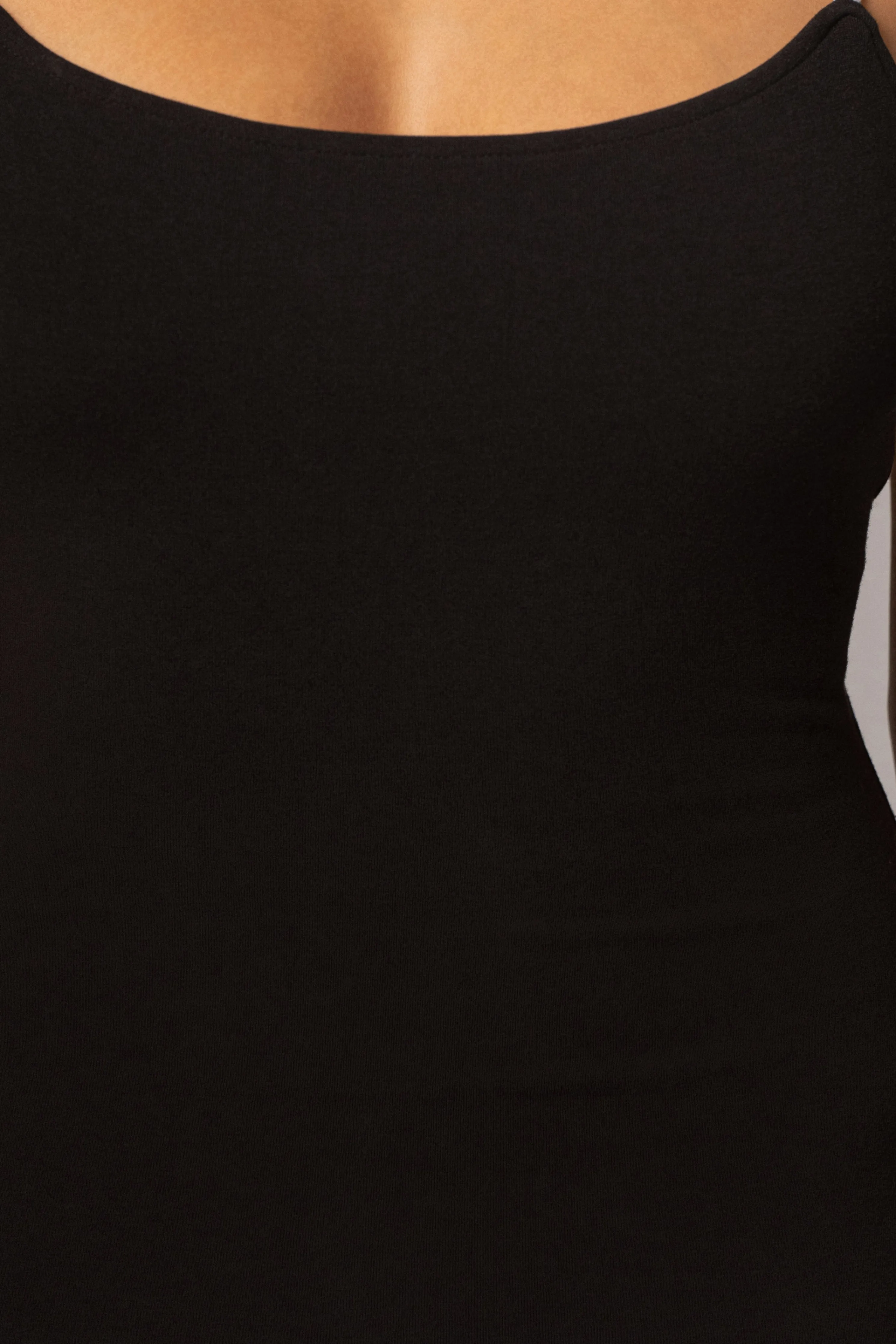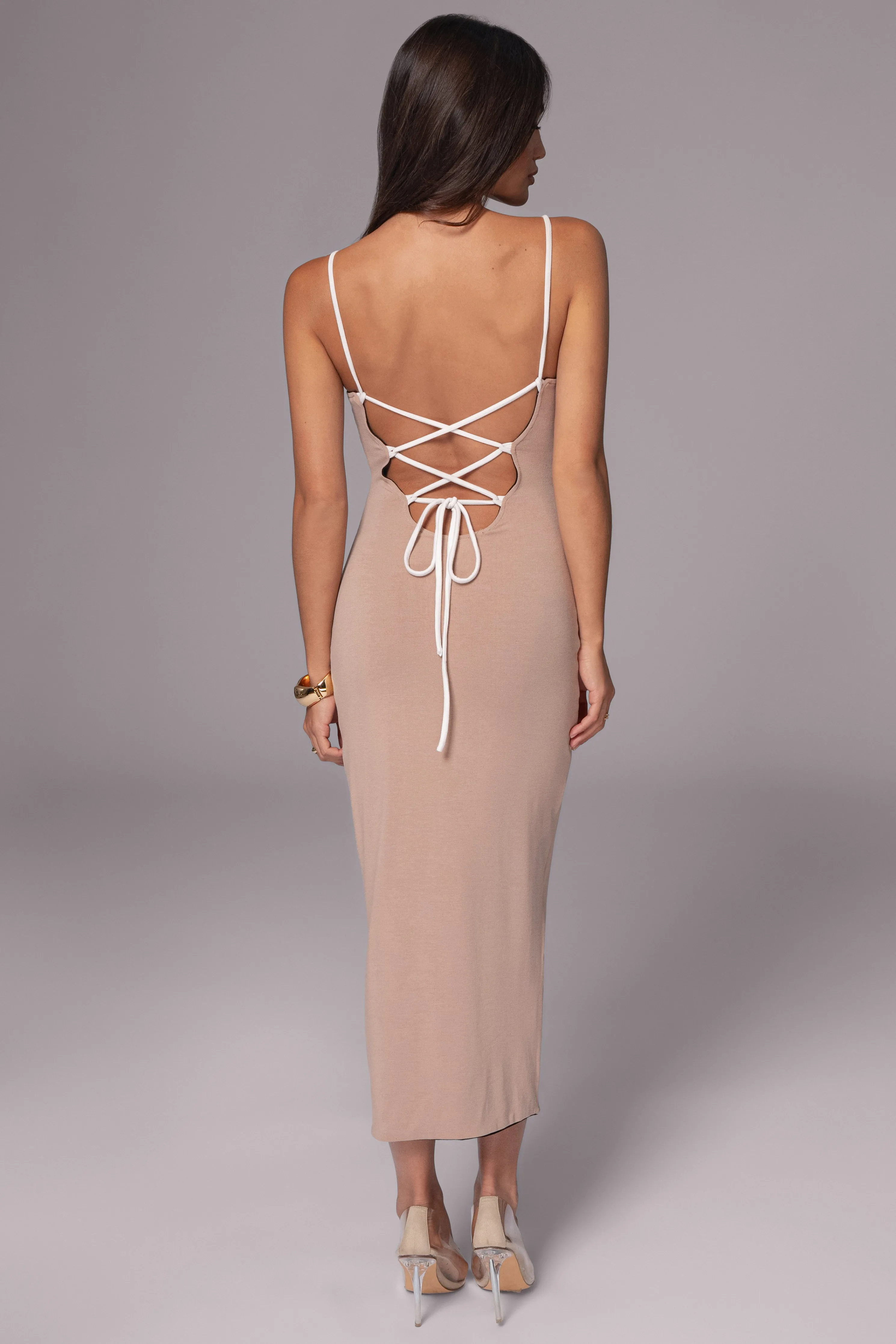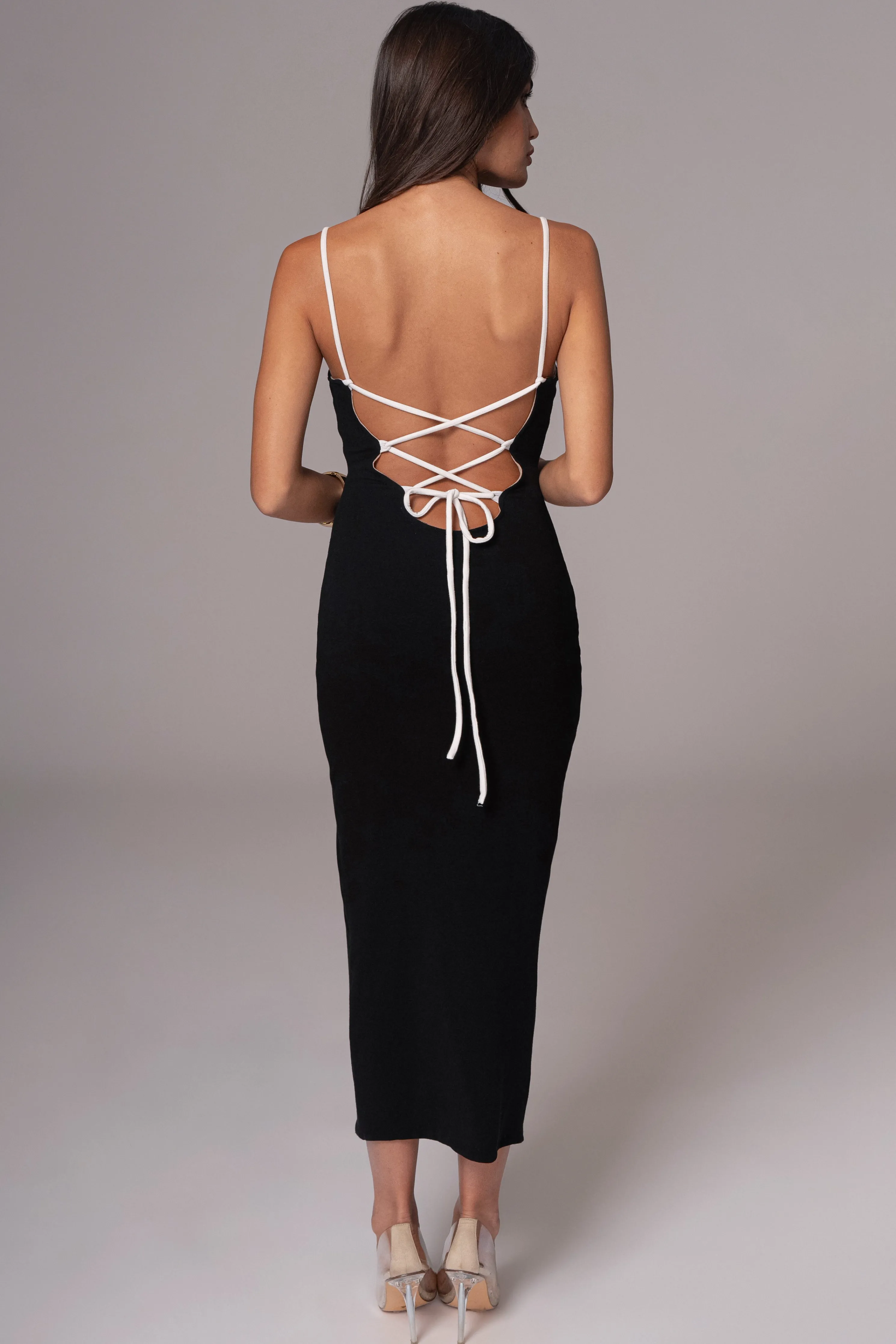 Unlock a world of style versatility with our Reversible Collection. Expand your wardrobe options with our new Black/Beige Katia Reversible Dress. Crafted from our ultra soft basics material, this versatile maxi dress combines comfort with fashion. Featuring a scoop neckline, ivory contrast trim, and lace-up back closures, it exudes elegance from every angle. Reverse the dress to showcase a gorgeous new color on the other side. Stretchy.