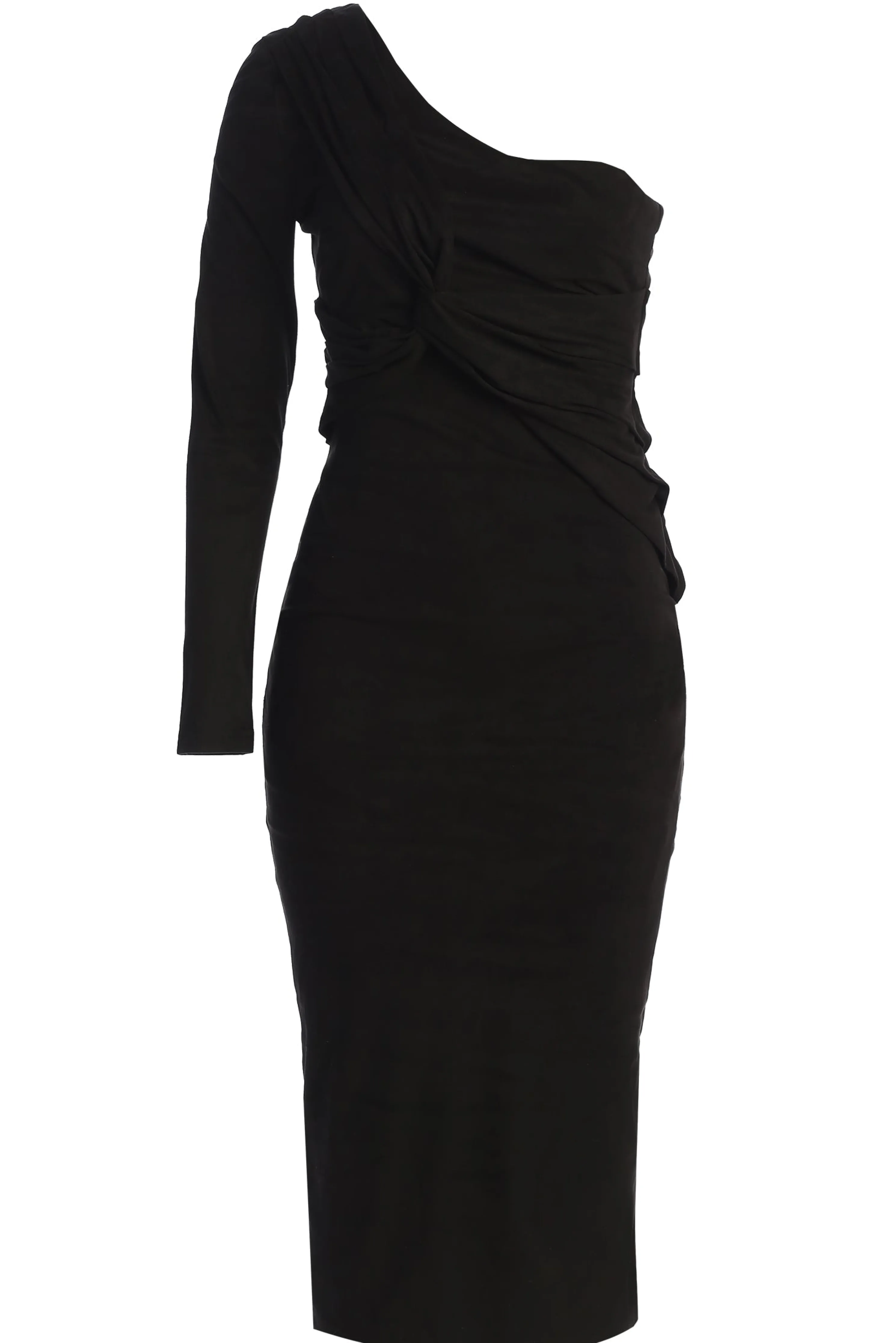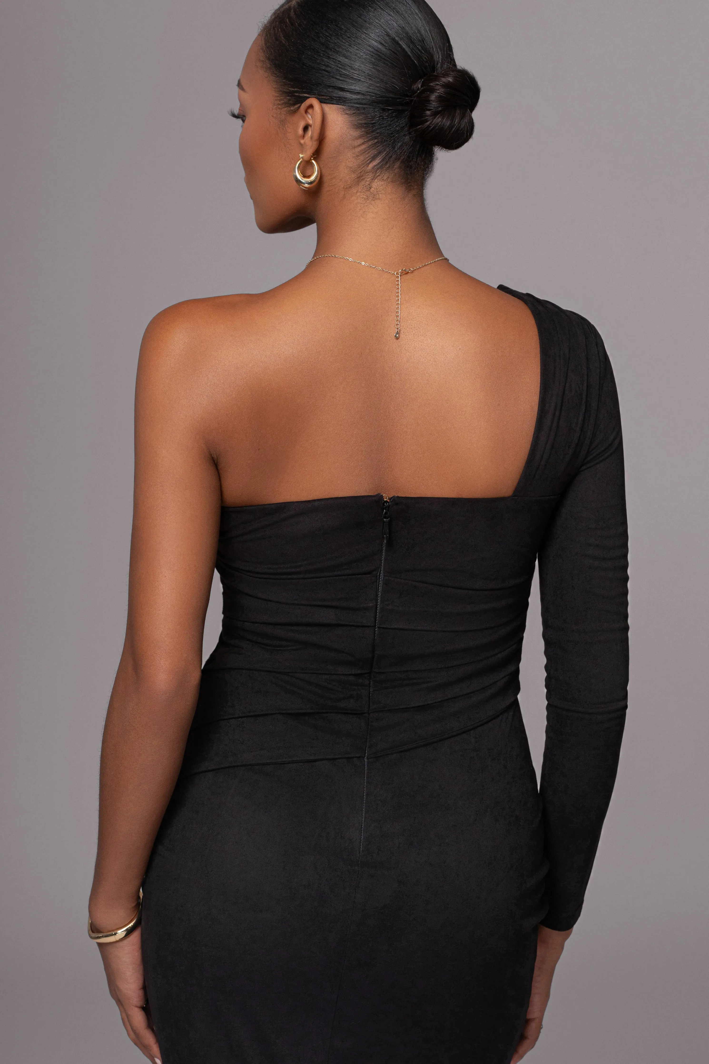 Embrace winter sophistication with our Black Dayanna Suede Midi Dress. This midi dress showcases an elegant ruched layer with stylish shirring for a touch of texture. Crafted from a smooth suede fabric with interior lining for extra comfort. Complete with a back slit hem and a concealed zipper closure No stretch.