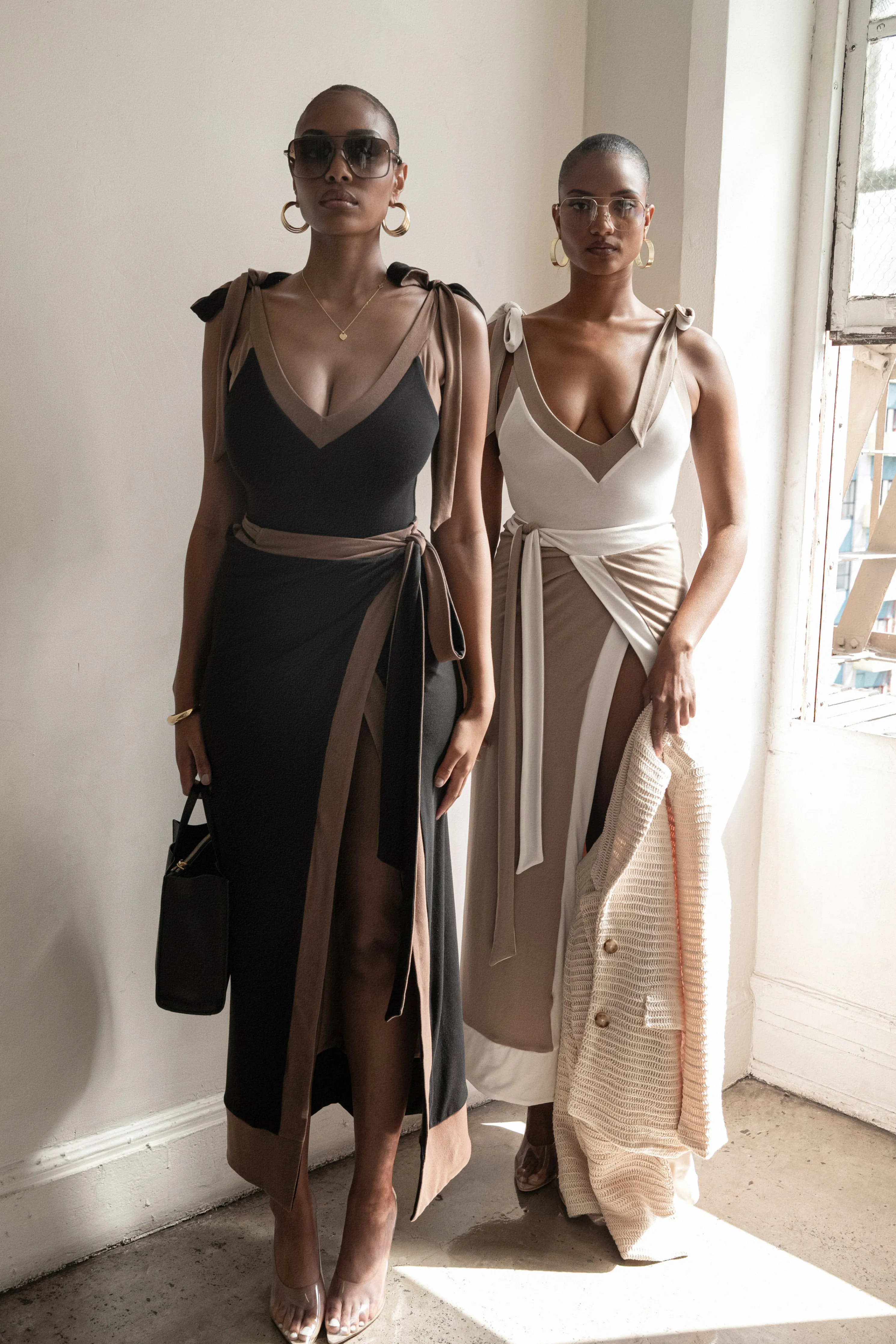 Unlock a world of style & versatility with our Reversible Collection. Introducing our favorite set this season, the Black/Pecan Contrast Kamie Reversible Skirt Set. This reversible skirt set features a fully lined bodysuit with plunging v-neck, bow-tie shoulder straps, and a thong back cut. The matching skirt features a sarong style design with side bow-tie closure and a maxi-length hem. Crafted in a smooth double-lined fabric, this set can be reversed to reveal a new look in a pecan and black shade. Stretchy. Sold as set.