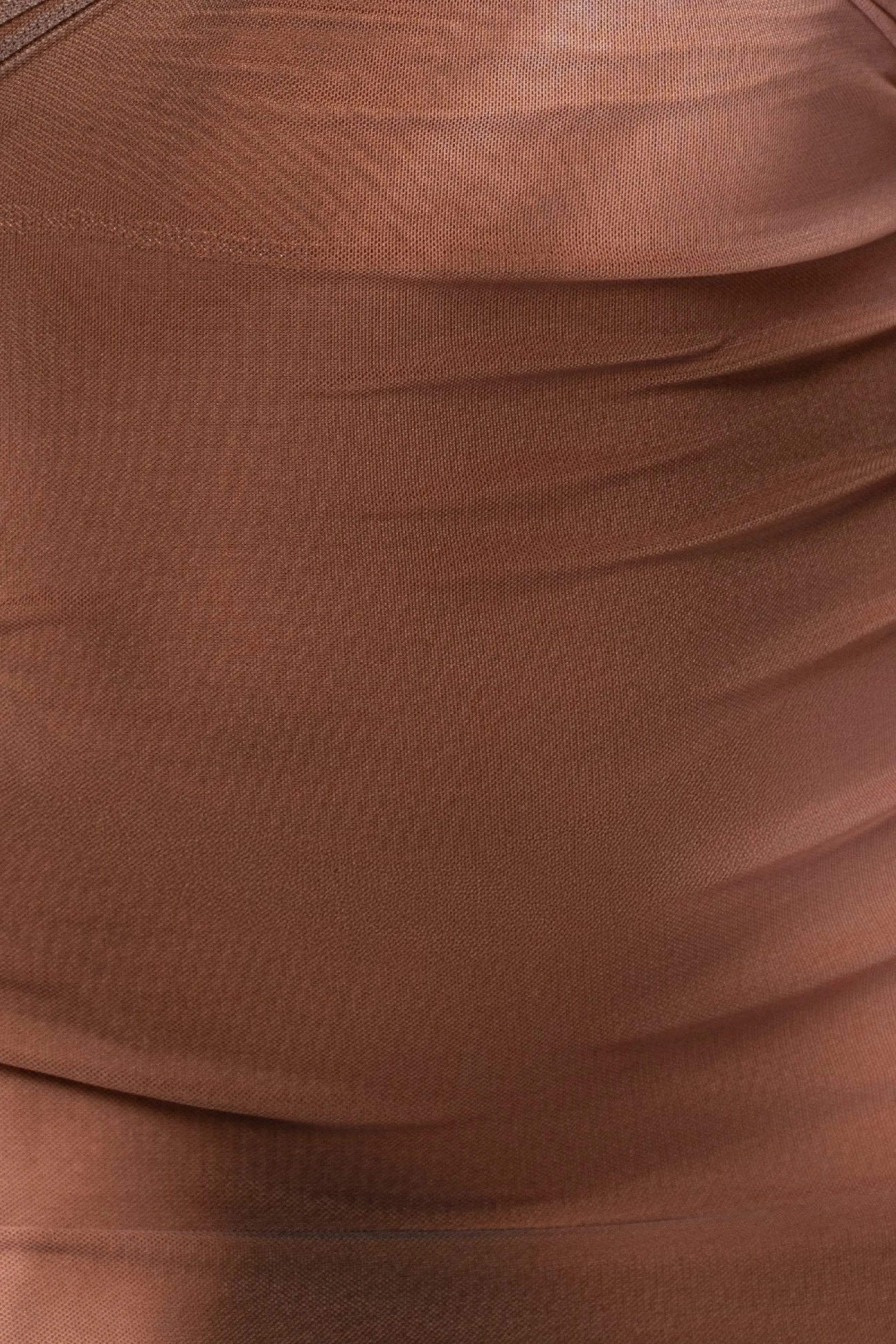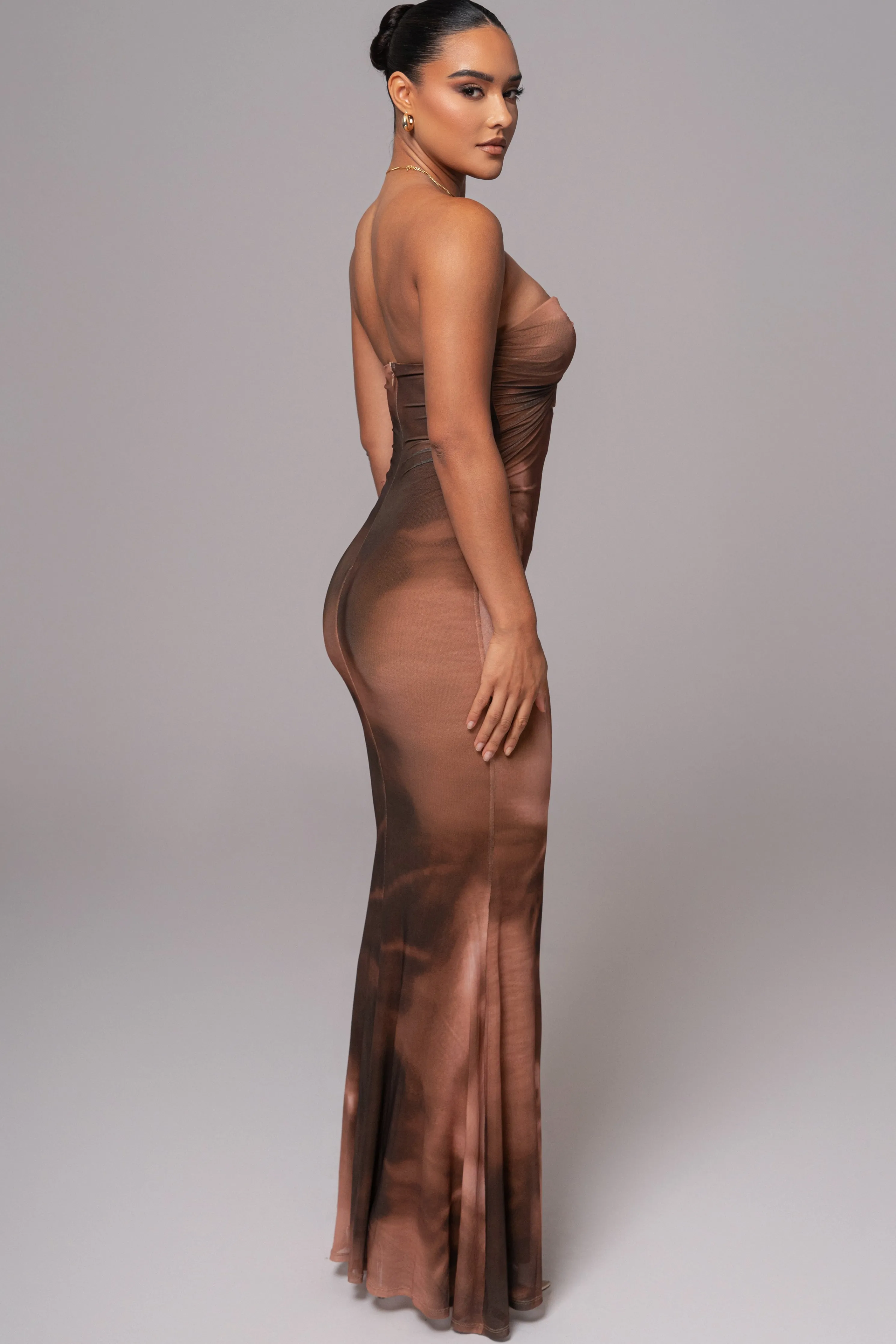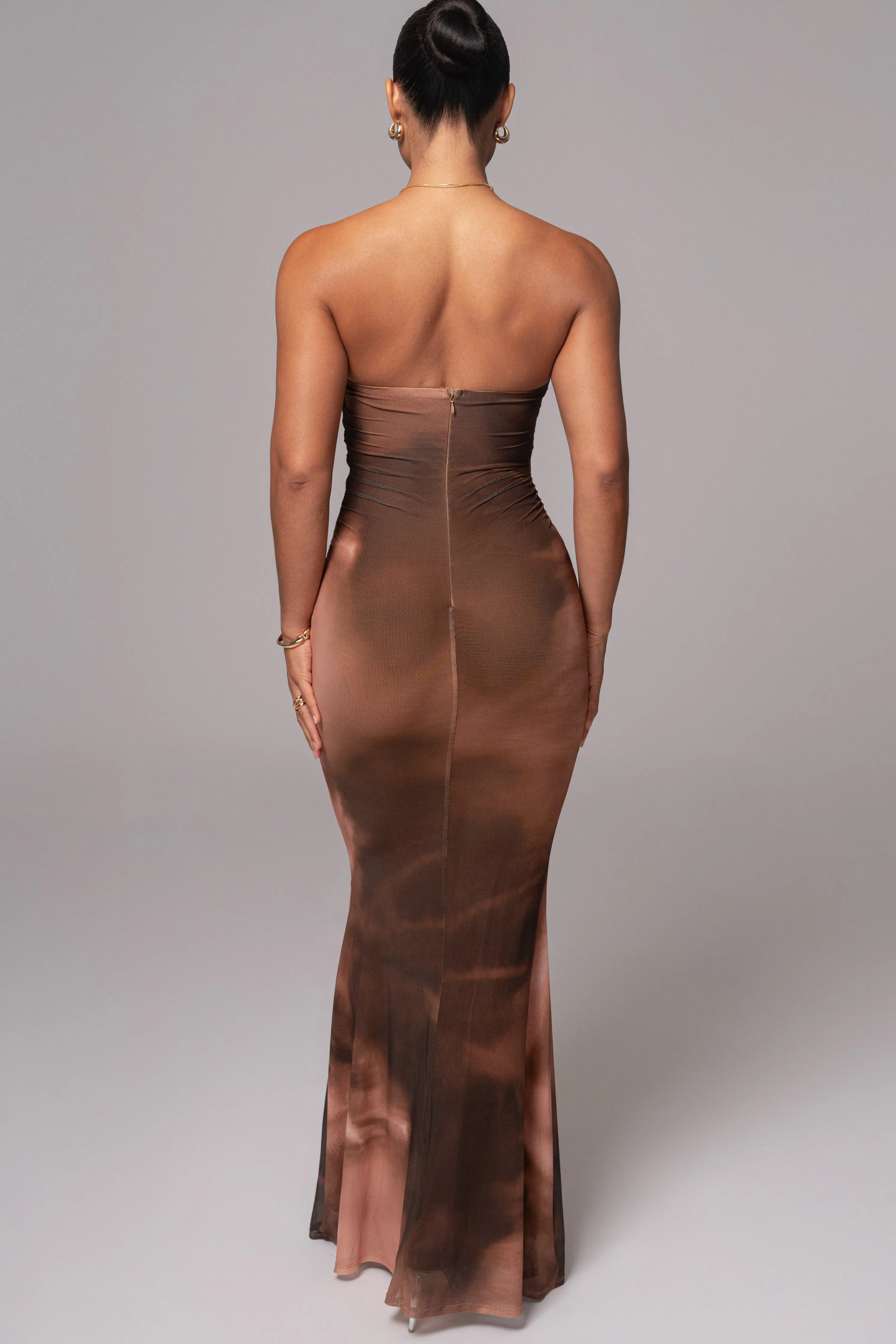 Bring on Maxi season with our Brown Abstract Bethany Strapless Maxi Dress. Featuring a sculptural neckline and ruching for a flattering fit, this maxi dress is designed with an elegant floral print that is perfect for the new season. Embrace the flow of the fitted silhouette and let the dreamy mermaid hem sweep you away. Complete with wired/padded cups, back zipper closure, and grip silicone at the bust for a secure hold. Double-lined. Stretchy.