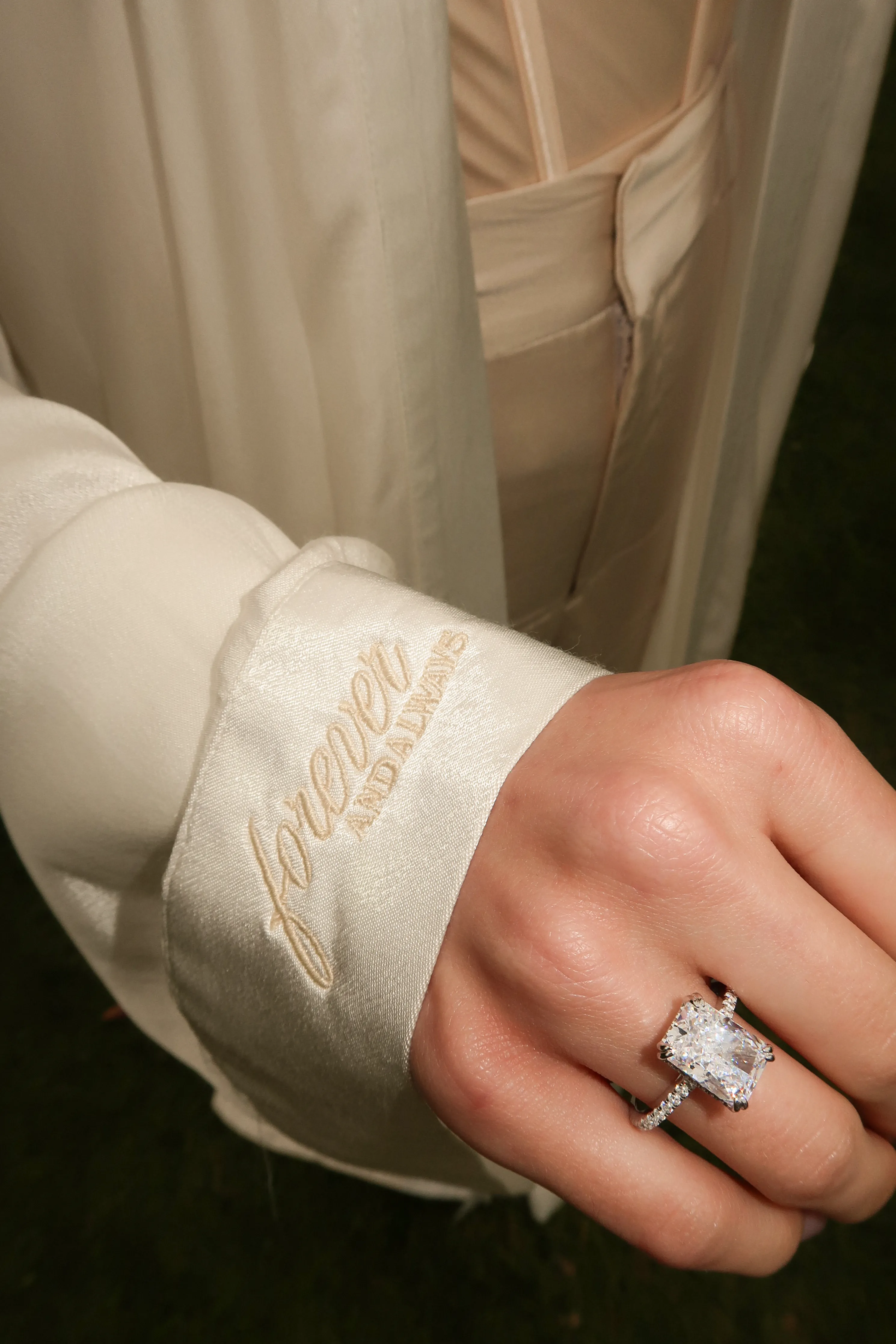 Designed for the JLUXLABEL Bridal Collection. Feel like you’re dreaming with the Champagne Forever And Always Satin Robe, now offering custom embroidery for an unforgettable personal touch. Prepare for your big day in style with this sleek satin robe, featuring a collarless neckline, drop shoulders, and relaxed three-quarter sleeves. Complete with an open-front design, welt pockets, belt loops, and a matching sash tie. Pair with our Amour Satin Top and Ever After Satin Trousers for the full look. Single-lined with no stretch.