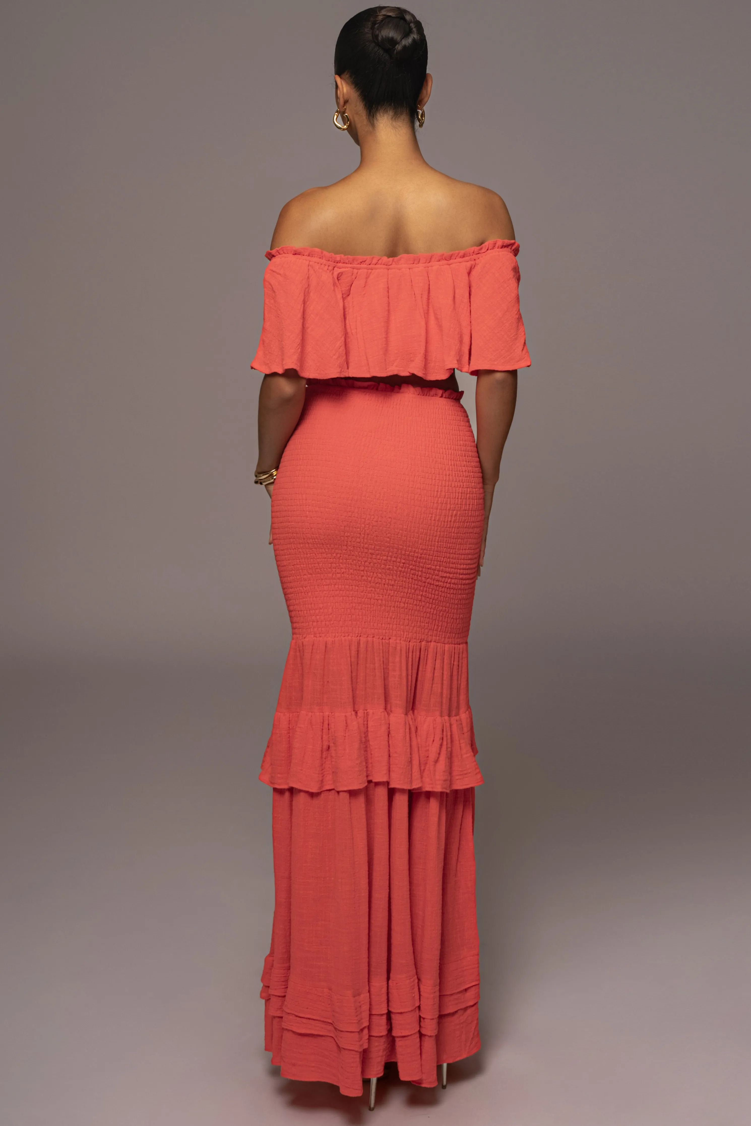 The perfect vacation look starts in our Coral Sienna Ruffled Skirt Set. This beautiful two piece skirt set is designed with lightweight Cotton fabric for a breathable feel. Featuring a sweet ruffle top with off the shoulder neckline and a cropped hem. Complete with interior lining and elastic hem for extra stretch. The matching maxi skirt features a flattering smocked design leading to ruffled tiers that complete the look. Stretchy. Sold as set.