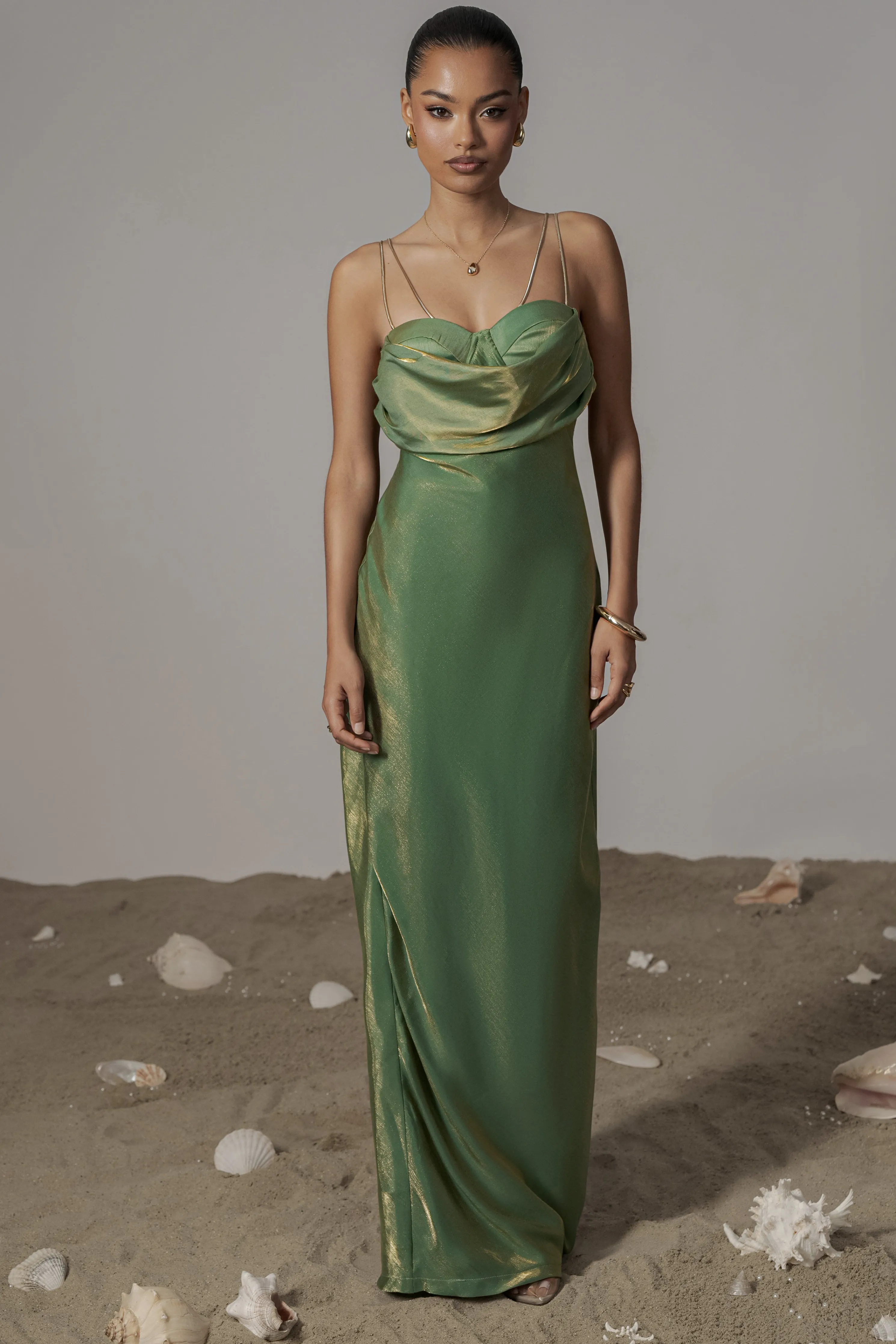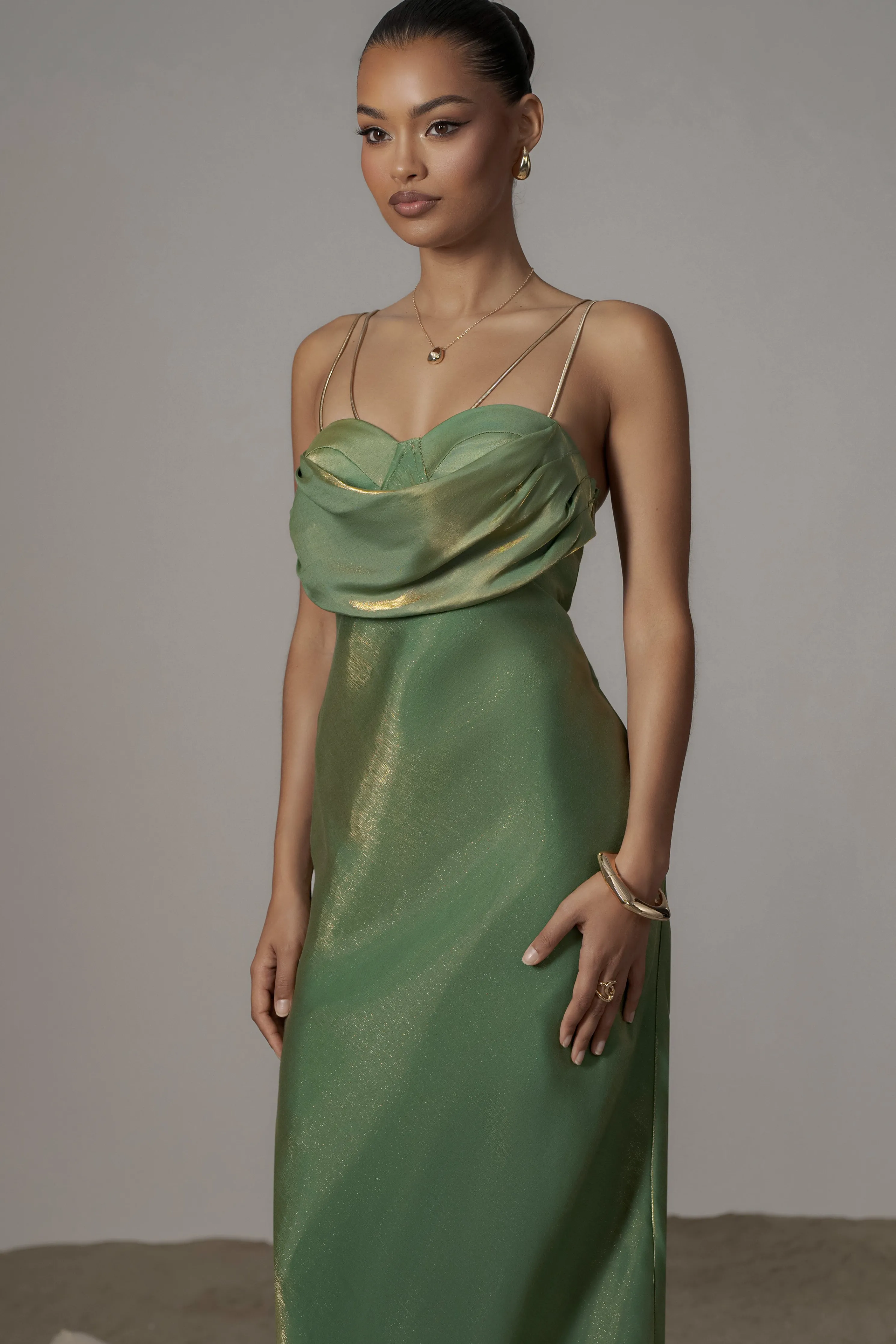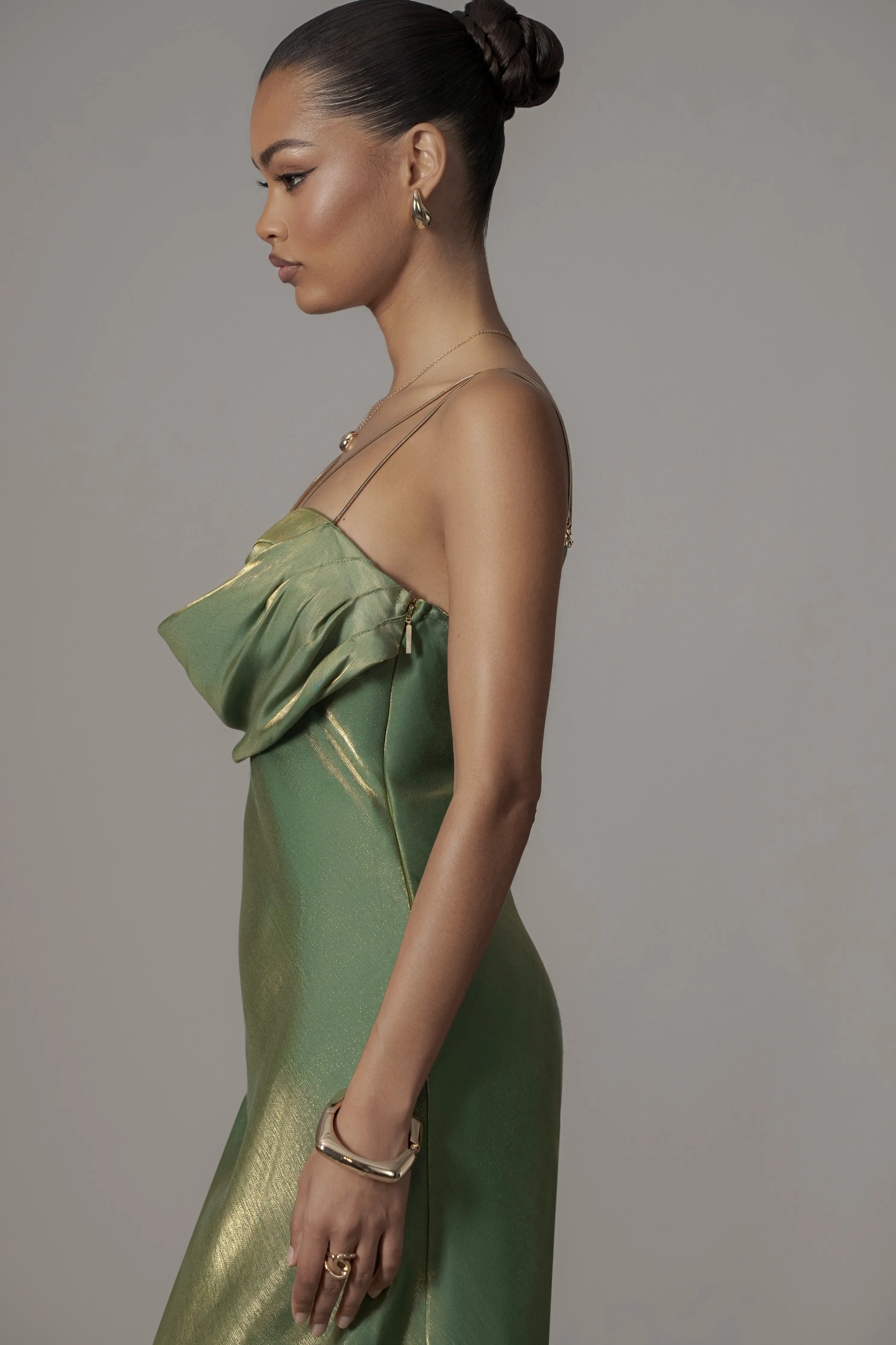 Our Green Iridescent Visions Of You Midi Dress is a statement on its own. We’ve taken one of our most loved designs and reimagined it in radiant iridescent fabric, elevating its allure. Featuring a sweetheart neckline with cowl detail, padded/wired cup support, and elegant gold-tone straps that can be removed for an optional strapless look. Side zipper with slit hem. Double lined. Minimal stretch.