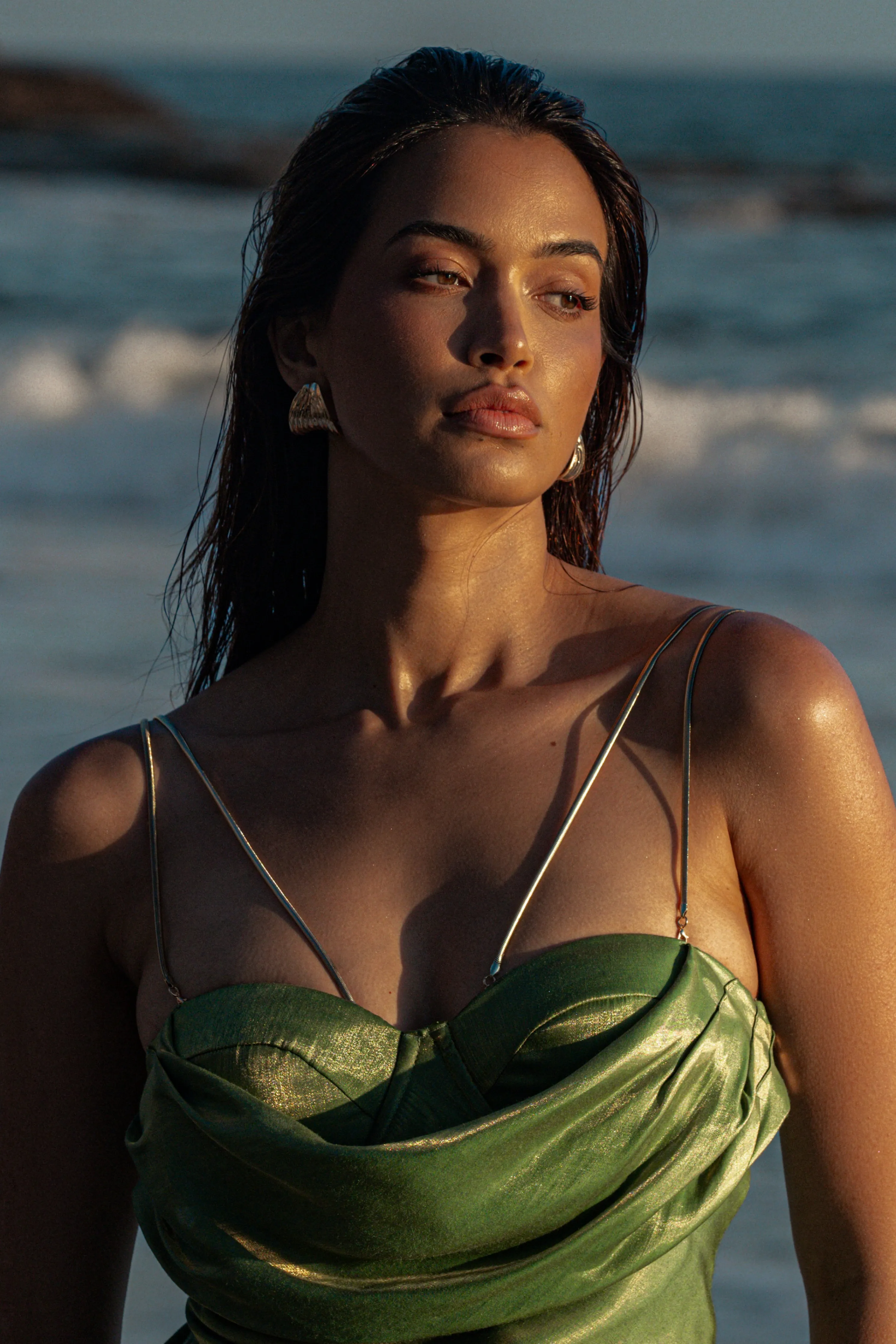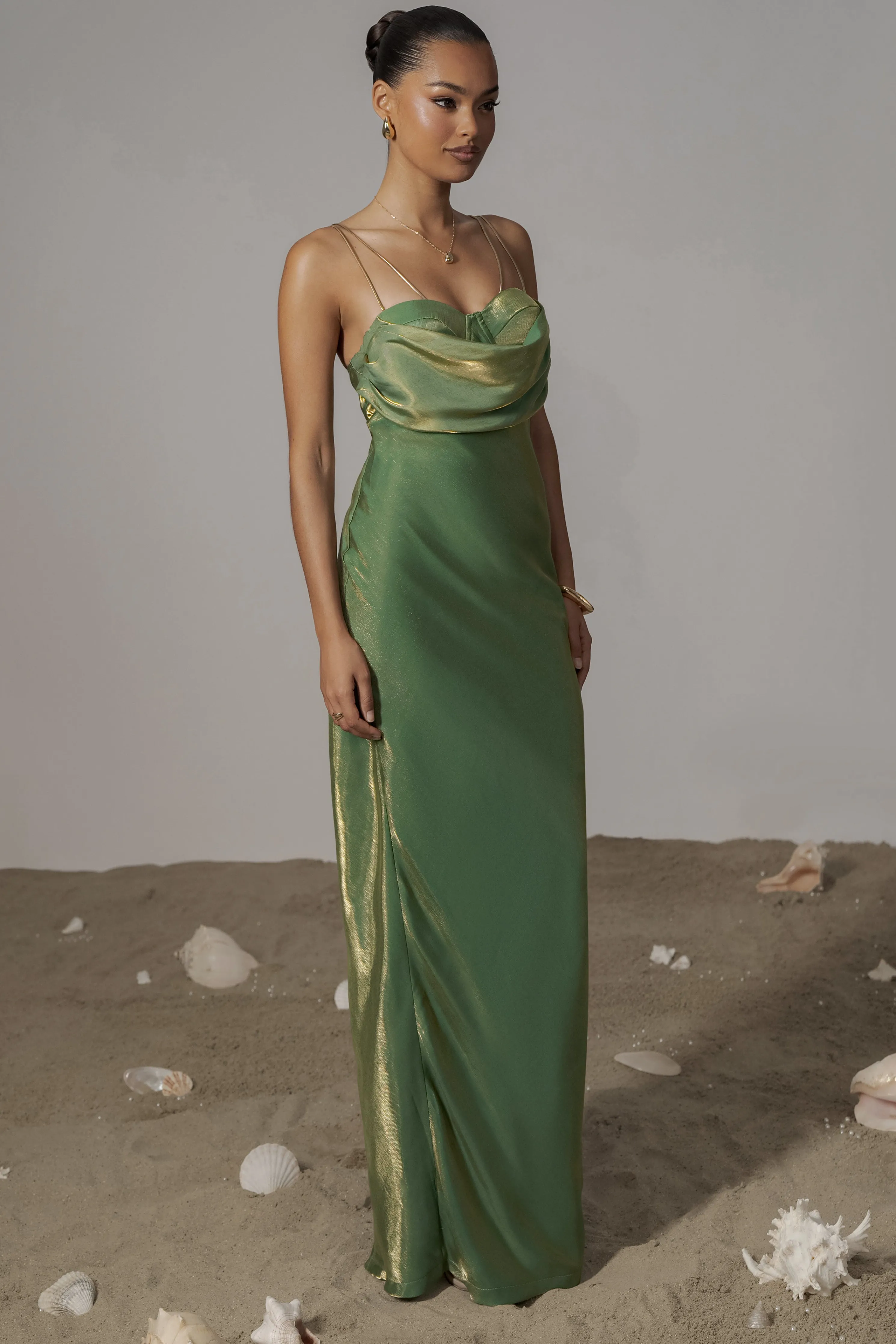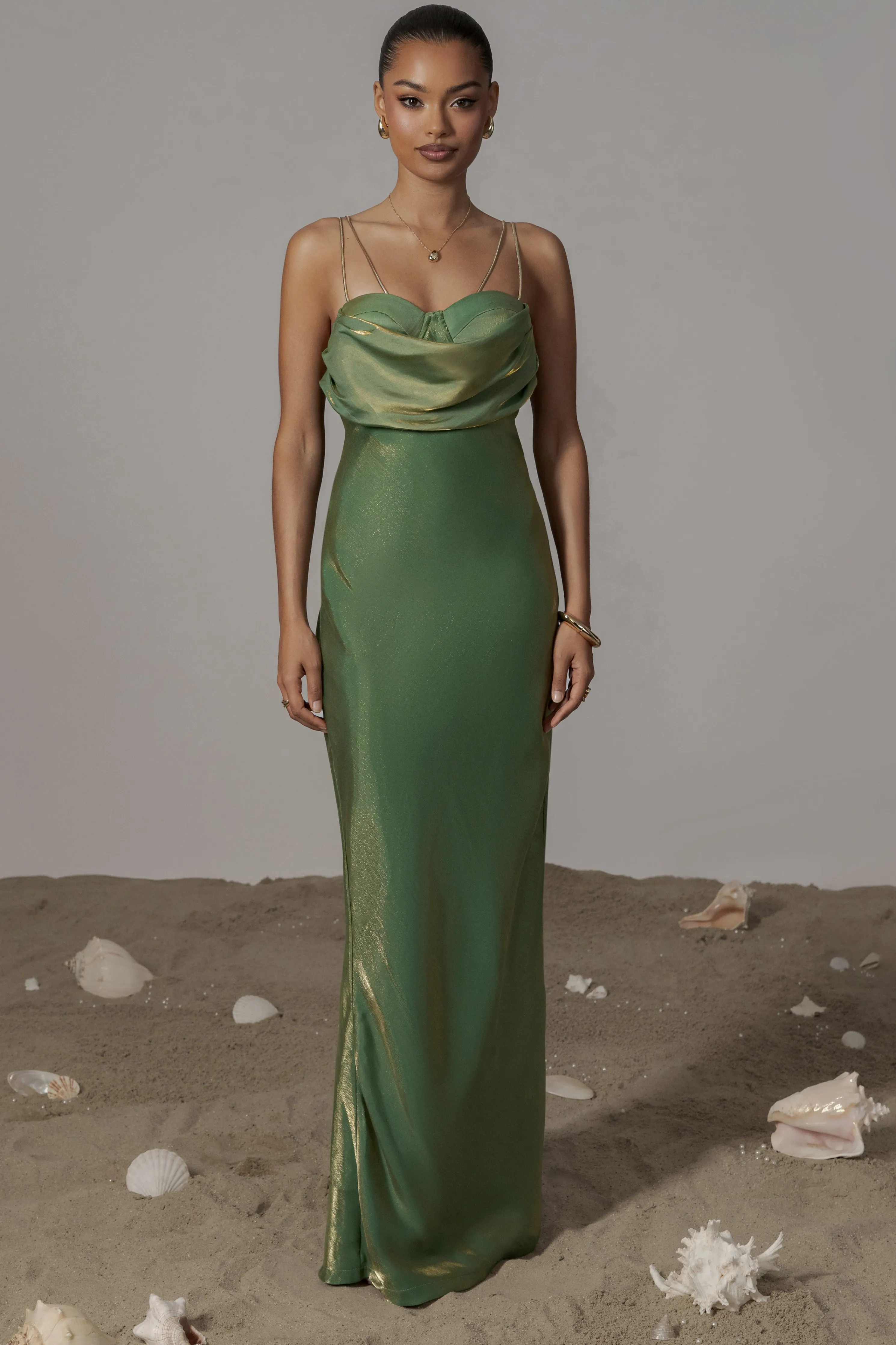Our Green Iridescent Visions Of You Midi Dress is a statement on its own. We’ve taken one of our most loved designs and reimagined it in radiant iridescent fabric, elevating its allure. Featuring a sweetheart neckline with cowl detail, padded/wired cup support, and elegant gold-tone straps that can be removed for an optional strapless look. Side zipper with slit hem. Double lined. Minimal stretch.