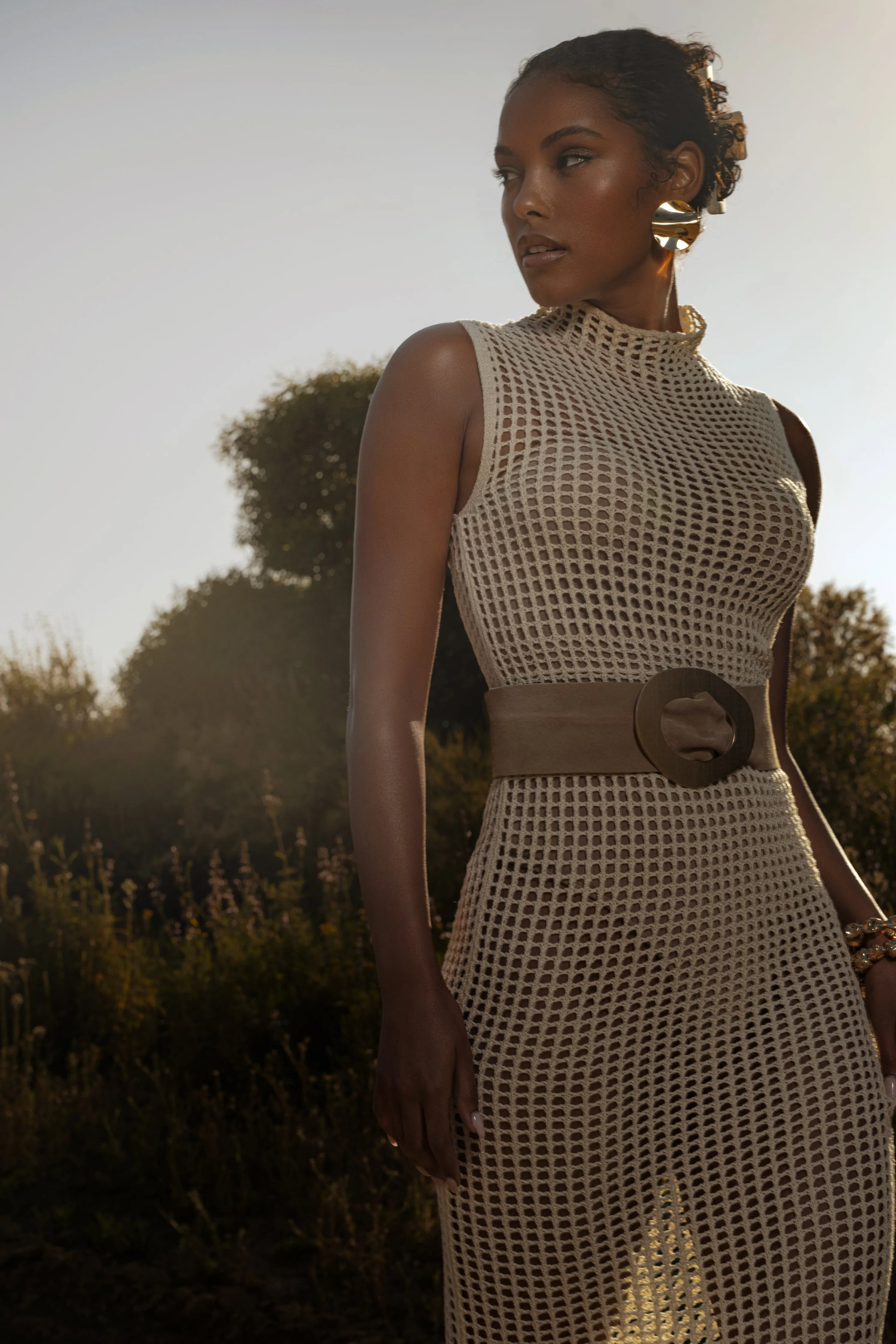 Introducing our Ivory Pacific Tides Crochet Maxi Dress, perfect for the summer season. This airy midi dress features a fitted silhouette with a mock neckline and sleeveless design. Pair with our Sascha Strapless Bodysuit and Capsule Belt for the full look. Medium stretch. Single lined.