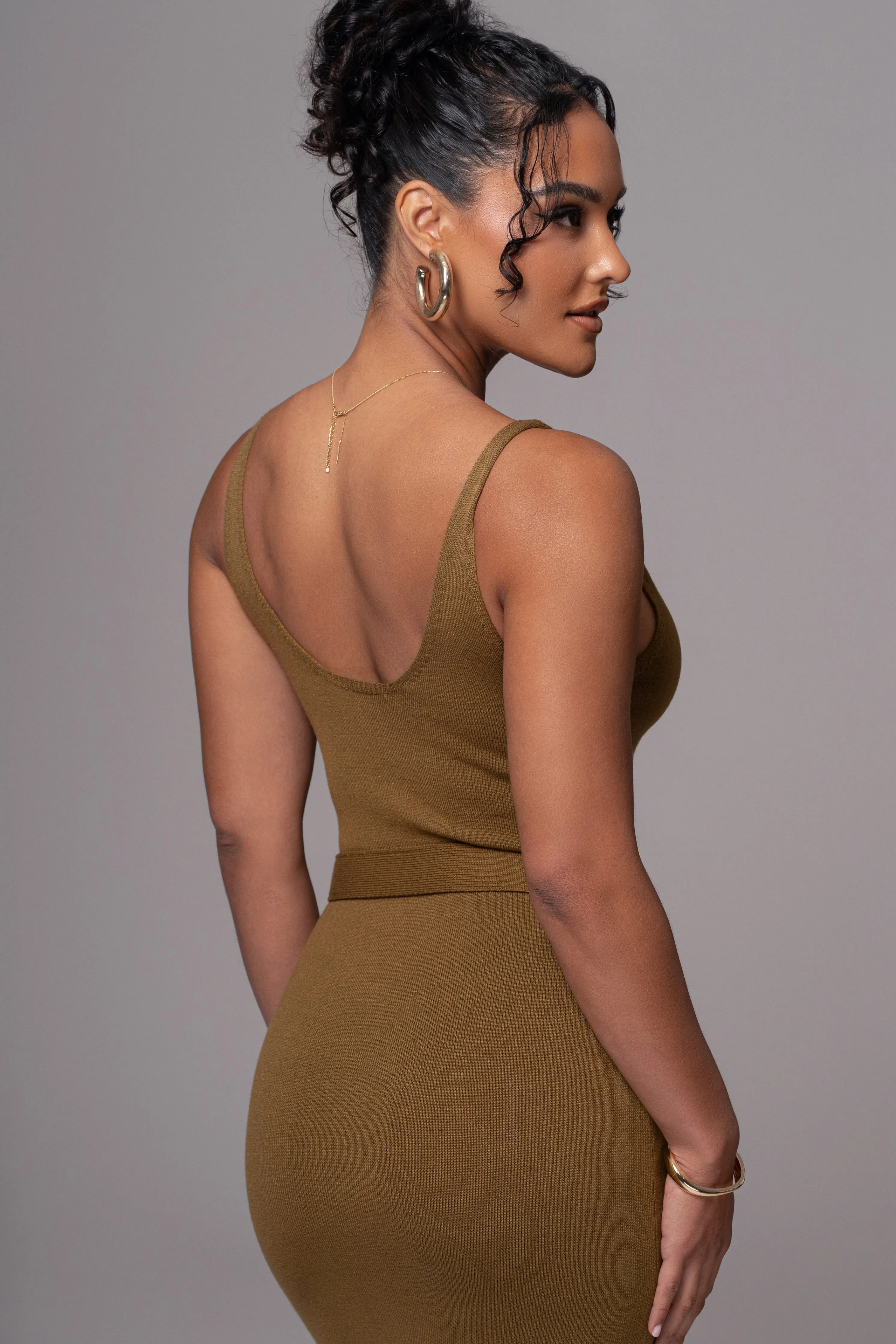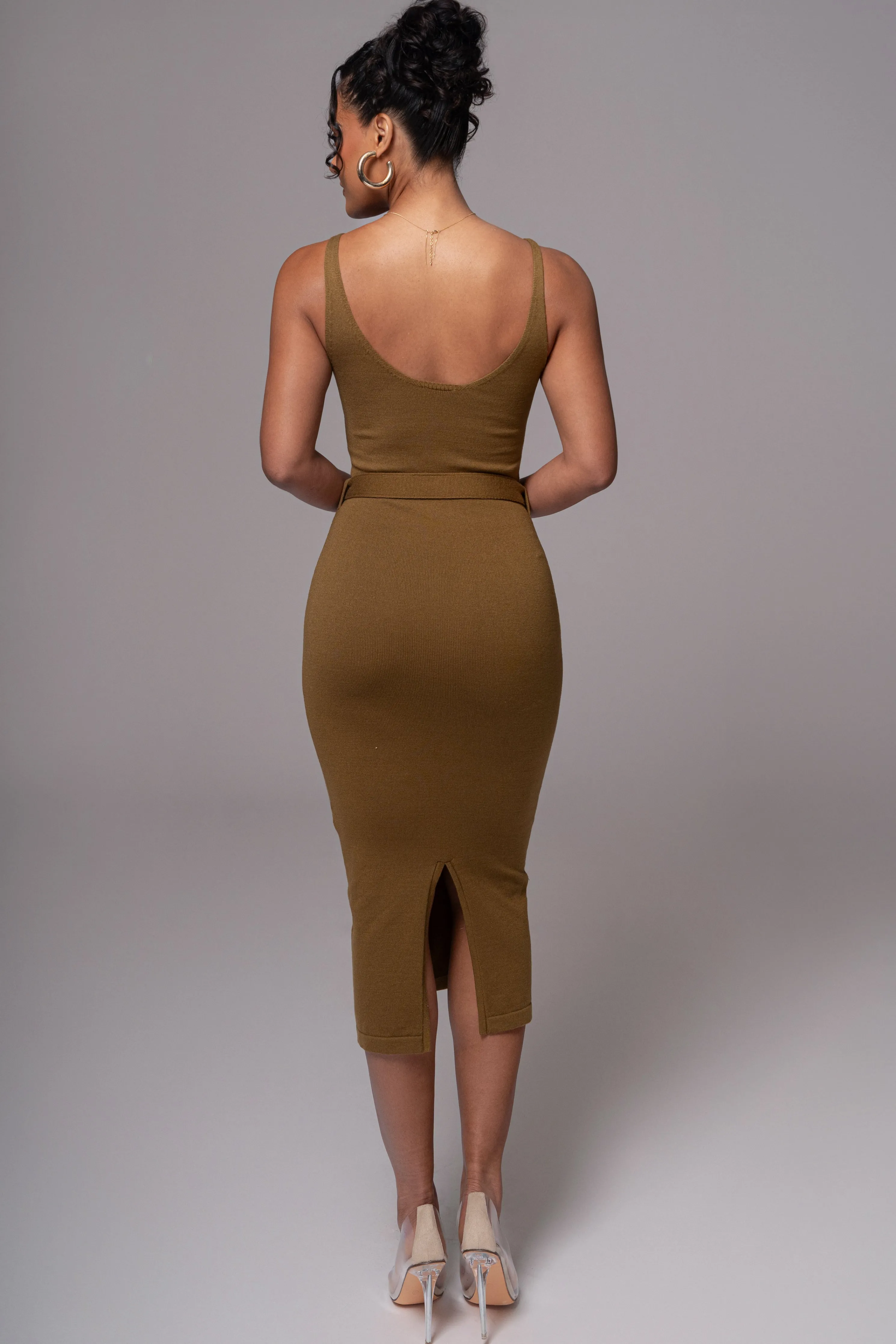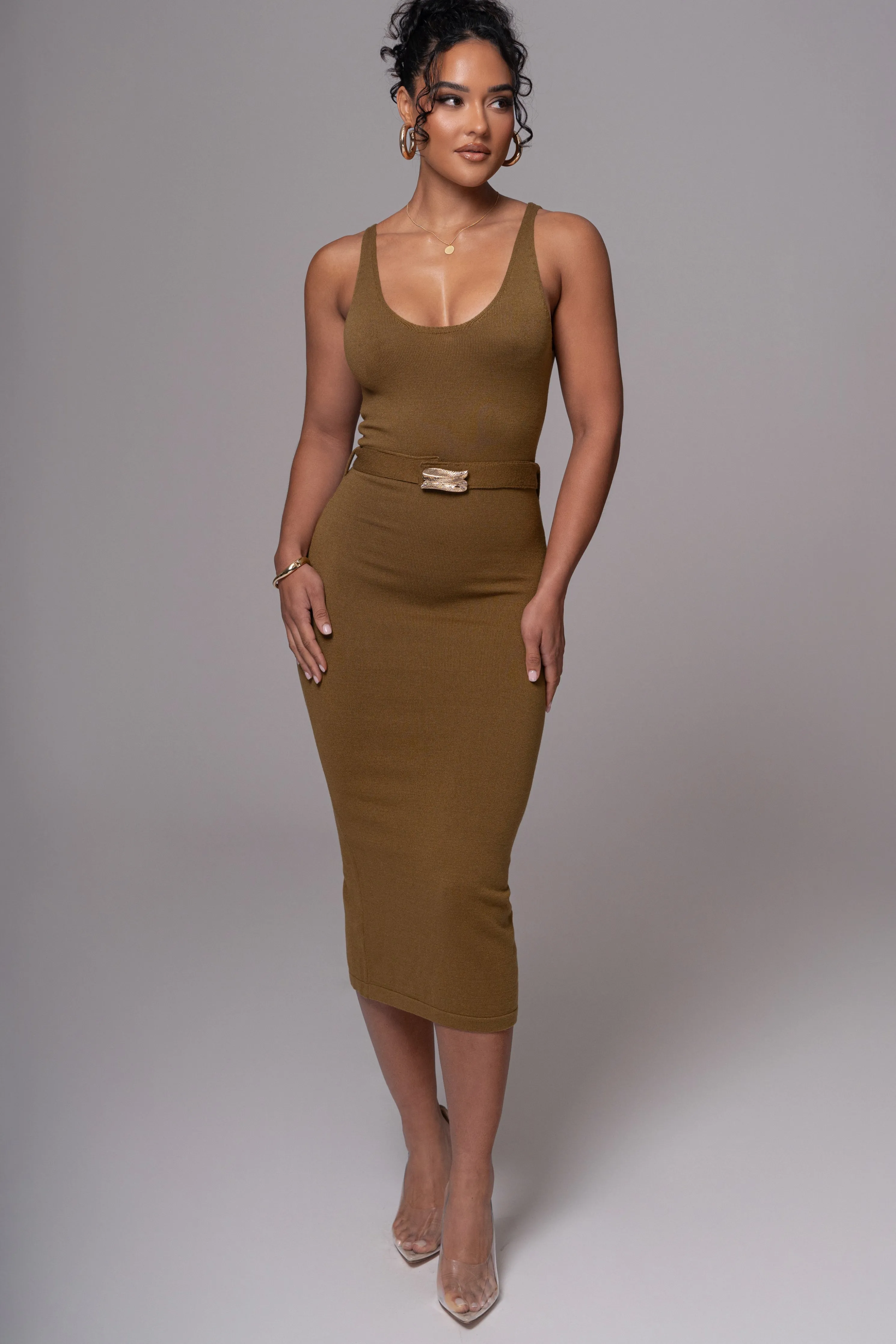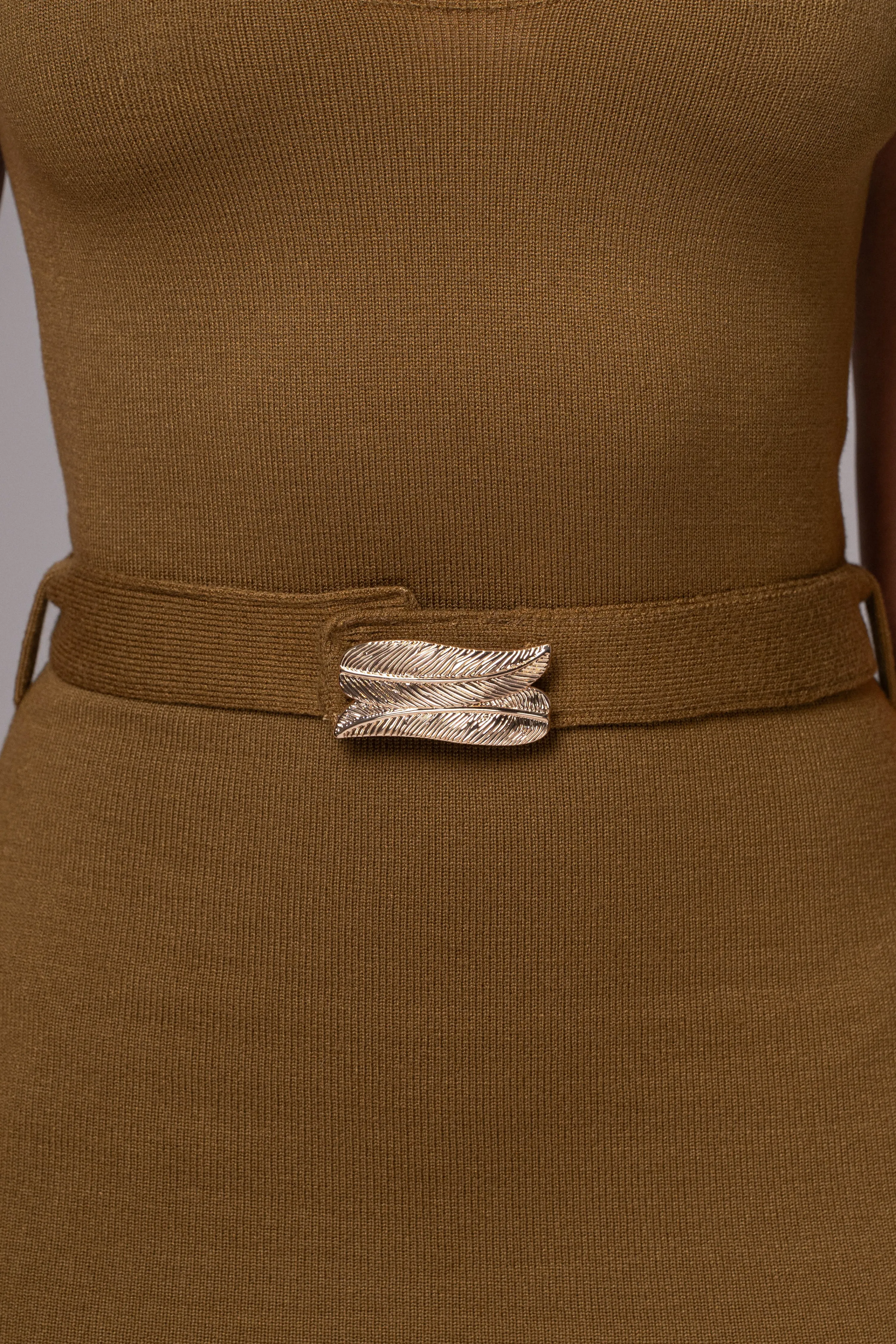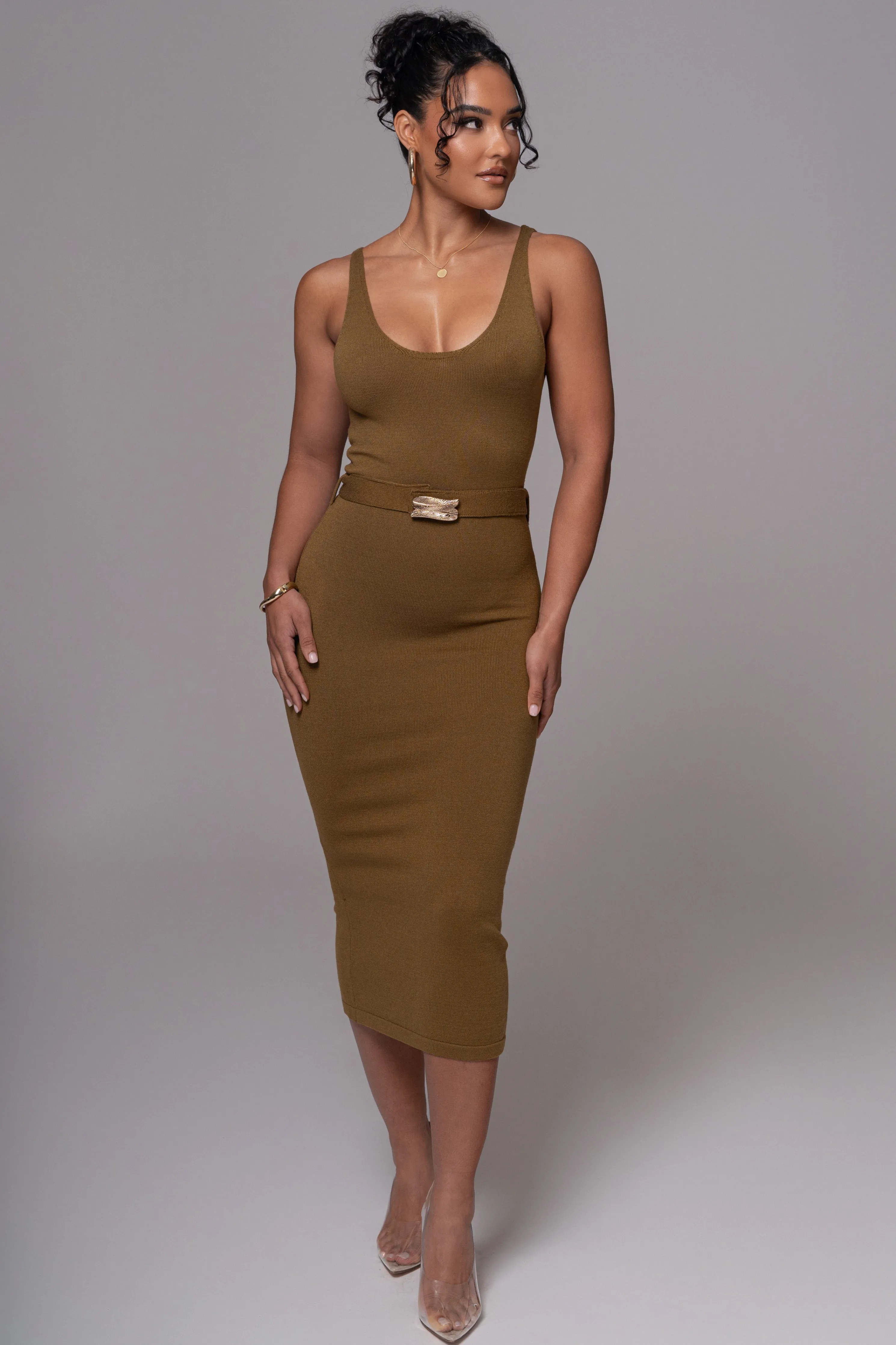 Our timeless original pieces reimagined for today in the JAIDE Collection. Discover the timeless allure of our Olive Belted Envy Midi Dress. This dress features a classic neckline and a fitted silhouette, accentuating your curves in all the right places. Complete with a luxurious leaf-adorned belt in a golden finish, this midi dress is both stylish and comfortable with its smooth knit fabric. Back slit hem. Single-lined. Stretchy.