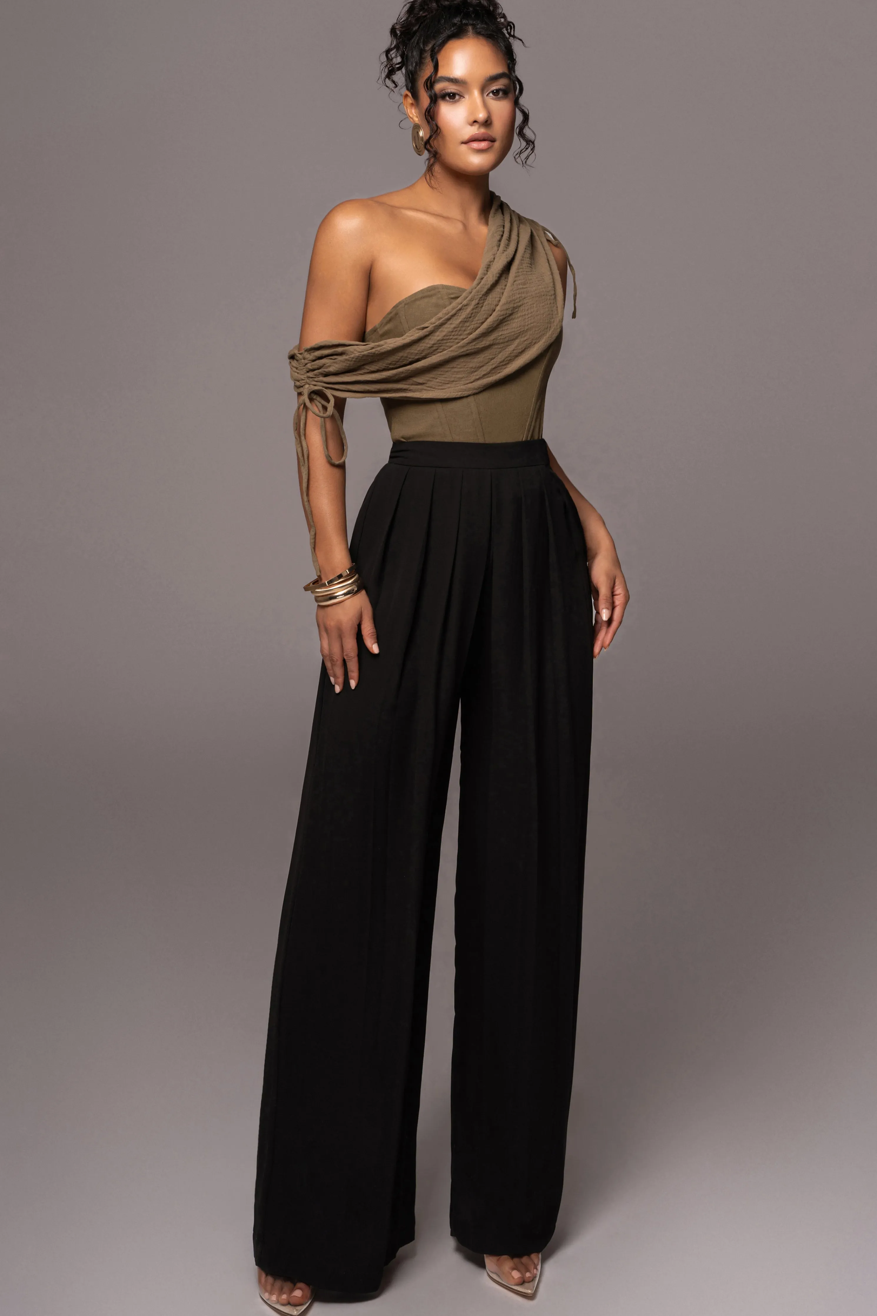 Liveeffortlessly elegant this summer in ourOliveNew Obsession Draped Top. Crafted from premium materials, this statement piece features a sweetheart neckline with one shoulder design detailing a graceful drape for an unmistakable touch of sophistication.The built-in corset and boning provide superior structure and a sensational fit. The draped piece is removable for 2 looks in one.Pair with our Josette Wide-Leg Pleated Pants for the full look. Side zipper closure. Lined interior. Minimal stretch.