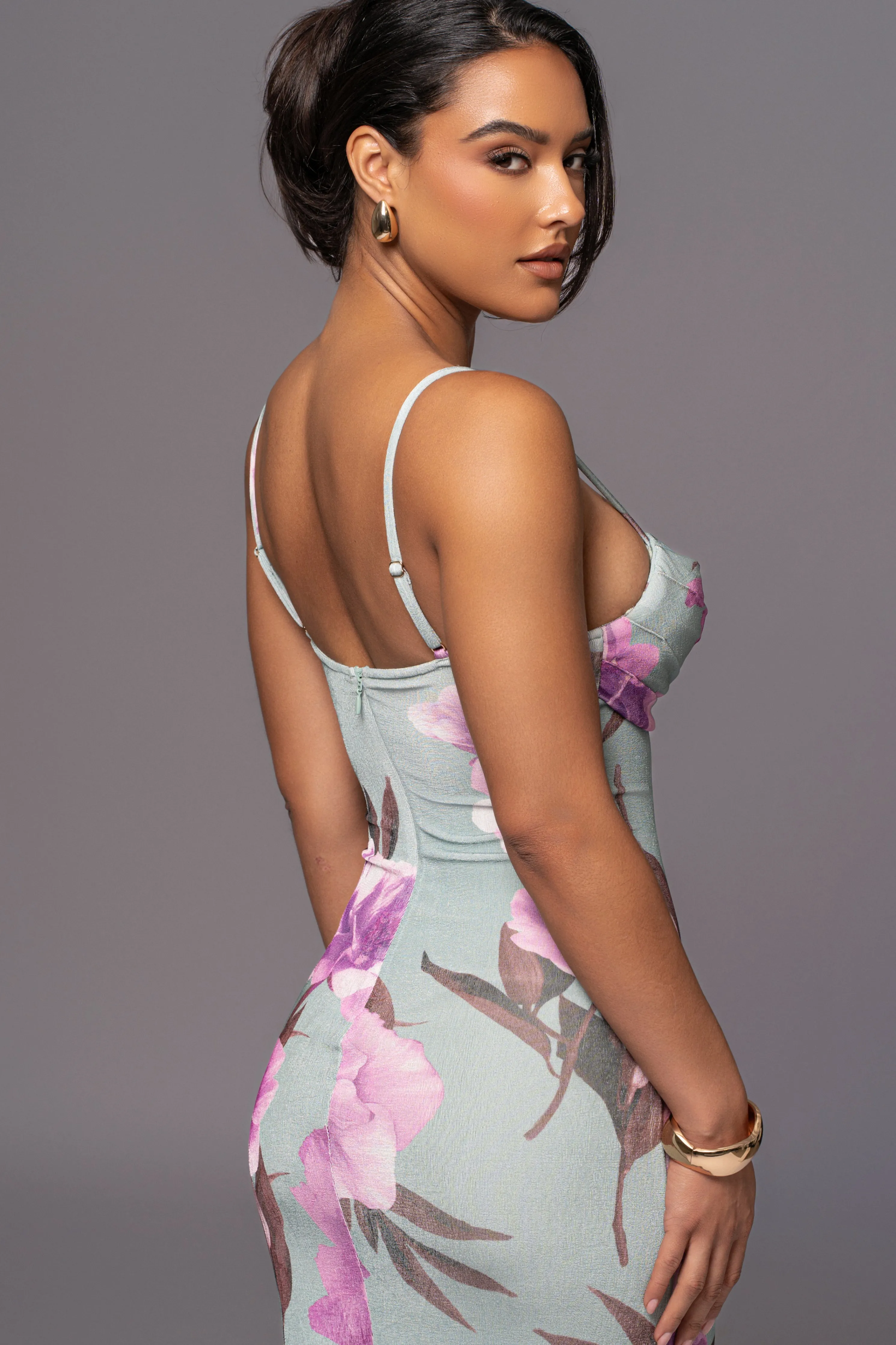 Our Sage Floral Slinky Visions Of You Maxi Dress is a statement on its own. We’ve taken one of our most loved designs and reimagined it in a dreamy floral print, elevating its allure. This maxi design is crafted in a double lined slinky fabric and features a cowl neckline with padded cup support and adjustable shoulder straps. Complete with a hidden back zipper for closure. Back slit hem. Stretchy.