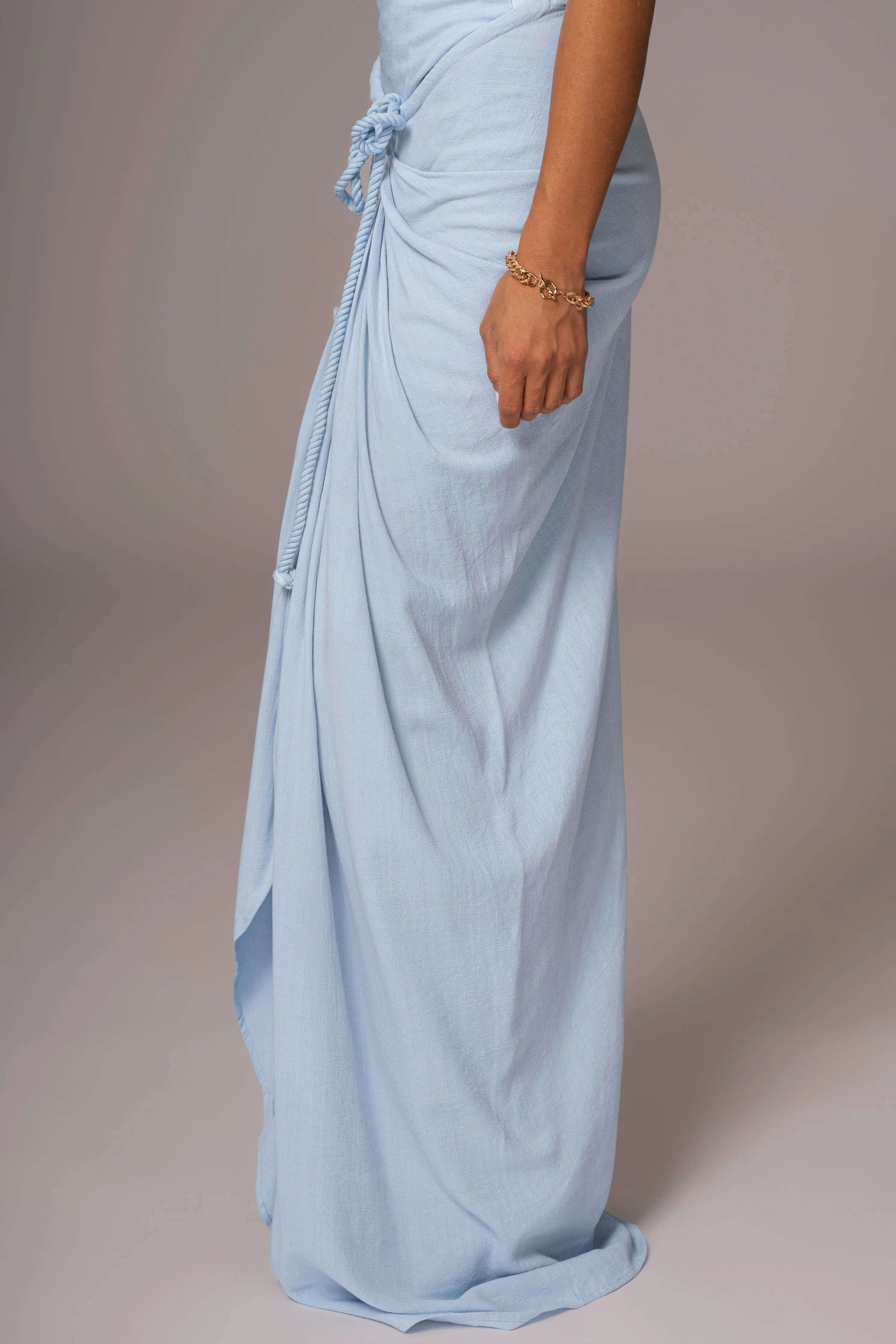 Draped to perfection proving life’s better in linen with our, Sky Blue Noelia Linen Slit Skirt. Crafted in a fresh linen material, this maxi skirt features a drape design with a stylish rope drawstring and a slit on the side. Hidden side zipper for closure. Pair with our FENIX LINEN CORSET for a full look. No stretch. Single lined.