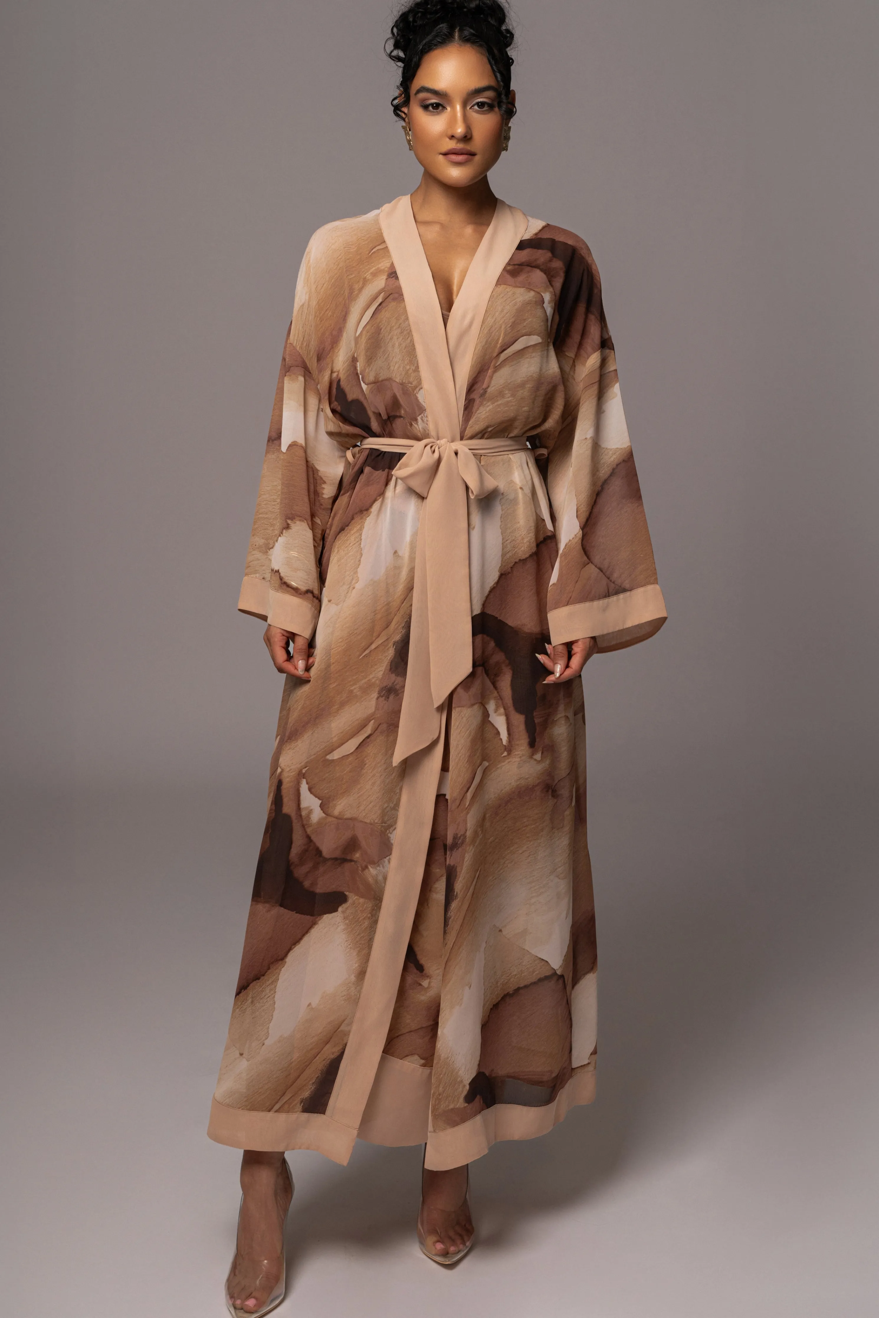 The Tan Alissa Printed Duster is your perfect companion for the beach and beyond. This resort-approved duster showcases an open-front design, functional side pockets, and belt loops with a matching sash tie. Crafted from lightweight chiffon fabric, its stunning print echoes the serenity of sandy shores in soft brown shades, perfect for summer adventures. Pair with our Marine Print Sarongfor the full look. No stretch. Single-lined.