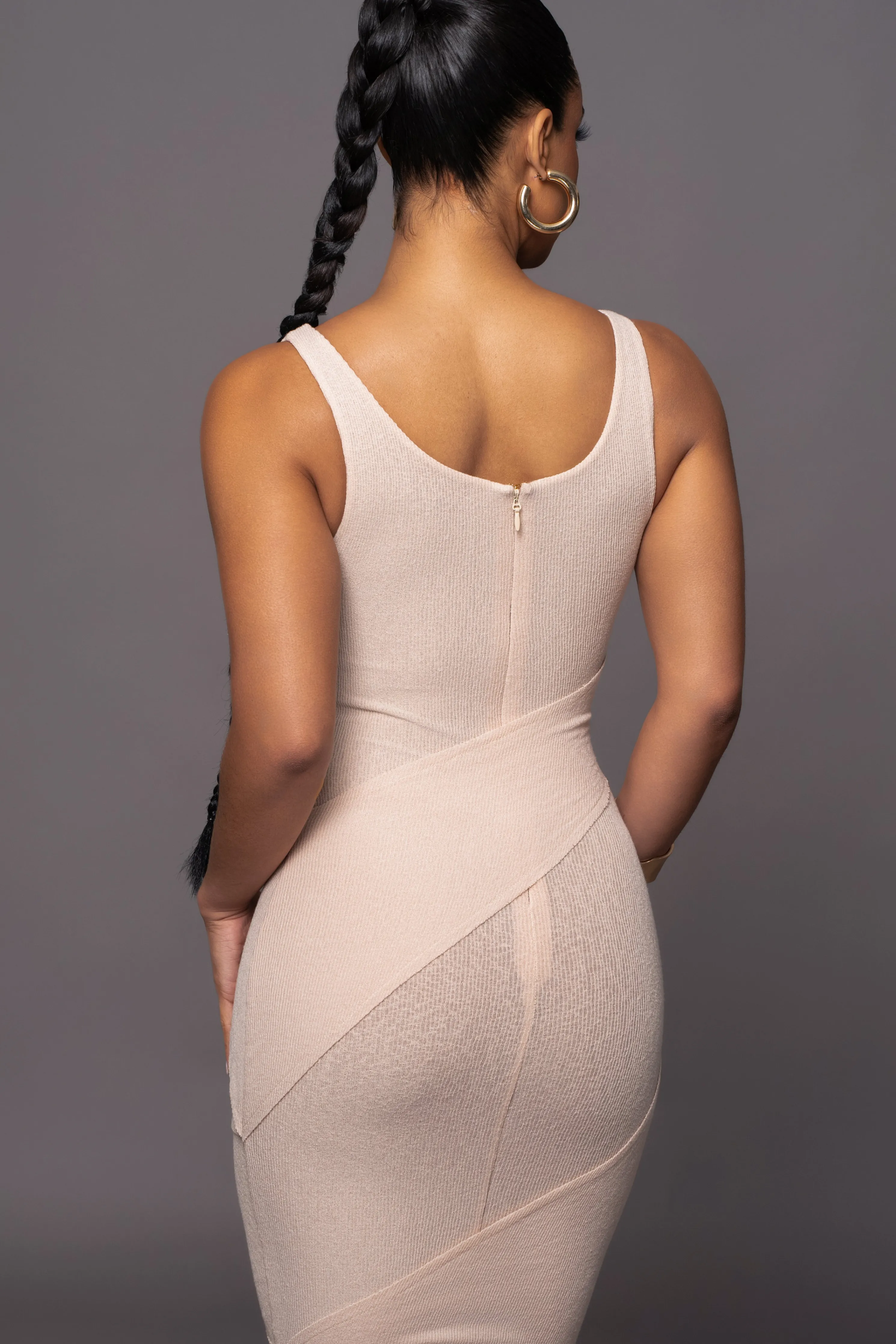 Enter the new seasonwith minimalist stylein our Tan Shift Of Feelings Midi Dress. This lightweight midi dress features a stunning front twist design with cutout chest and slight ruching towards the lower hem for a flattering finish. Back zipper closure. Stretchy. Double lined.