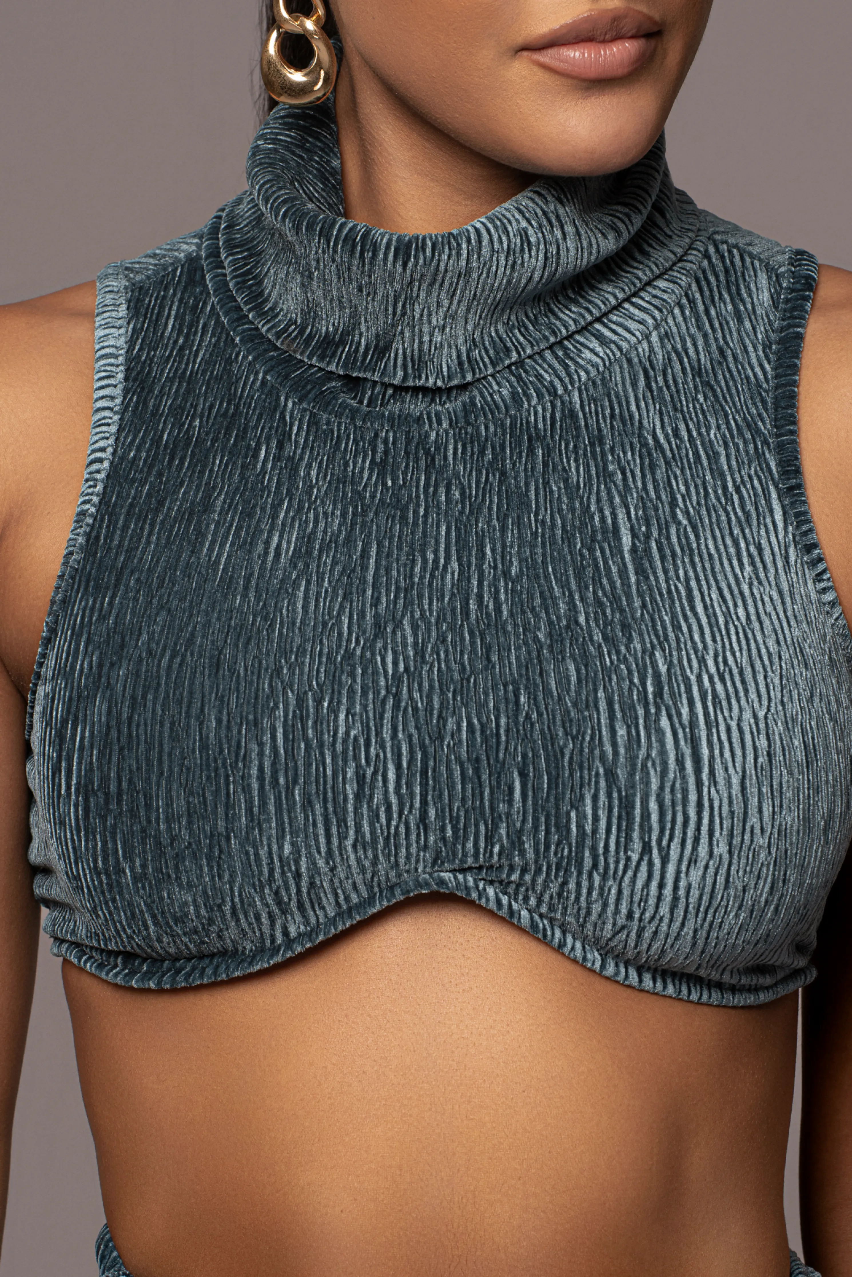 OurTeal Chosen One Velvet Skirt Set makes styling your next night out effortless! Crinkled velvet fabric shapes this romantic two-piece set featuring a sleeveless crop top with a turtleneck and an under-bust cut with structured wiring. The matching skirt is cut with a high waist and details a beautiful drape and side slit. Single-lined with stretch. Sold as set.