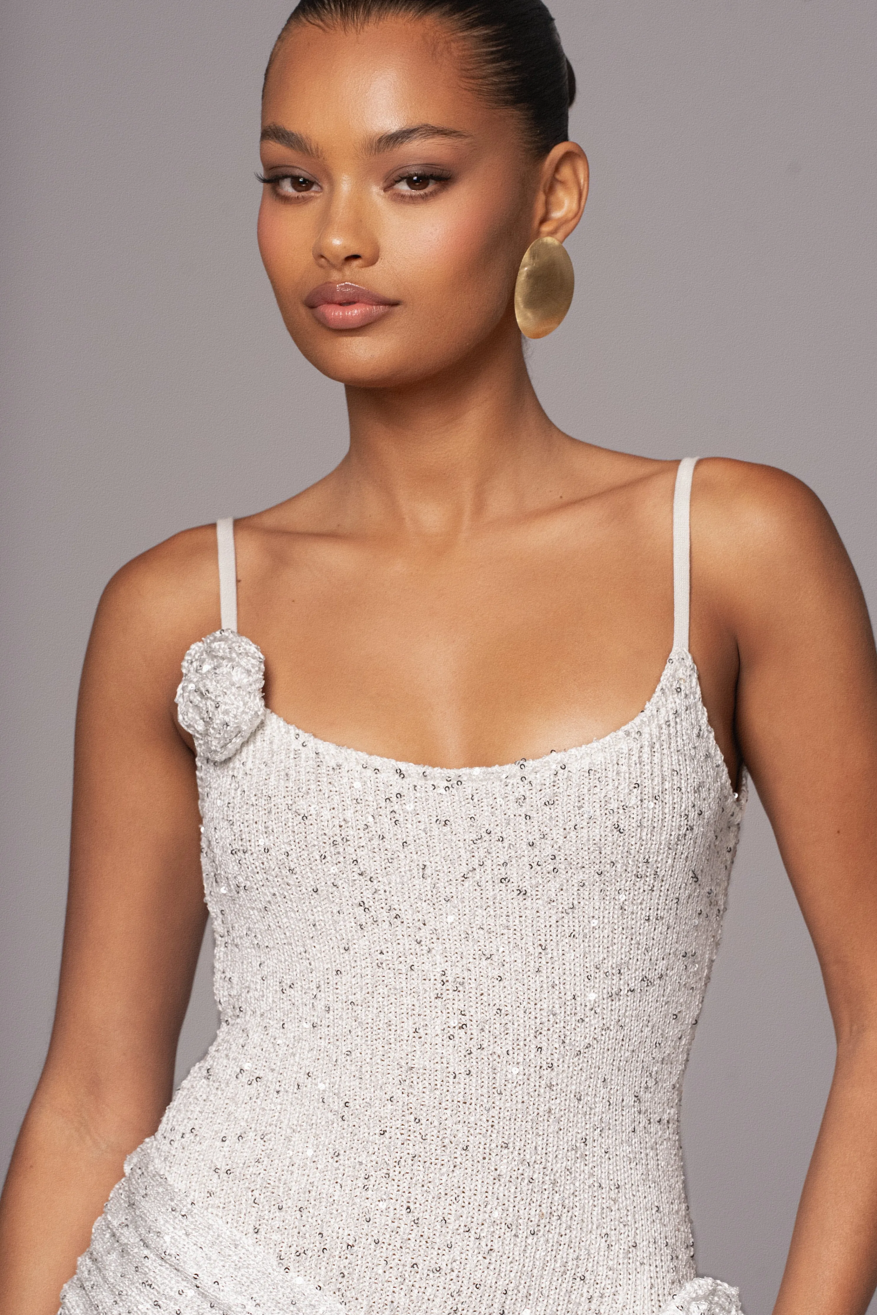 Add a touch of sparkle to everyday White Golden Dusk Sequin Dress. This statement mini dress features adjustable shoulder straps with a side drape and delicate rose appliqués that can be removed. Crafted from stunning sequin fabric with a lined interior, this dress is designed to make you feel like a work of art. Stretchy.