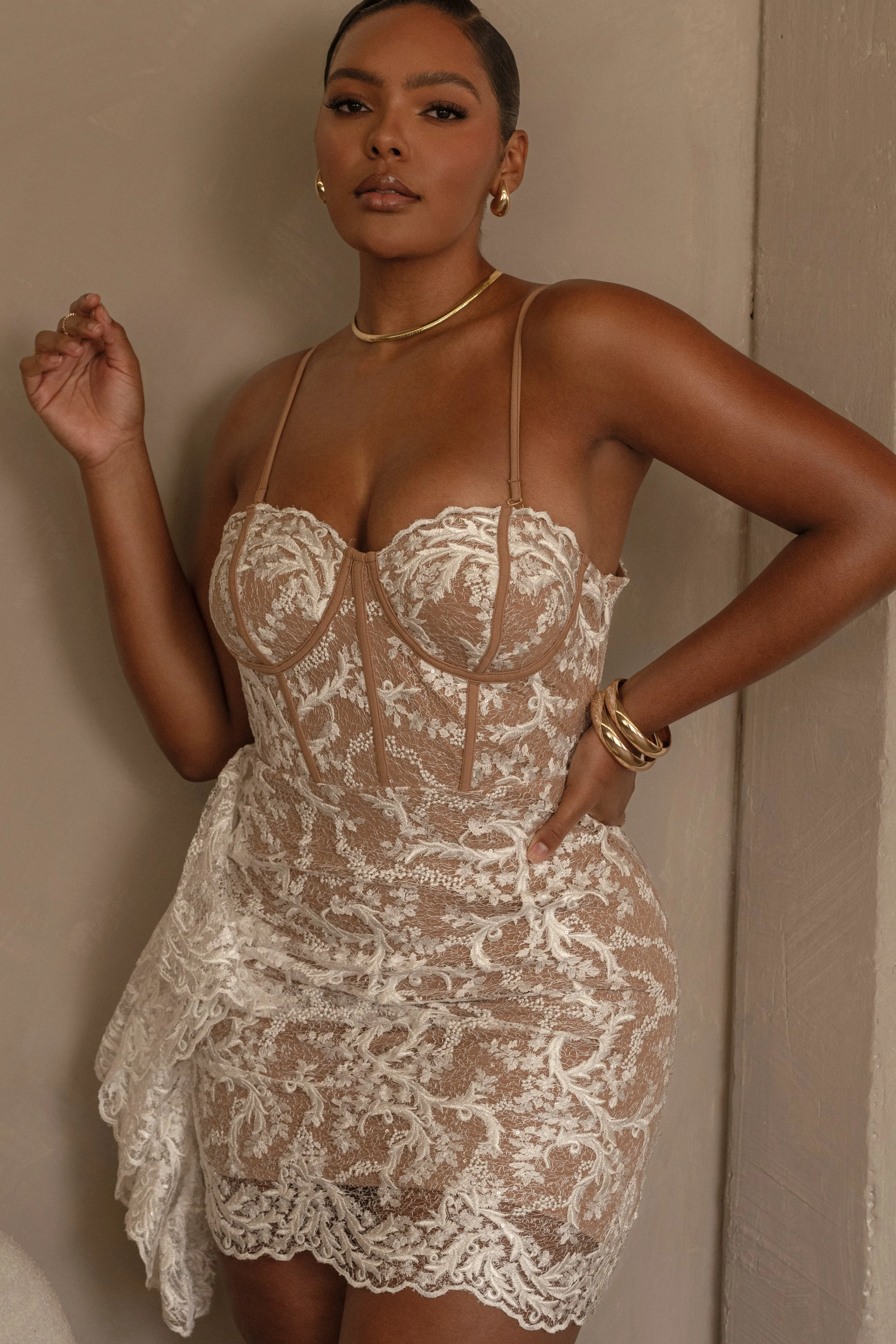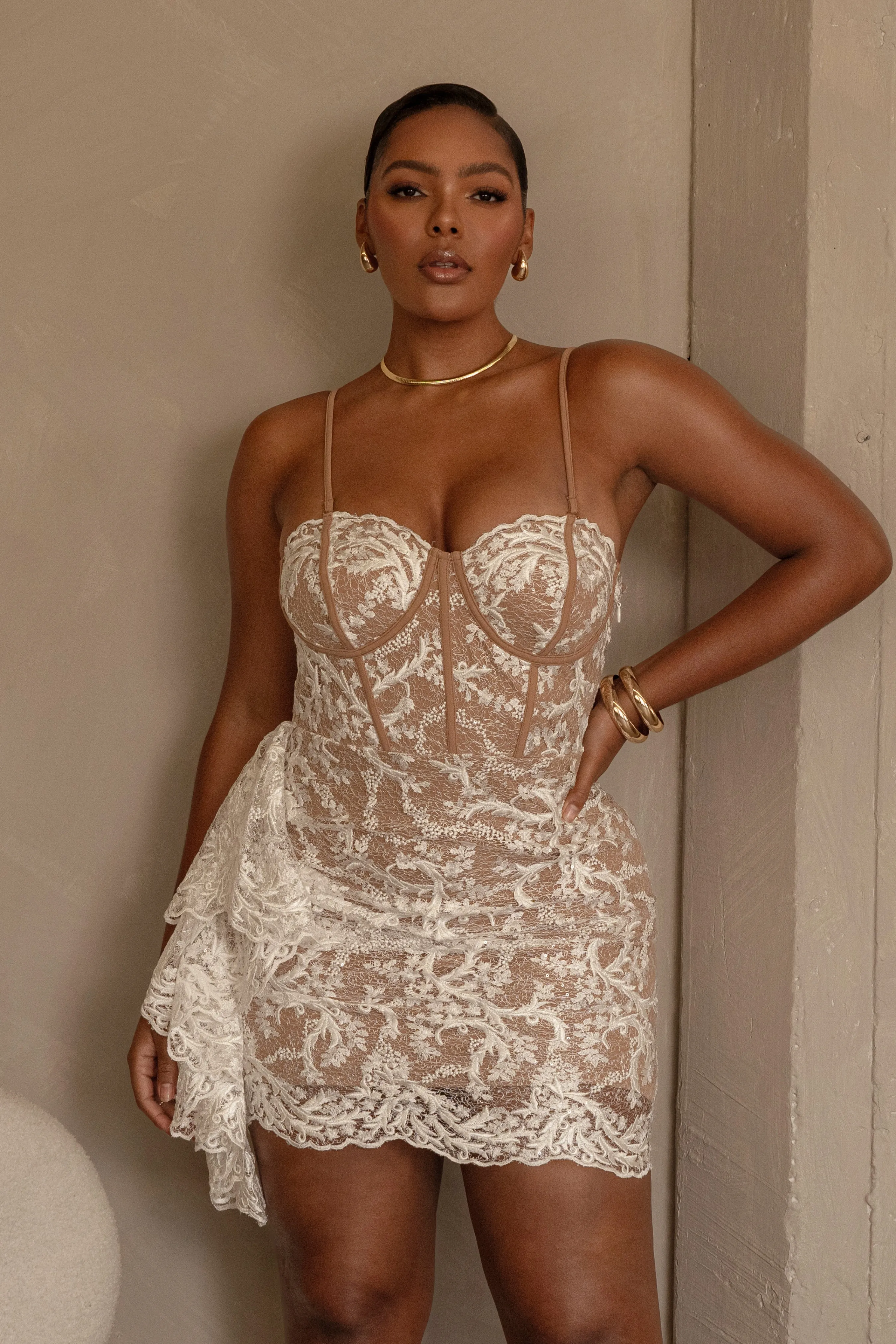 OurWhite Marilyn Lace Mini Dress features a corset-inspired design crafted from luxurious lace fabric with boning detail creating a structured silhouette with a ruffled side drape adding a feminine touch. Featuring padded cups, grip silicone at the bust for added support, and adjustable/removable shoulder straps for a versatile strapless styling option.Hidden side zipper closure. Double lined. No Stretch.