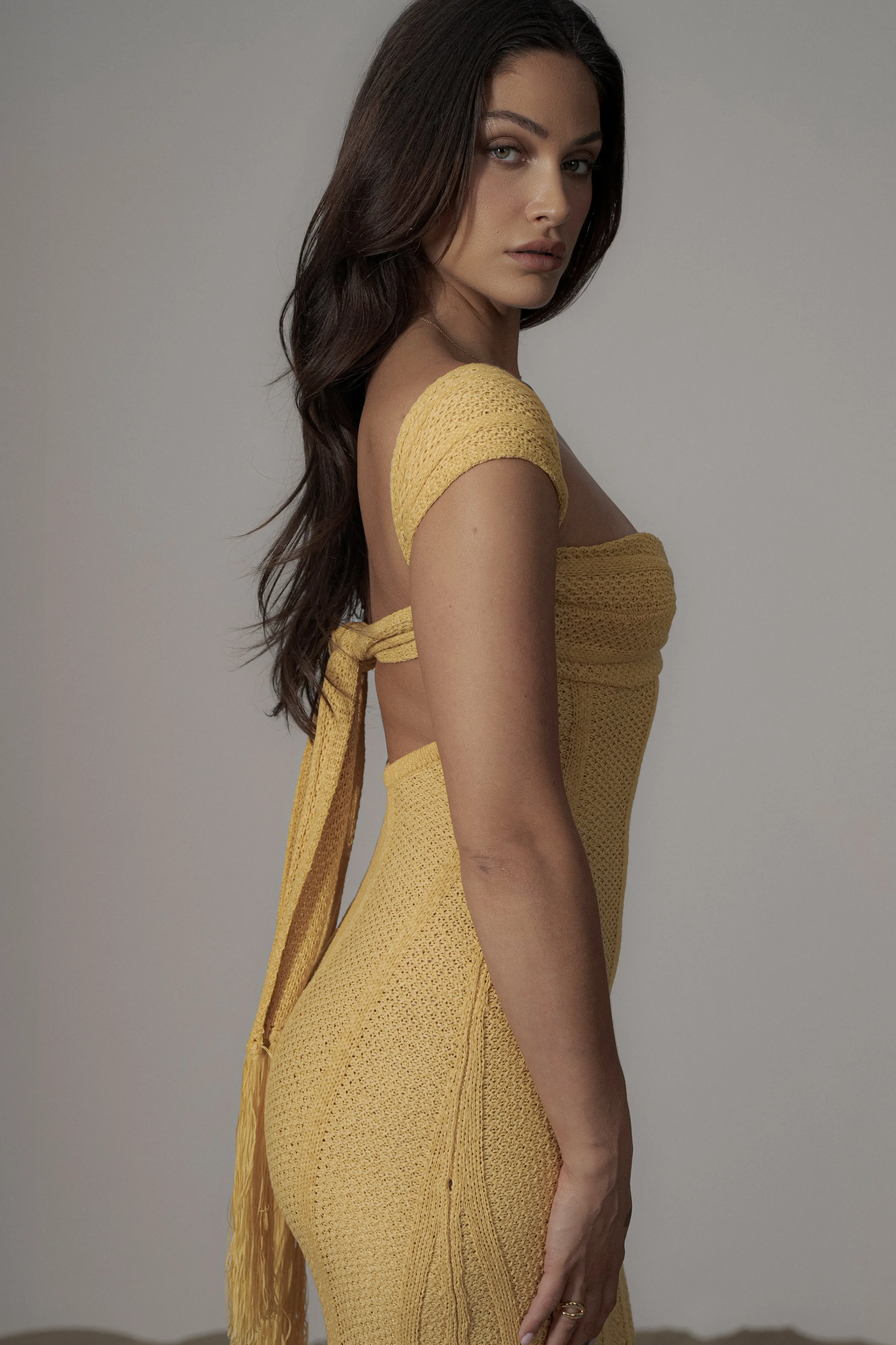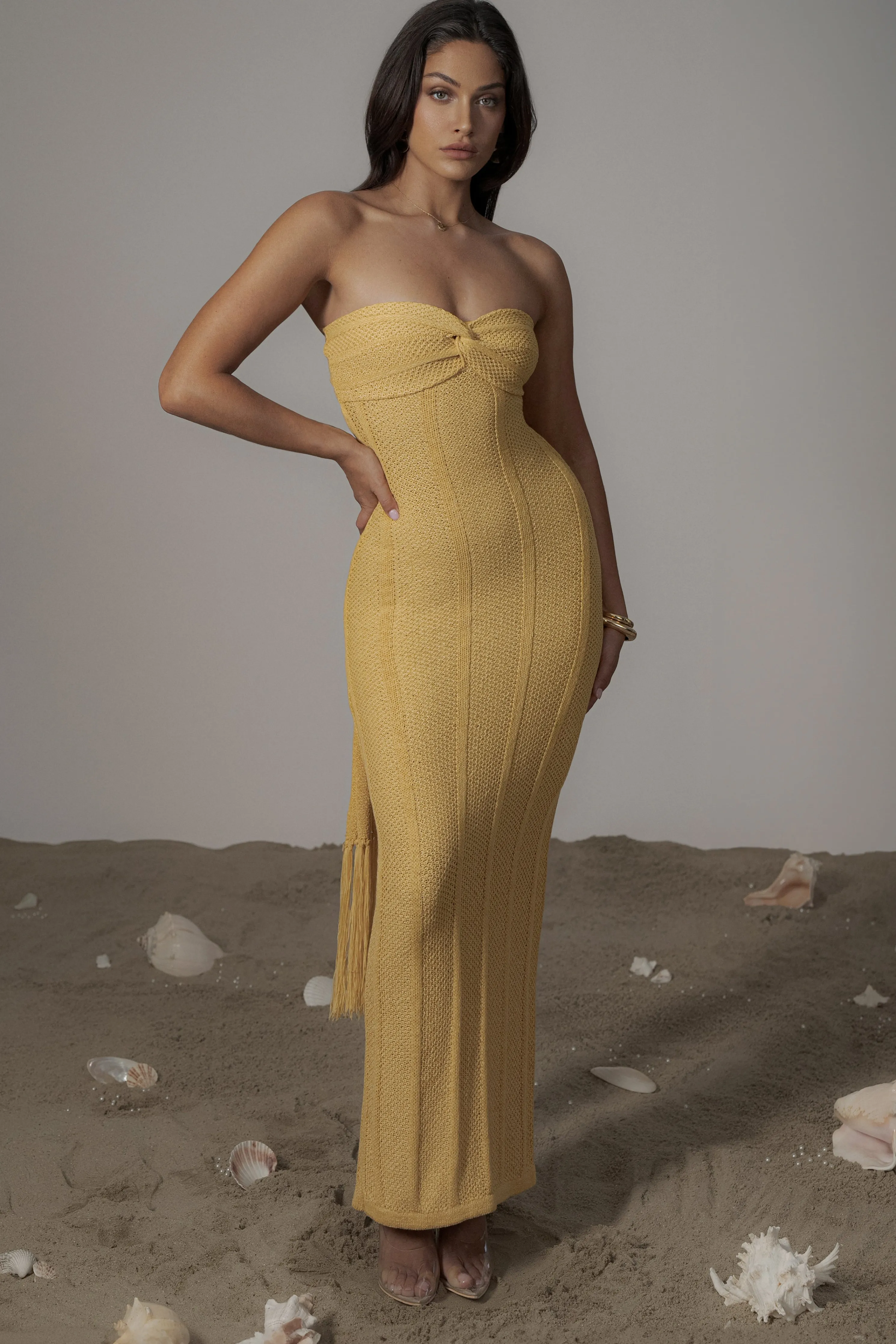 Unwind under the sun with our Yellow Blanca Strapless Maxi Dress. Luxuriously crafted in a soft knit, this maxi dress showcases a strapless neckline with a twist front design, an open back, and cascading multi-way back ties adorned with fringe trims. Stretchy. Single lined.