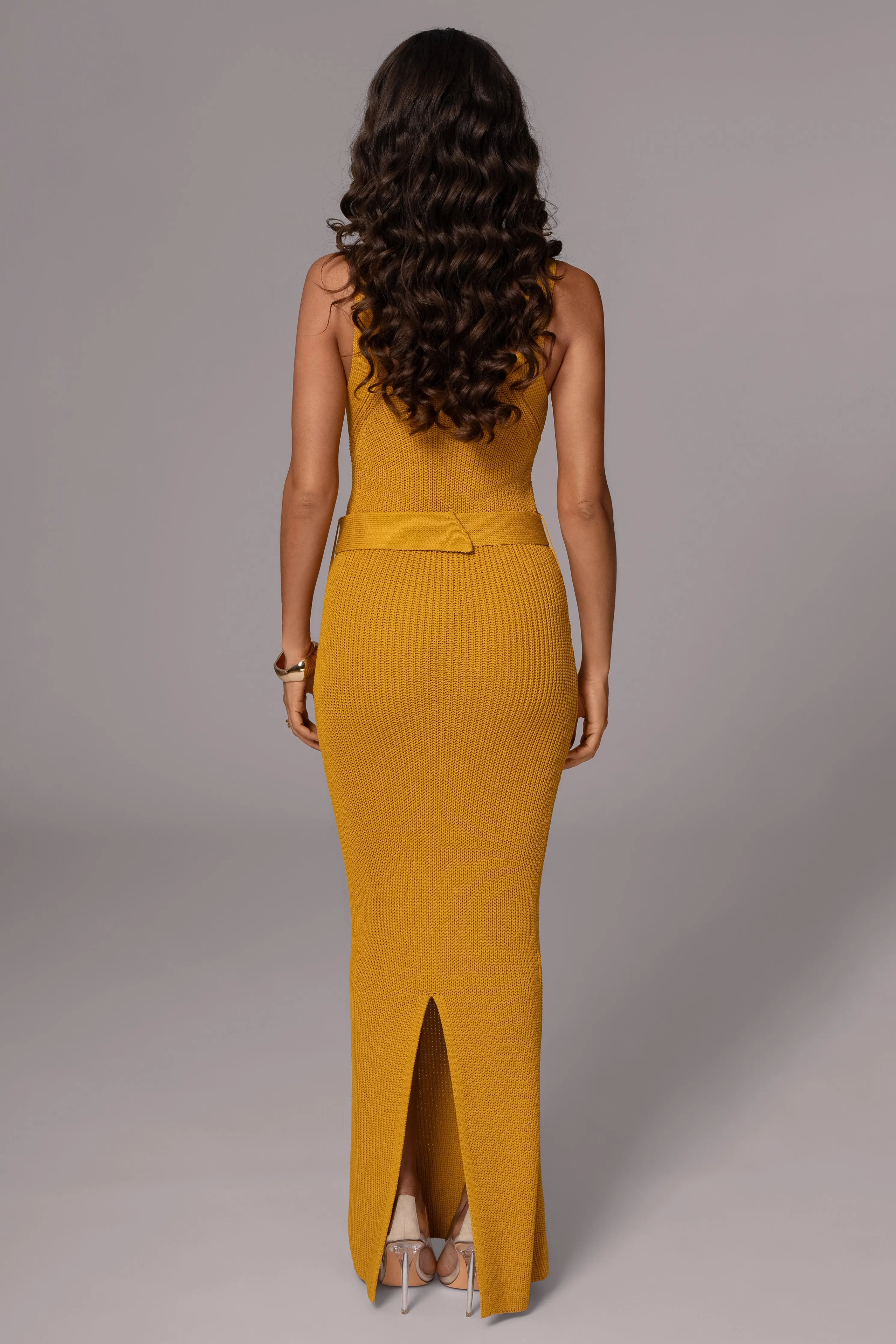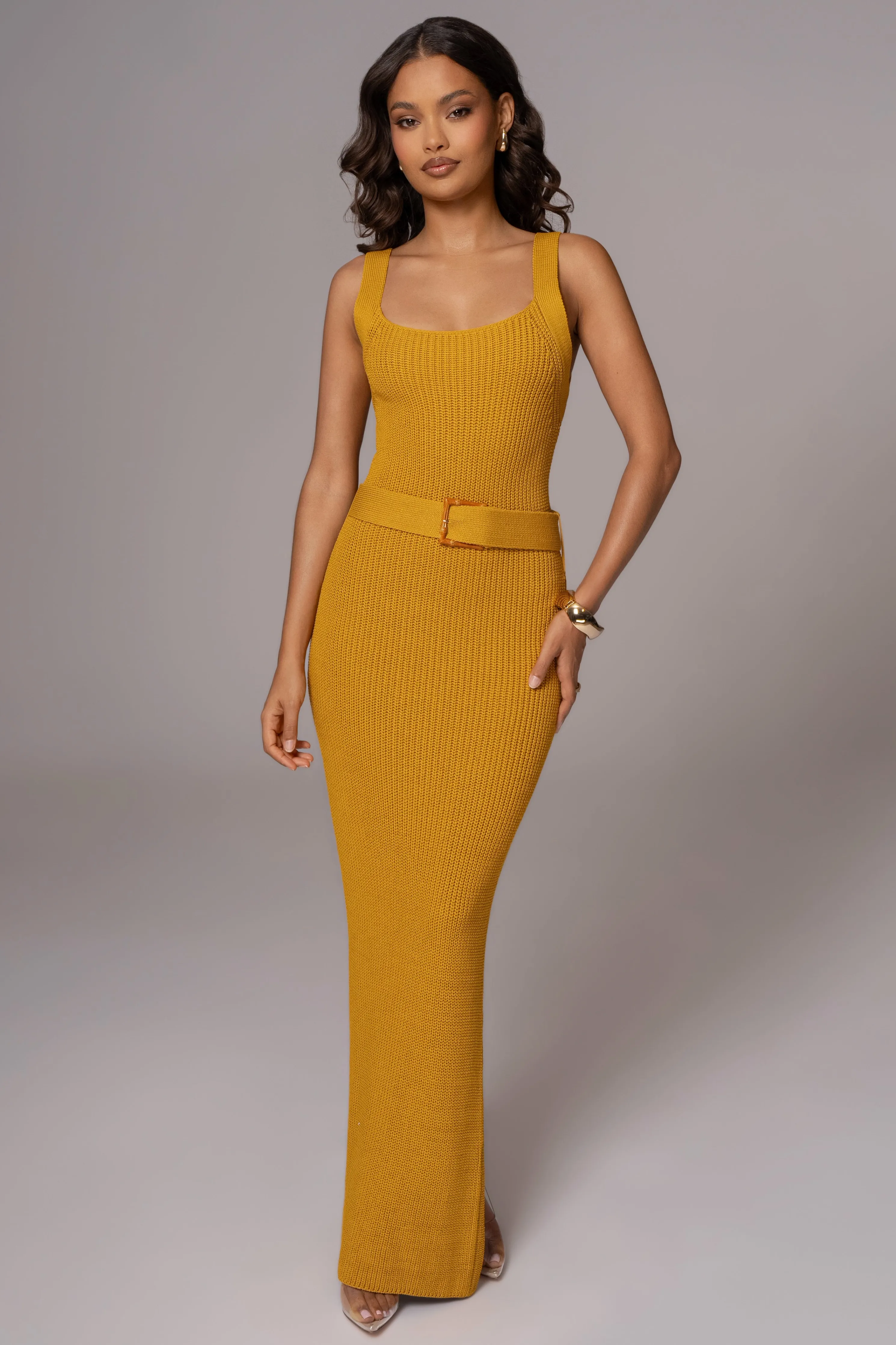 Introducing the dress of summer, our Yellow Moonrise Ribbed Maxi Dress. One of our most loved skirt set has been redesigned in a modern midi dress for a touch of sophistication. Made from a soft knit material, this dress boasts a round neckline, fixed shoulder straps, and a matching bamboo buckle waist belt for a flattering silhouette. Perfect for any occasion, exuding both style and comfort. Stretchy. Single lined.
