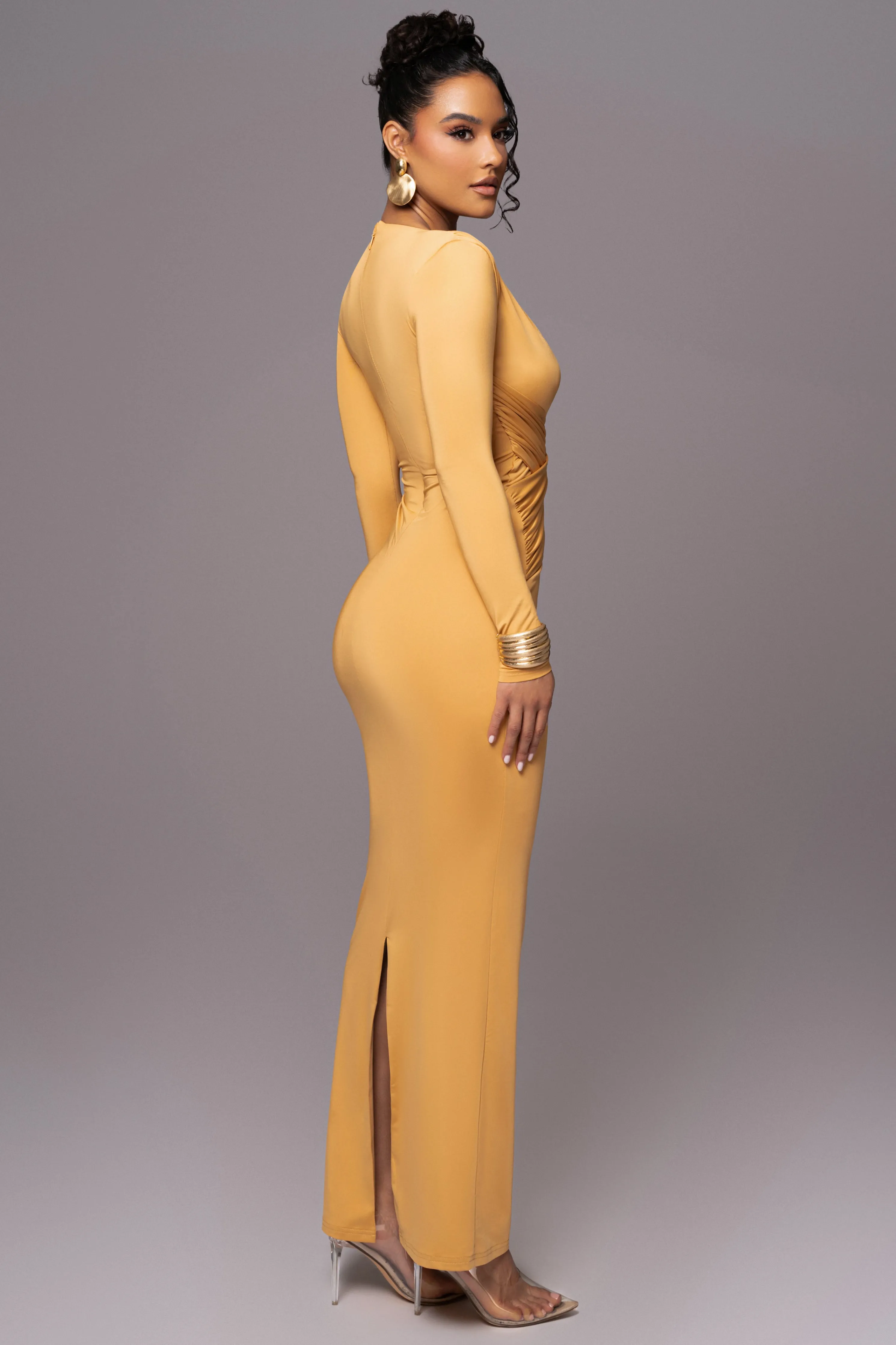 Experience sophistication at its finest with ourYellow Rowan Plunge Maxi Dress. Showcasing fitted long sleeves and a low v-neckline, this dress is accentuated with chic shirred detailing at the waist and back slit hem. Crafted in smooth double-lined fabric, this elegant dress is sure to become a timeless staple in your wardrobe. Stretchy. Back zipper closure.