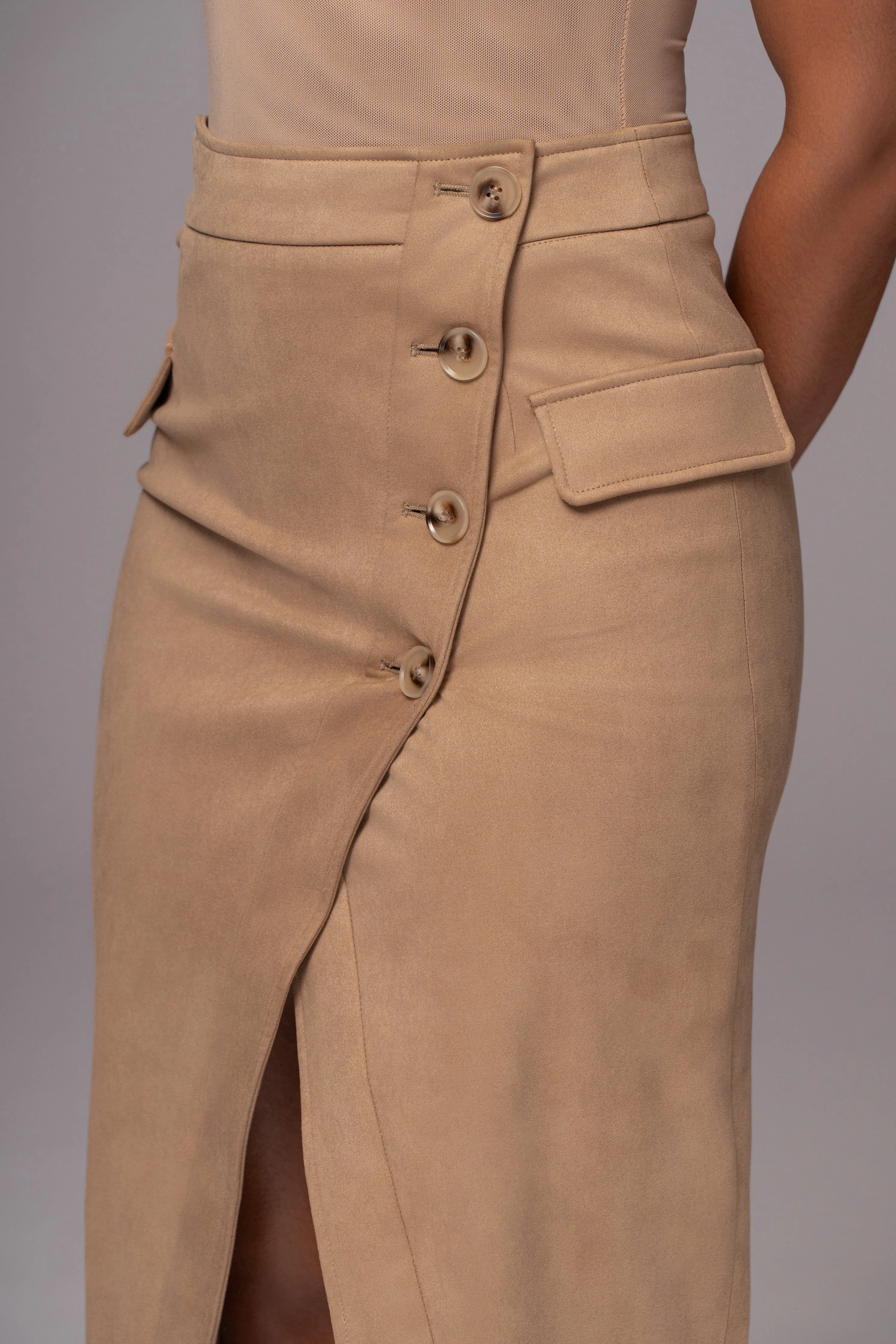 Step up your style with our Beige Audrey Suede Midi Skirt. Featuring an asymmetrical button closure and a chic slit for a modern touch. Faux welt pockets on each side add subtle detail, while the satin-like interior ensures smooth comfort. Perfect for creating effortlessly sophisticated looks. Pair with our Nightfall Suede Jacket for the full look. Double lined.