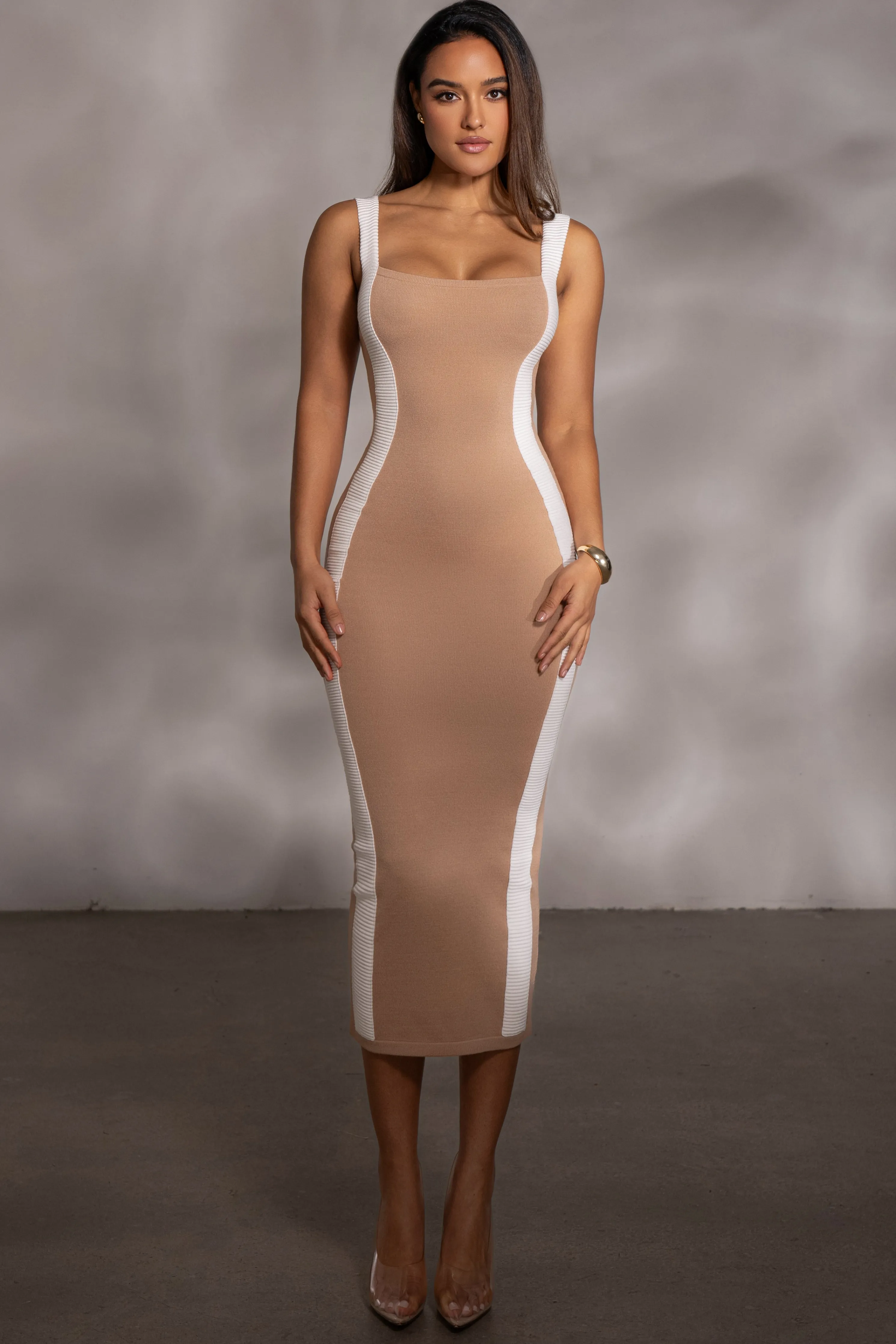 Effortlessly stylish and comfortable, theBeige Donna Knit Dress is a must-have addition to your winter wardrobe. With ribbed knit fabric, a squared neckline, tank shoulder straps, and flattering contrasting panels, this midi dress seamlessly combines elegance and comfort. Stretchy. Single lined.
