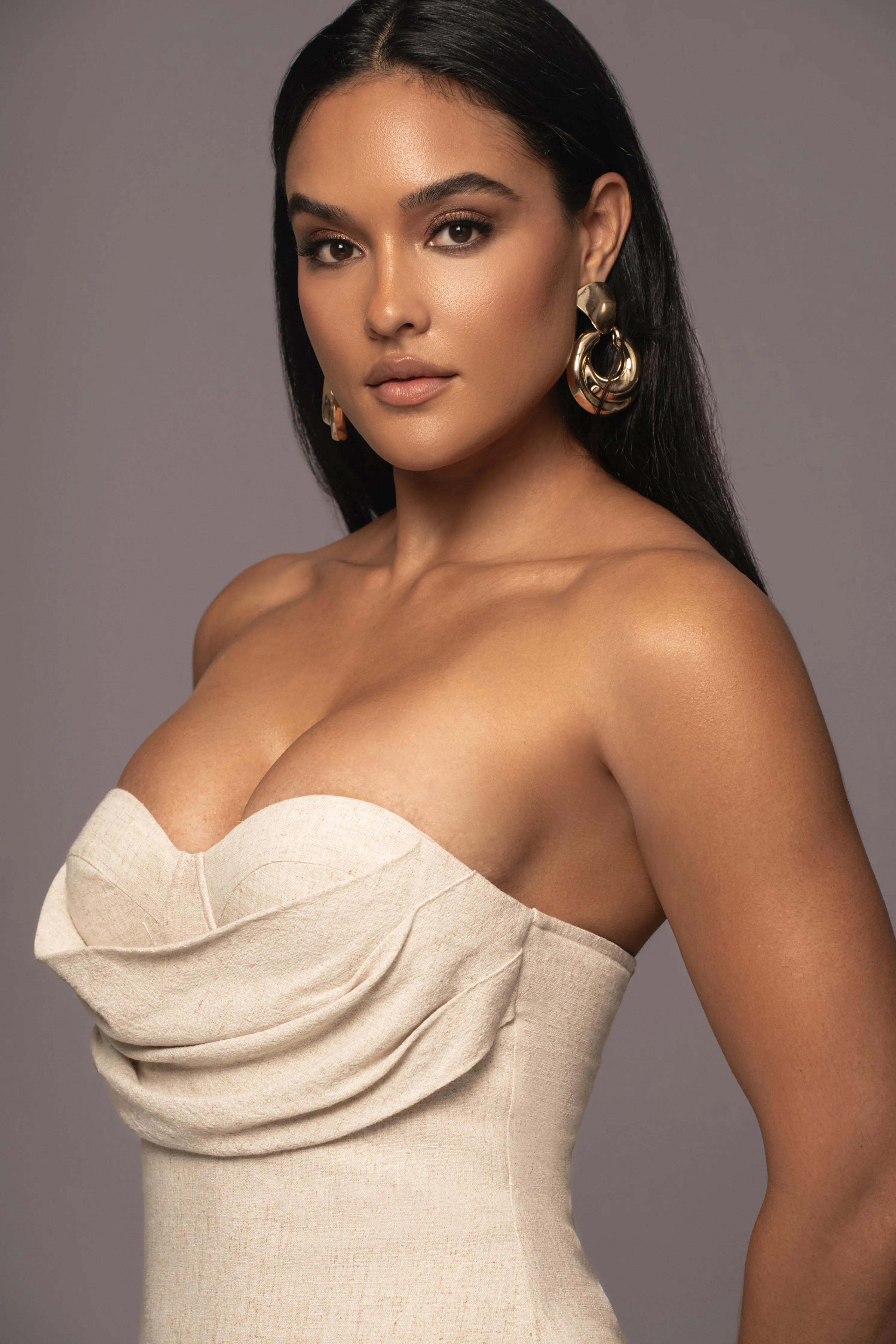 Our Beige Linen Visions Of You Dress is a statement on its own. We’ve taken one of our most loved designs and reimagined it in fresh linen fabric, elevating its allure. This stunning midi dress features a cowl neckline, padded bra cups, and adjustable/removable shoulder straps in a braided trim for extra style. Complete with a silicone gel grip at the top hem for a secure hold and a hidden back zipper for closure. Back slit hem. Double Lined.