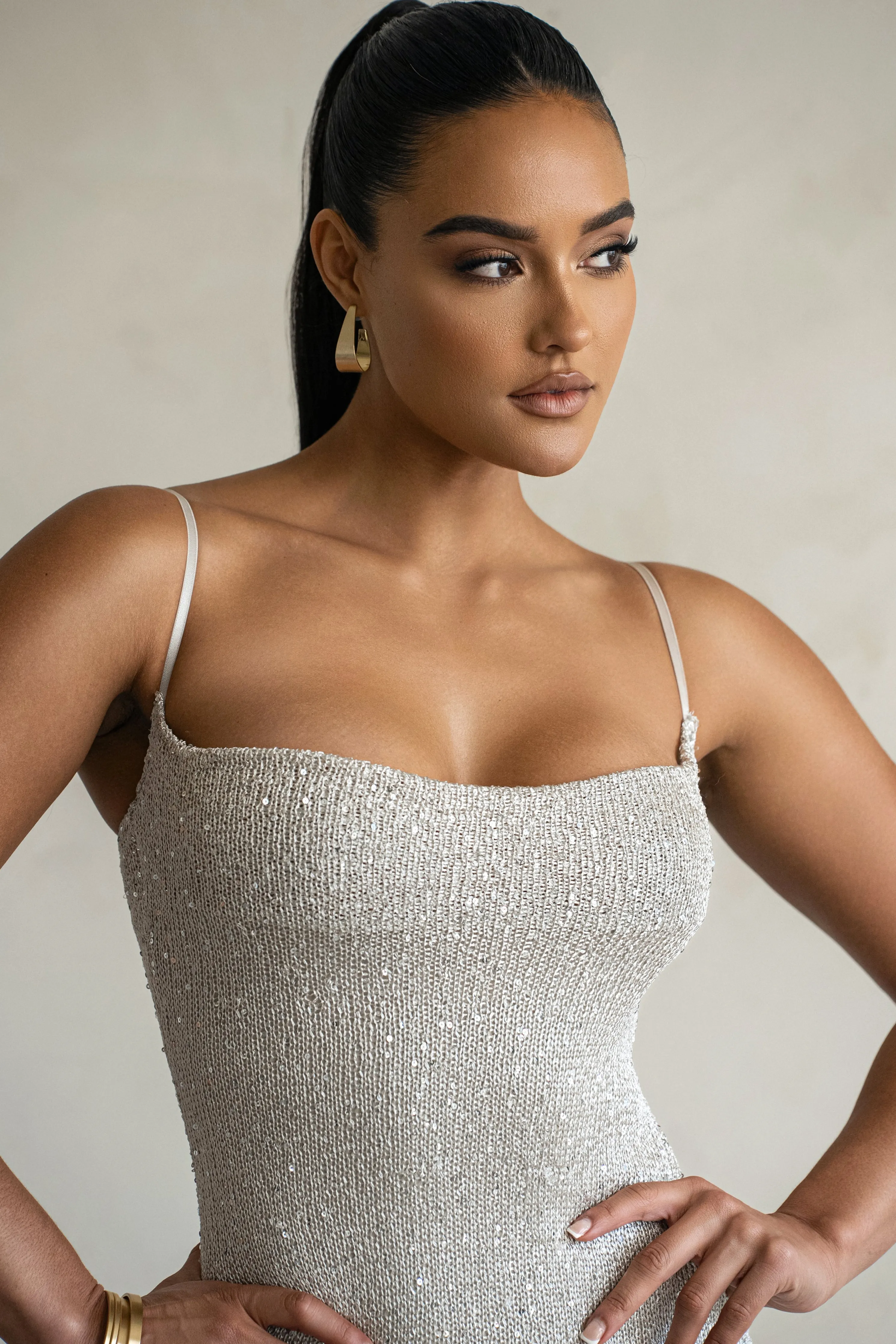 Shimmer under the stars in our Beige Noemie Sequin Maxi Dress. This high-shine maxi dress features a lovely cowl neck with adjustable shoulder straps and afitted silhouette with maxi hem. Made of a luxurious sequin knit material for a captivating finish with interior lining for coverage. Stretchy. Double lined.