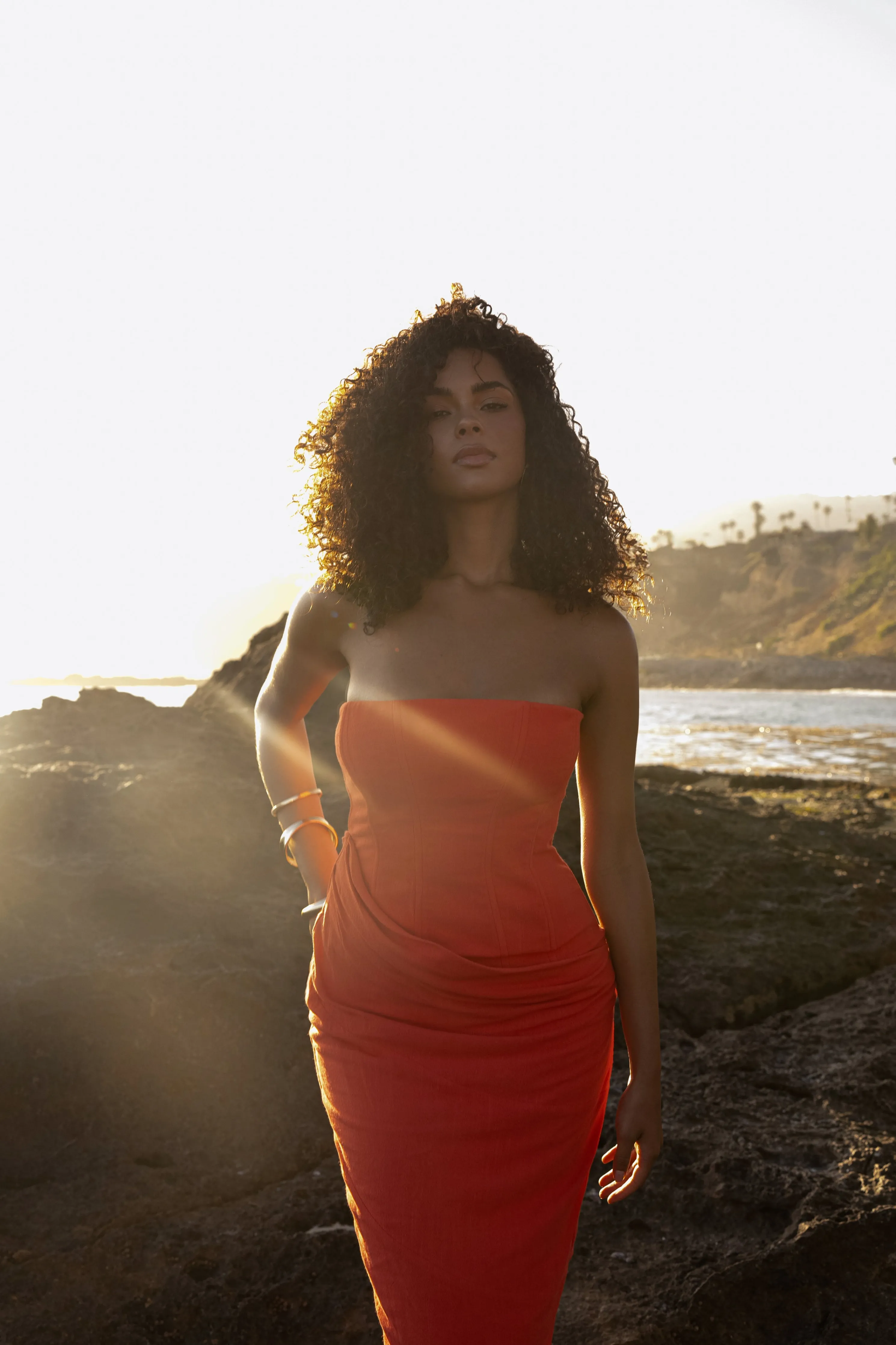 Transform into a vision of summer elegance with our Berry Journey Linen Maxi Dress. Made from a linen blend with double lining, this maxi dress features a strapless neckline with built-in boning and non-slip silicone gel for a secure fit. Finished with elegant draping at the front achieving a sophisticated, seamless silhouette. Hidden back zipper closure. No stretch.