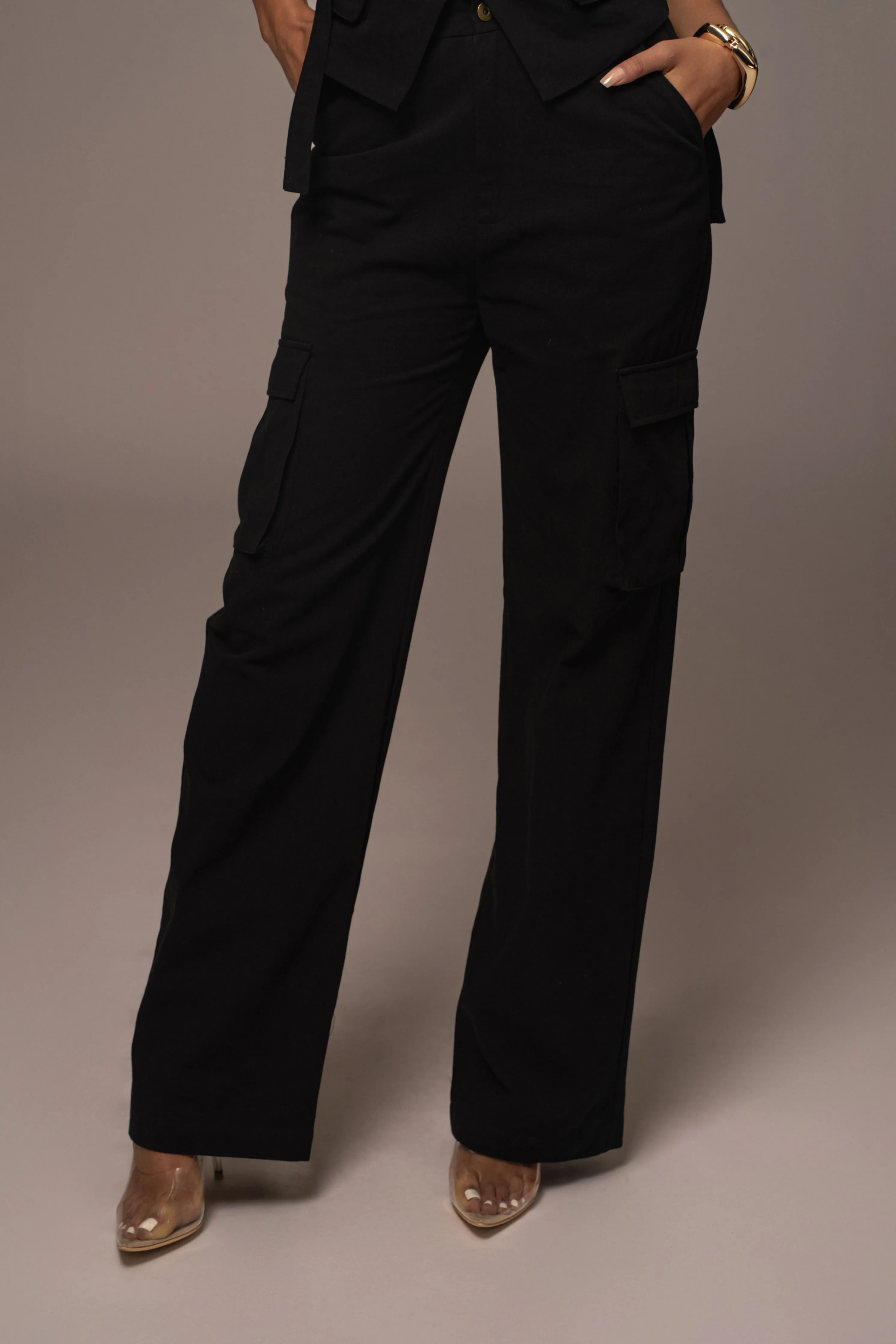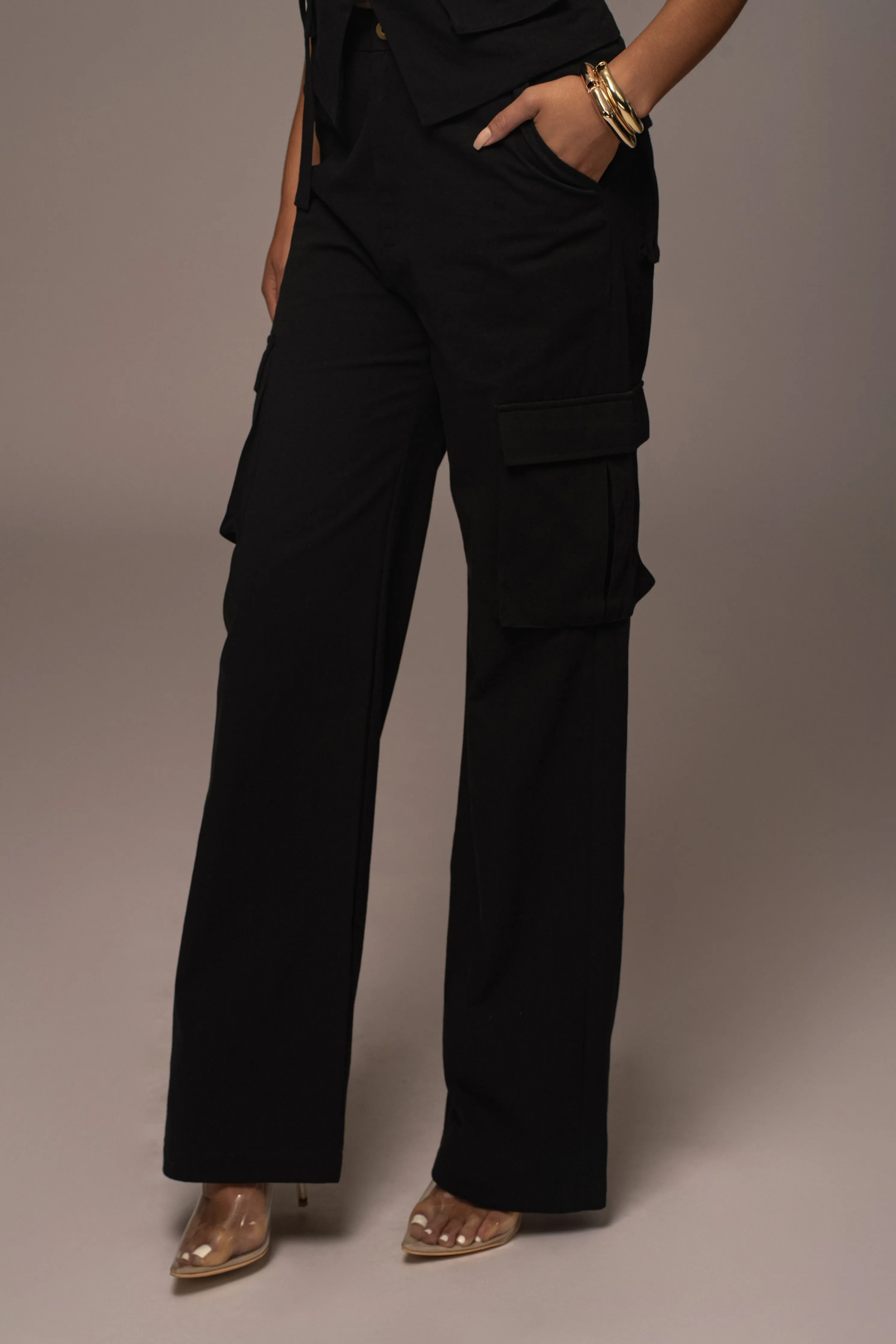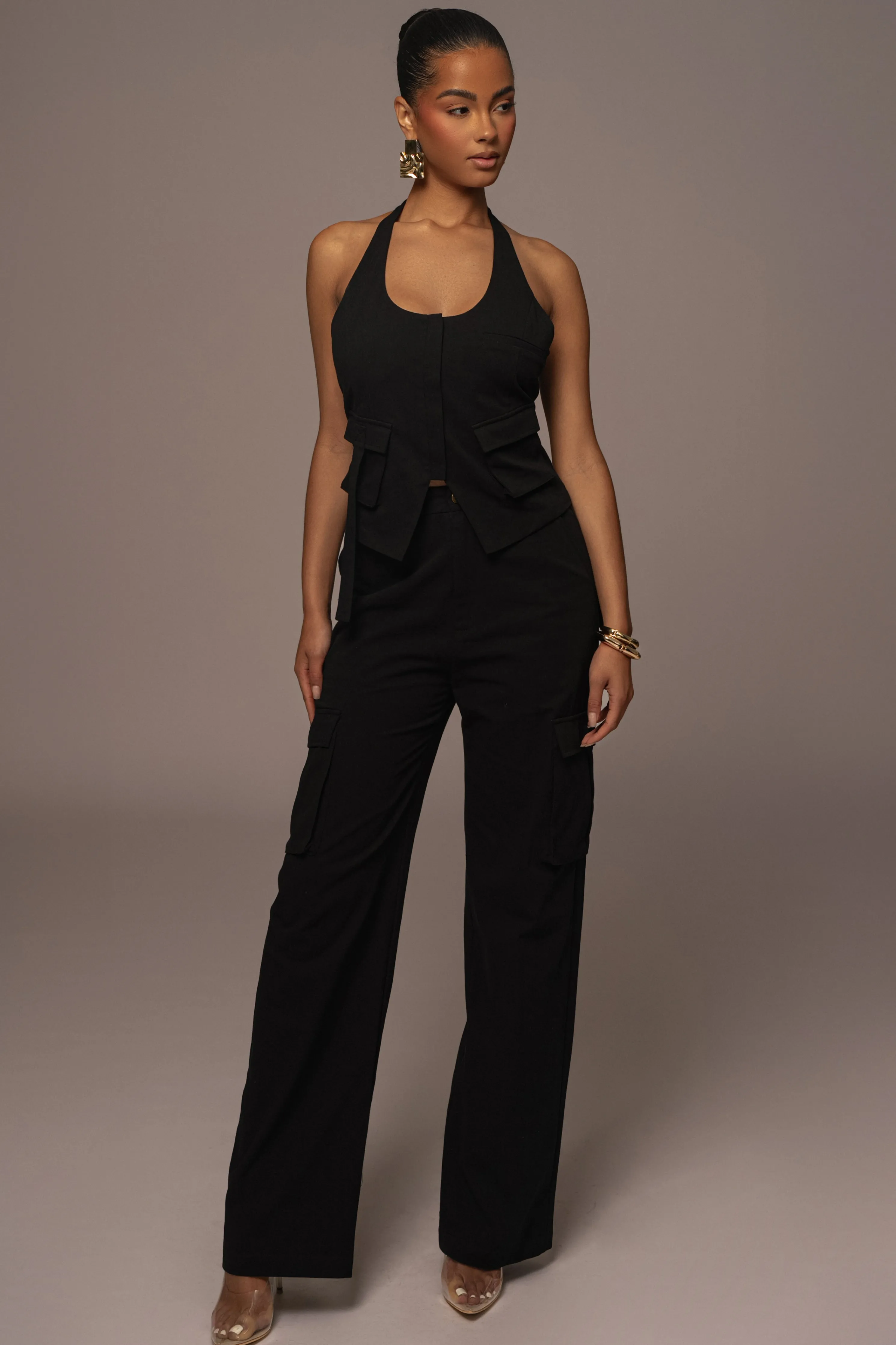 Our Black Aeris Pant Set is a match made in heaven. This vacation ready pant set features a halter top with stylish cargo pockets and front zipper closure. The matching pants feature straight leg hems with front button/zipper closure, functional side/back pockets, and cargo pockets for added functionality and style. Elastic waistband. No stretch. Sold as set. Top is double-lined, Pants are single-lined.