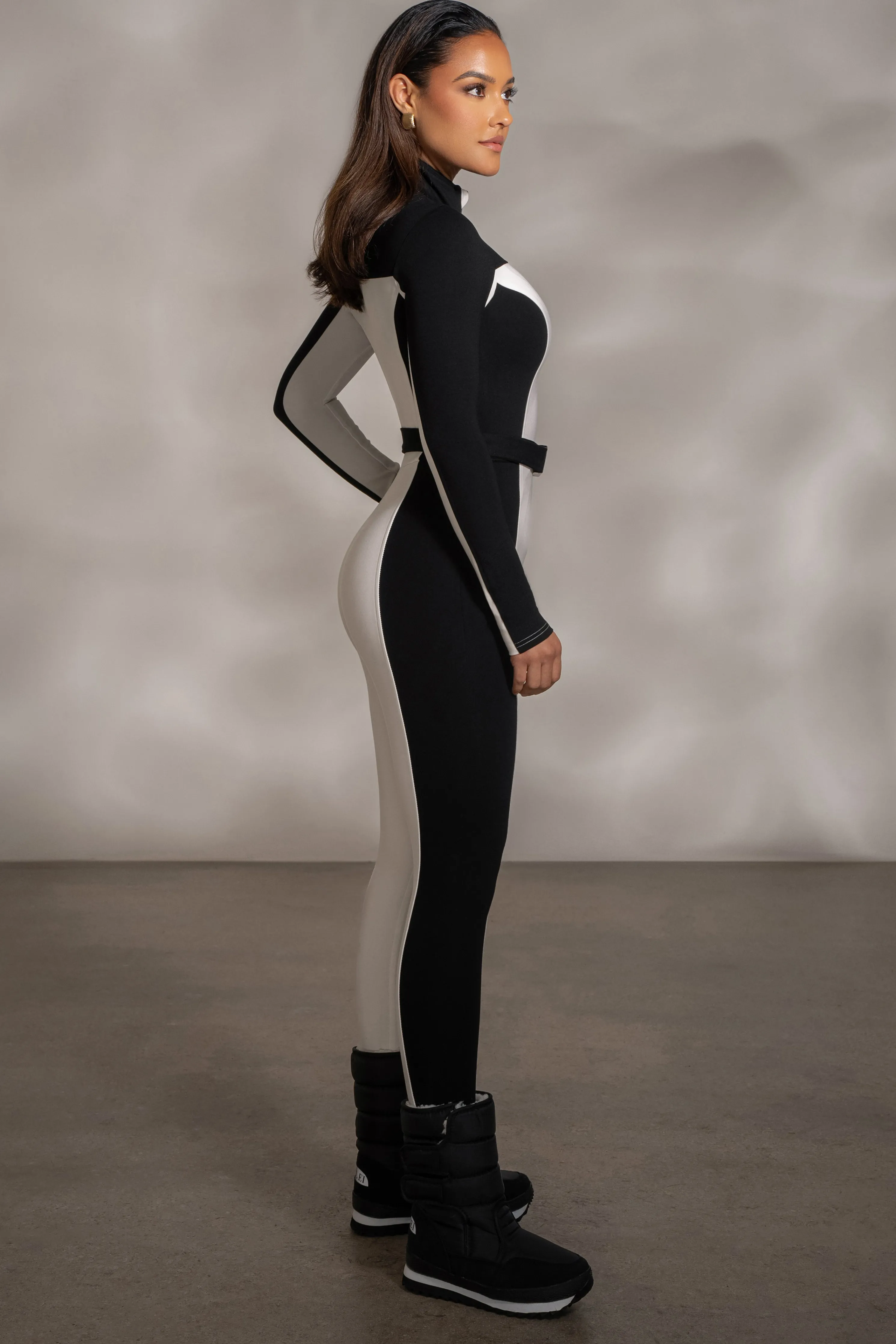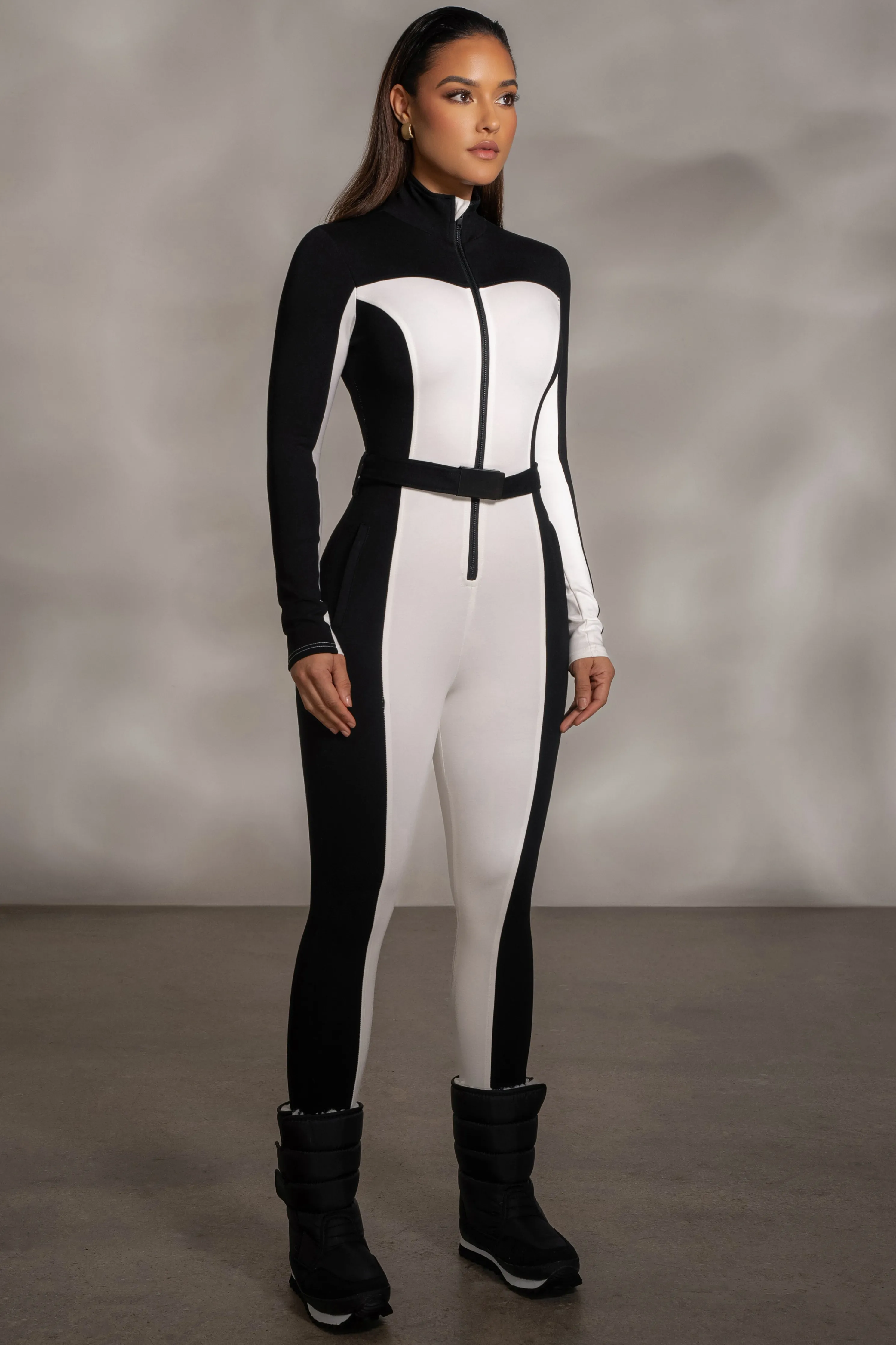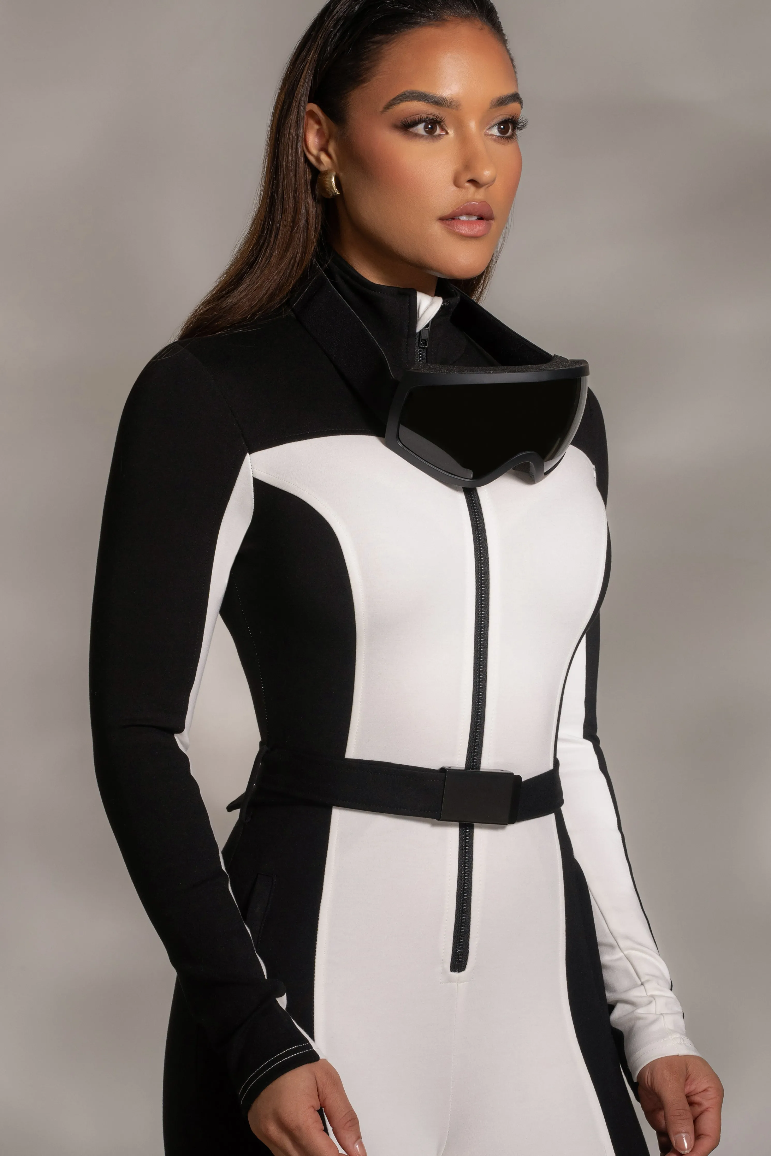 Introducing the Black Arctic Rush Ski Suit, where style effortlessly meets comfort. With its contrasting two tone colors, high neckline, and front zipper, this ski suit will have you ready for the slopes. Complete with side zipper pockets and a matching belt with a metal buckle, it’s the perfect fusion of aesthetics and functionality. The ultimate companion for every winter adventure.Not water-resistant.