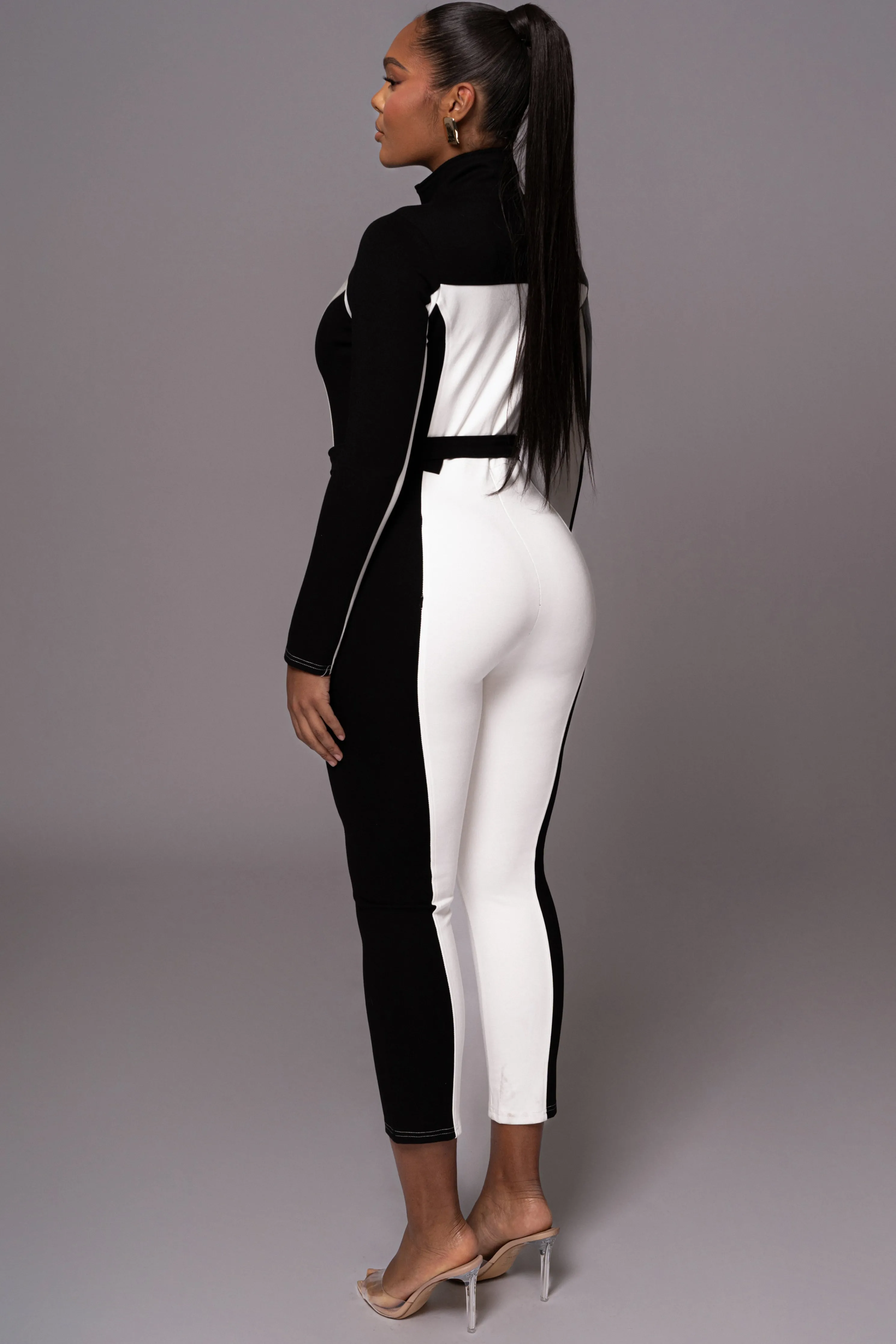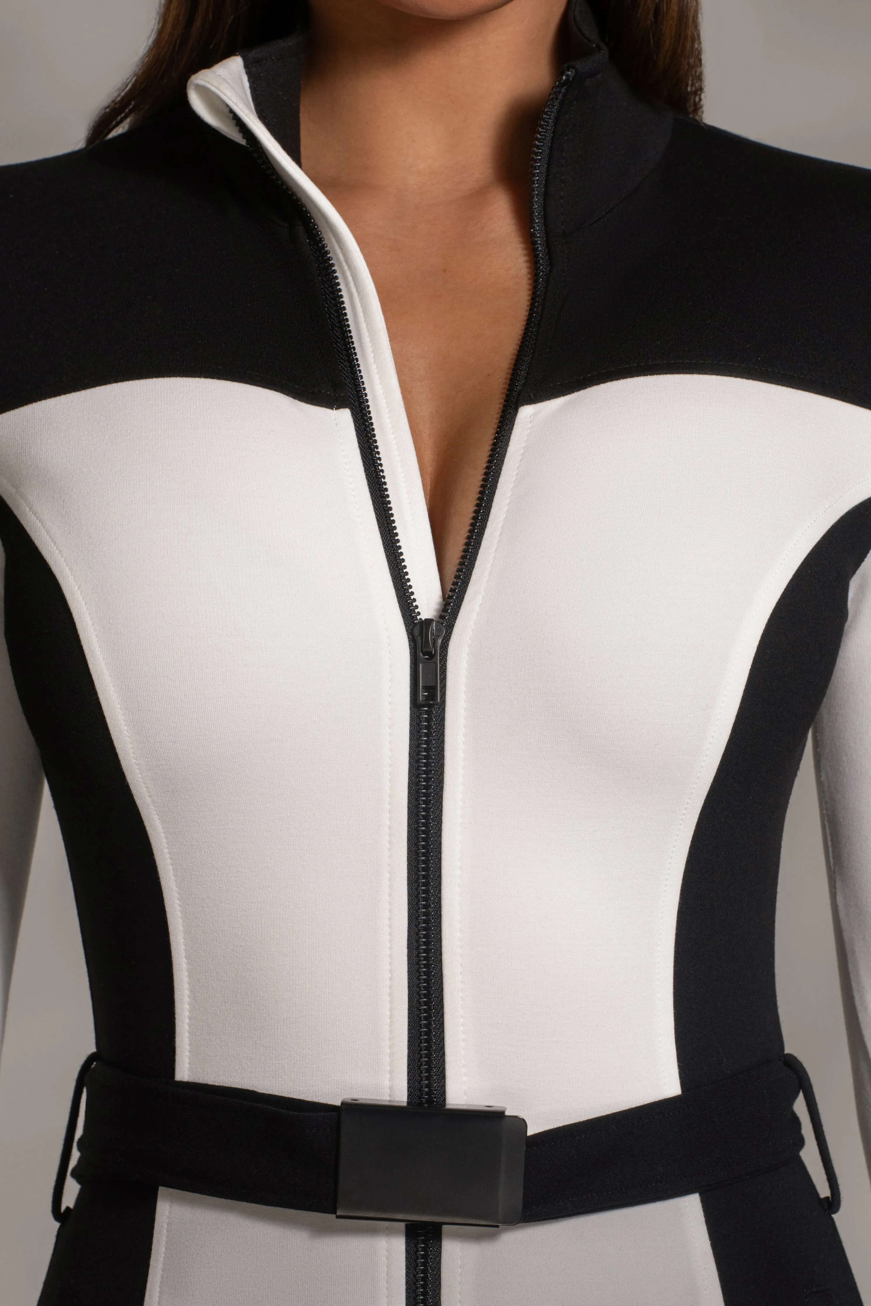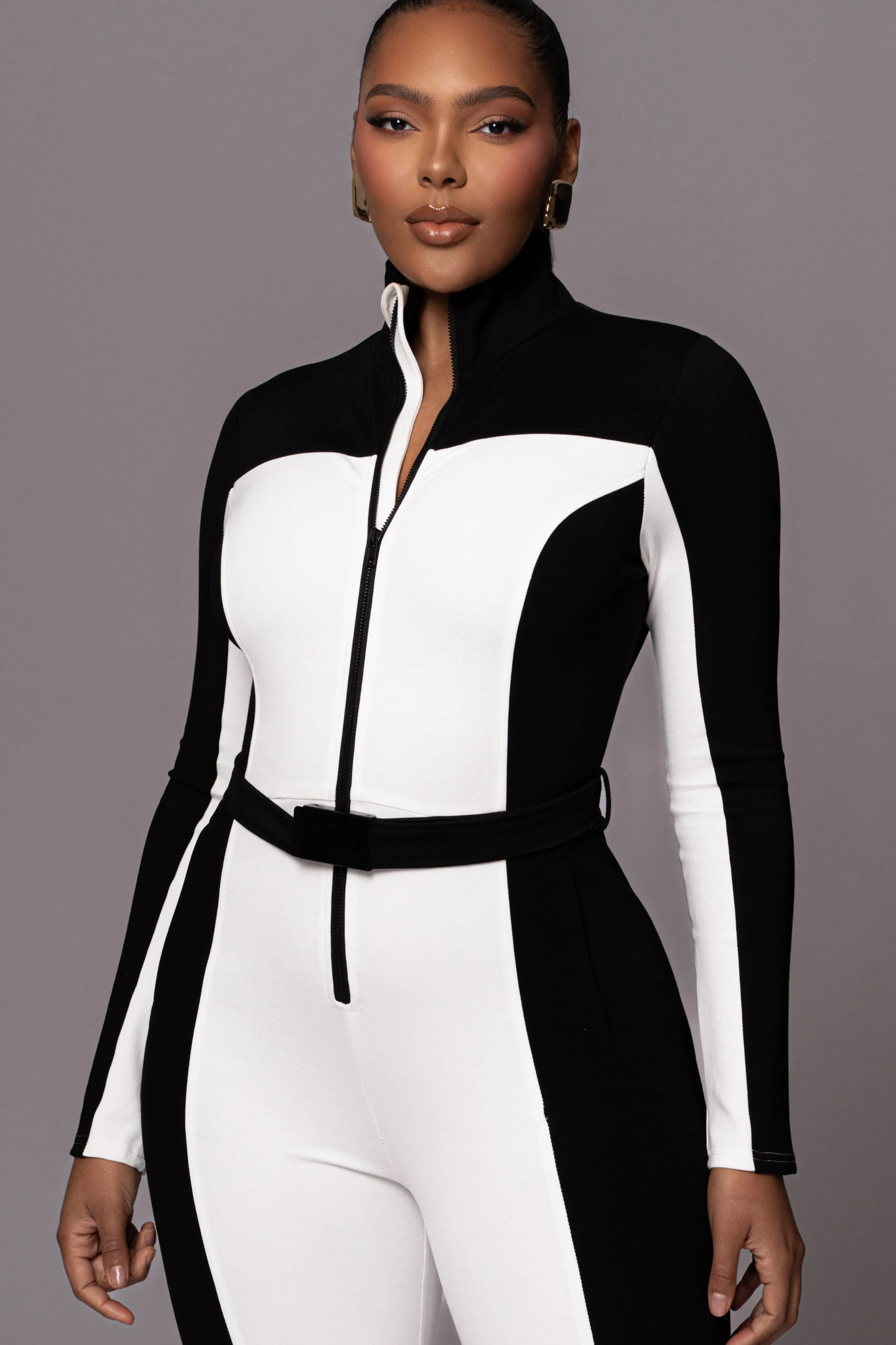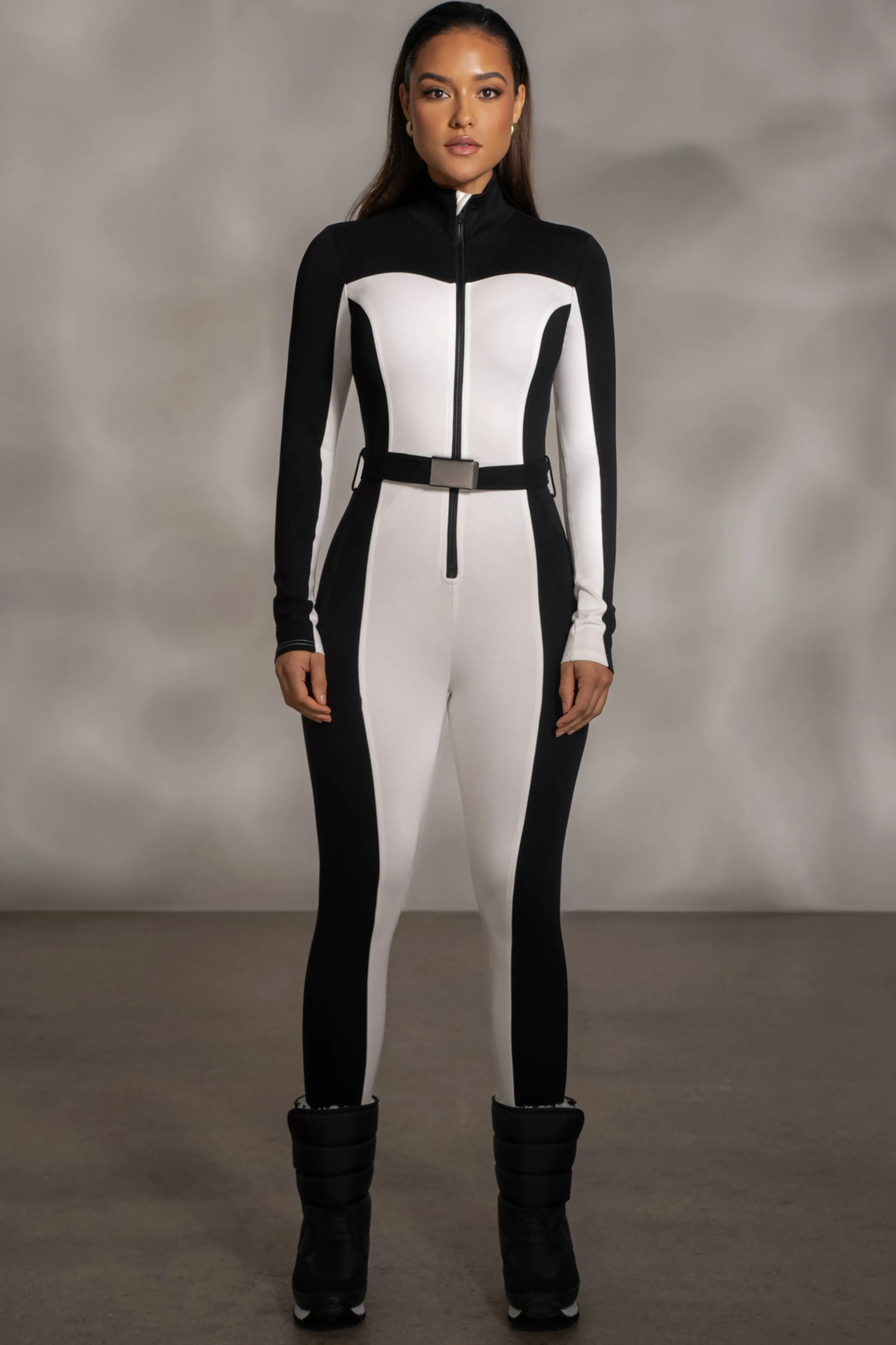 Introducing the Black Arctic Rush Ski Suit, where style effortlessly meets comfort. With its contrasting two tone colors, high neckline, and front zipper, this ski suit will have you ready for the slopes. Complete with side zipper pockets and a matching belt with a metal buckle, it’s the perfect fusion of aesthetics and functionality. The ultimate companion for every winter adventure.Not water-resistant.