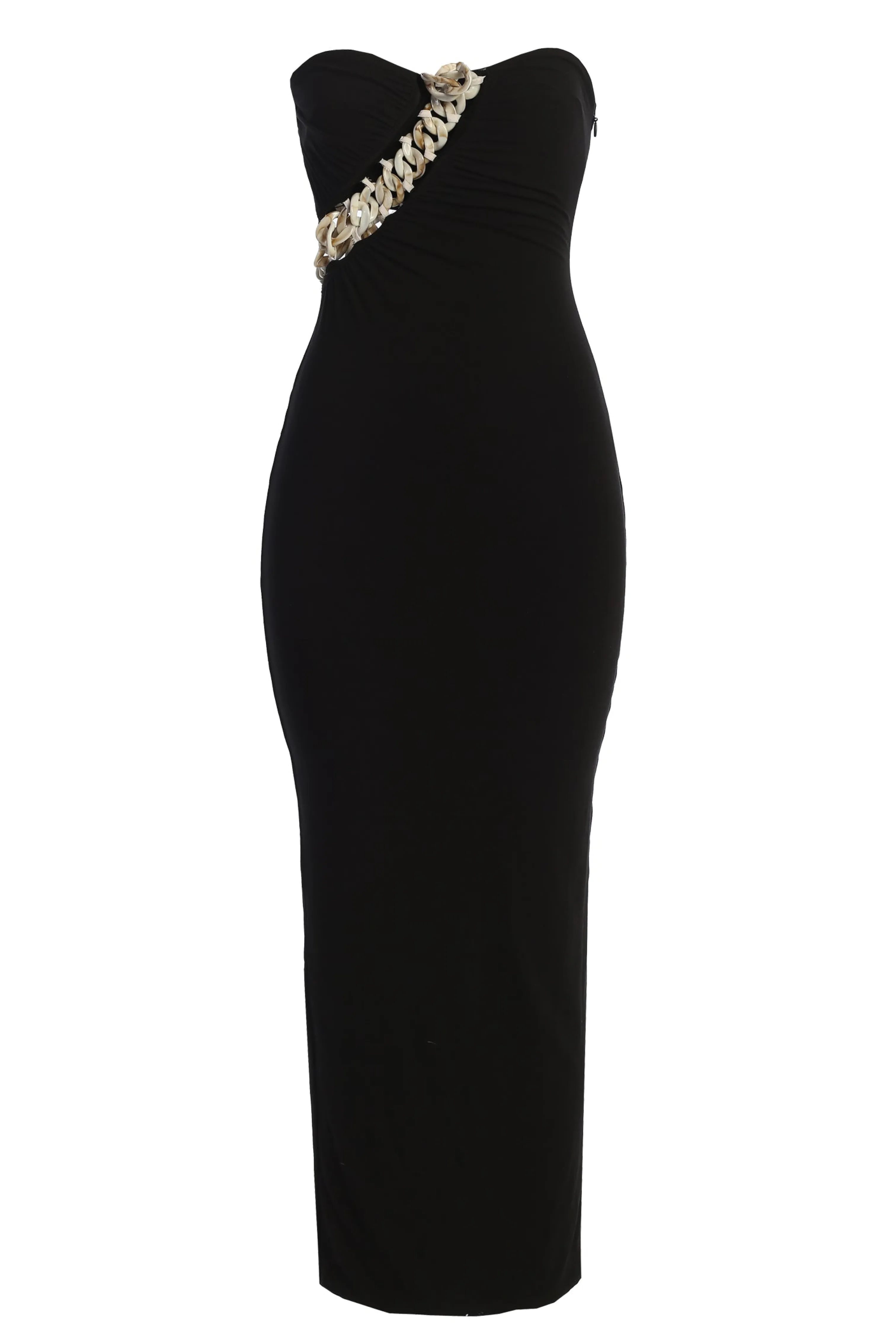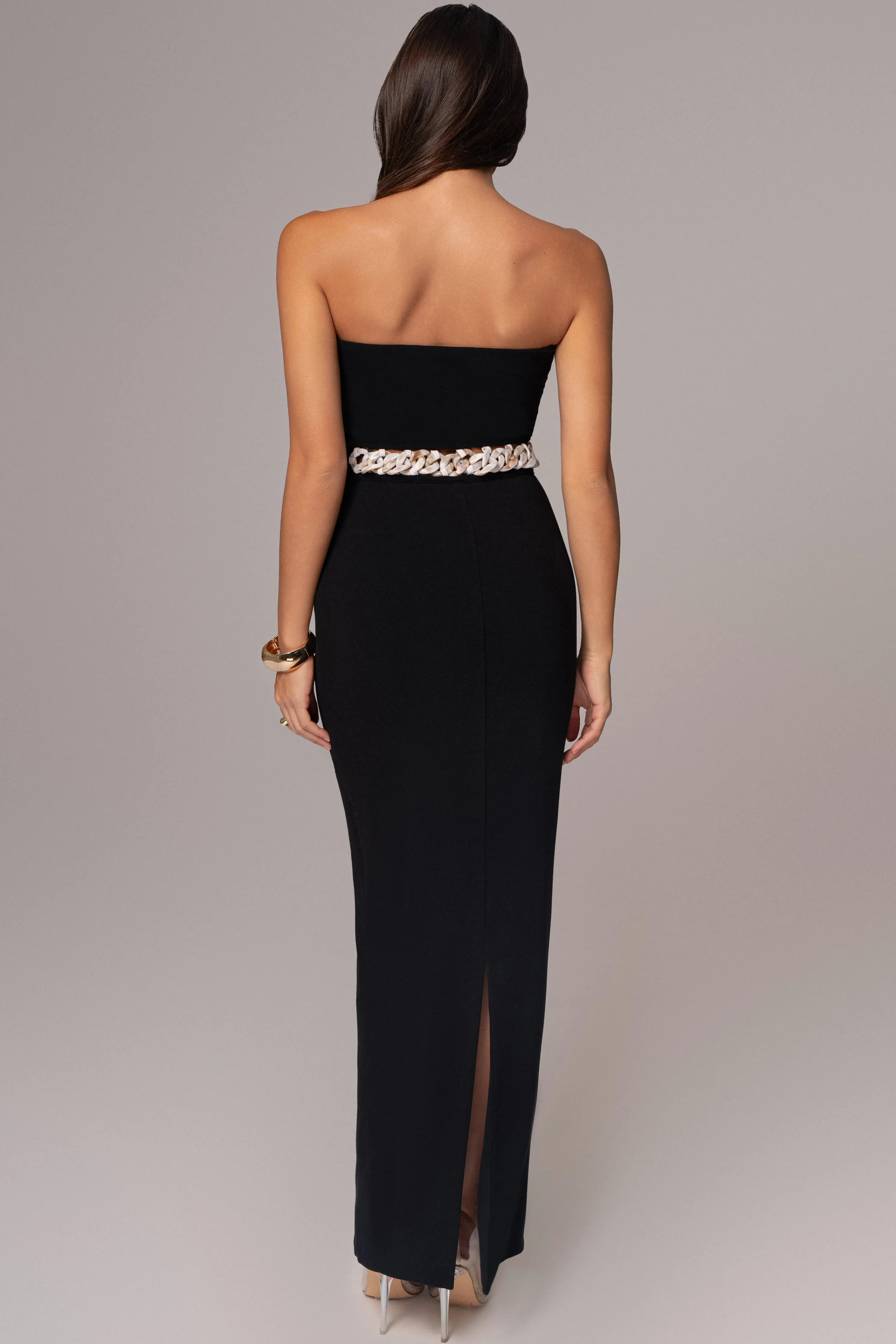 Experience the elegance of Fall with our Black Clarisse One Shoulder Dress. Made with double lining and slight ruching, this strapless maxi dress is adorned with an acrylic chain down the center and across the back for added elegance. Complete with a back slit and non-slip silicone at the bust for a secure hold all day long. Side zipper closure. Stretchy.