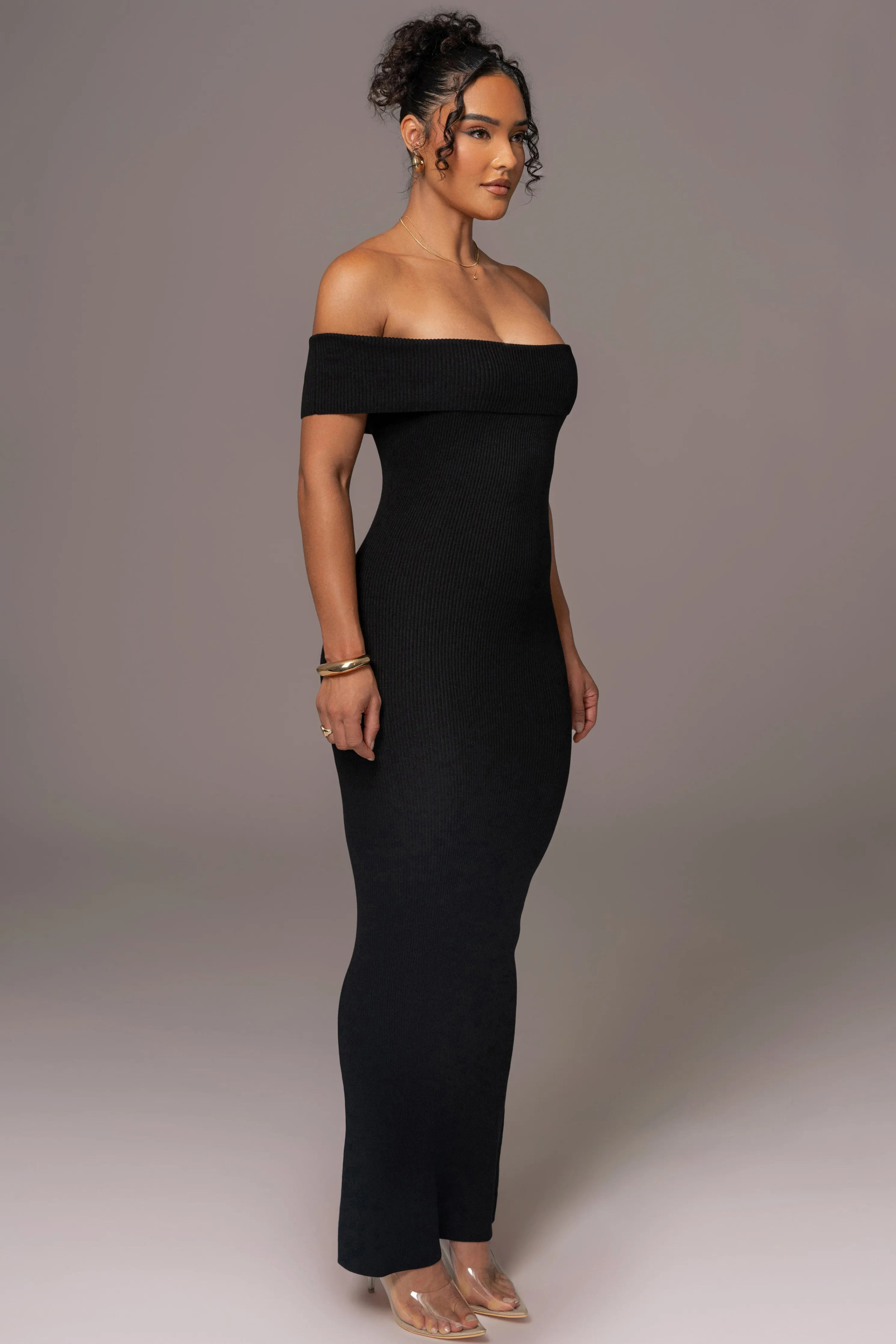 Redefine timeless elegance with our Black Custom Striped Maxi Dress. Crafted from a ribbed fabric, this timeless maxi dress features an off shoulder neckline with a timeless solid black design. Single lined. Stretchy.