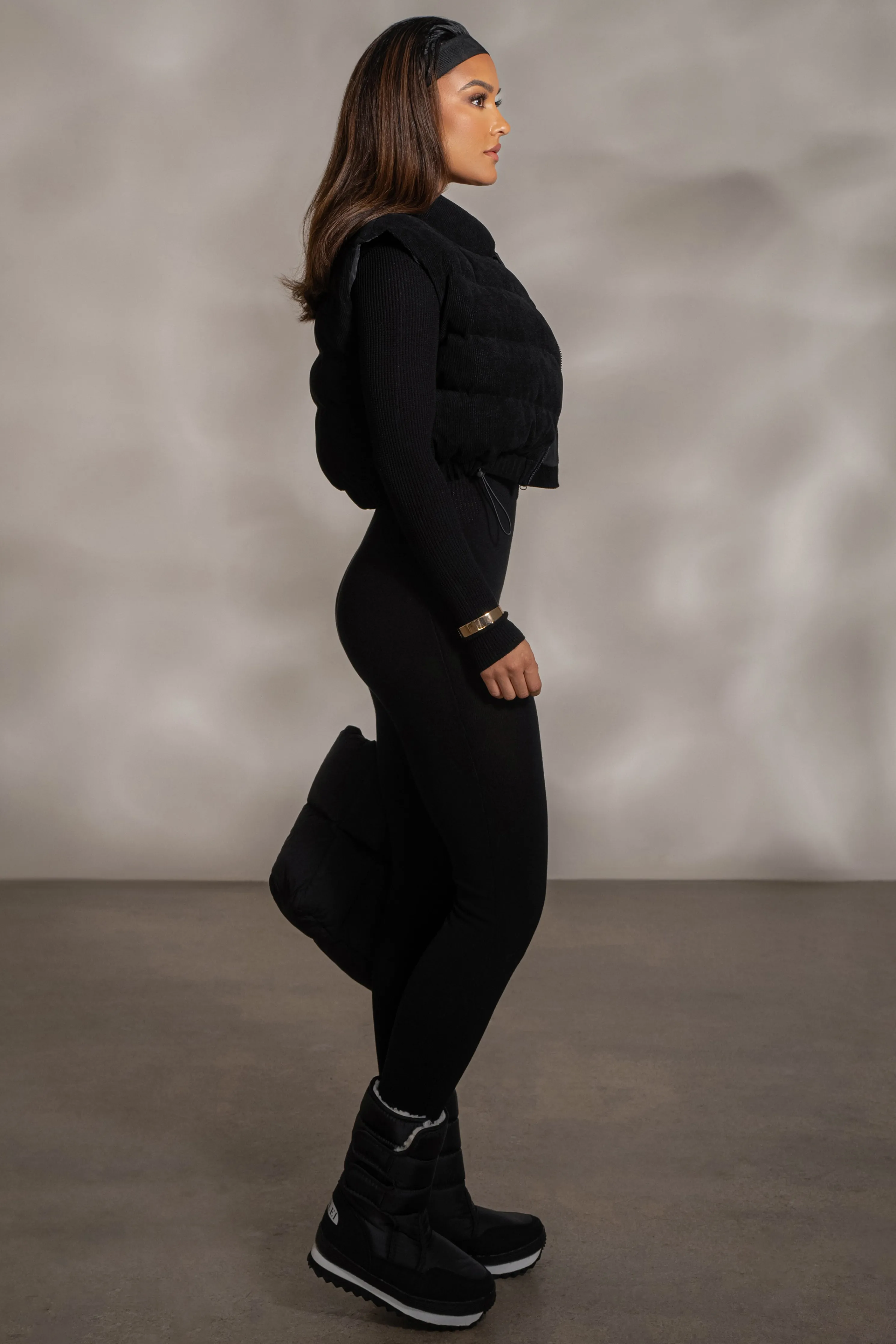 Elevate your winter wardrobe with our Black Delma Ribbed Puffer Vest. Tailored from soft corduroy fabric, this sleeveless puffer vest showcases a high neckline withbungee cords at the hem for a customized fit. Front zipper closure. Pair with ourKris Front Zipper Jumpsuit for the full look. Minimal stretch.