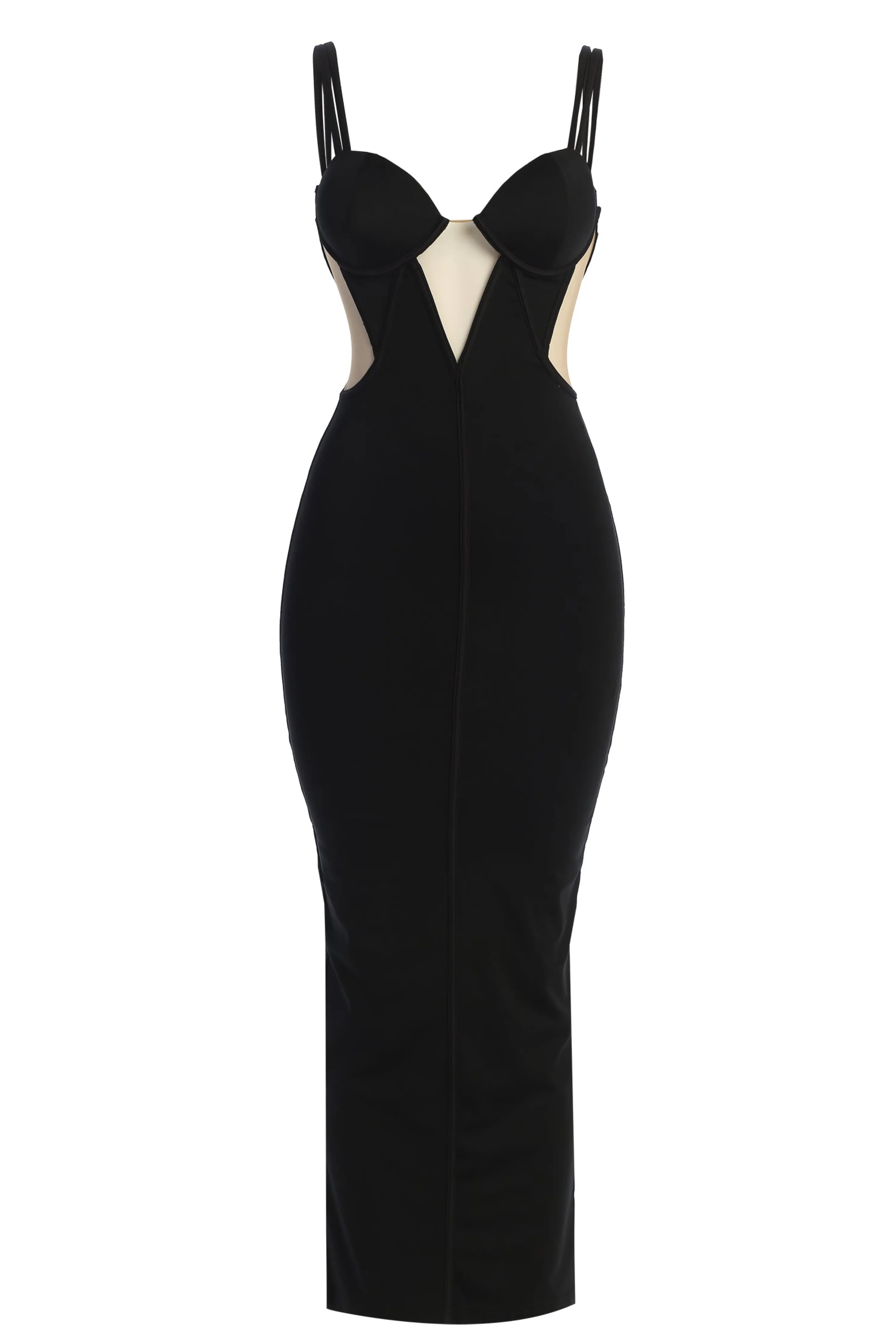 Our Black Enchantment Bustier Maxi Dress is a statement-making piece with delightfully intricate details. Crafted from luxurious fabric, this stunning dress featuresa bustier-inspired designwith a built-in bra for asecure andelegant fit. Contrasting mesh panels adorn the top waist for a contemporary anddaring touch. Complete with adjustable shoulder straps, padded/wired cups, and back zipper closure. Double lined. Medium stretch.