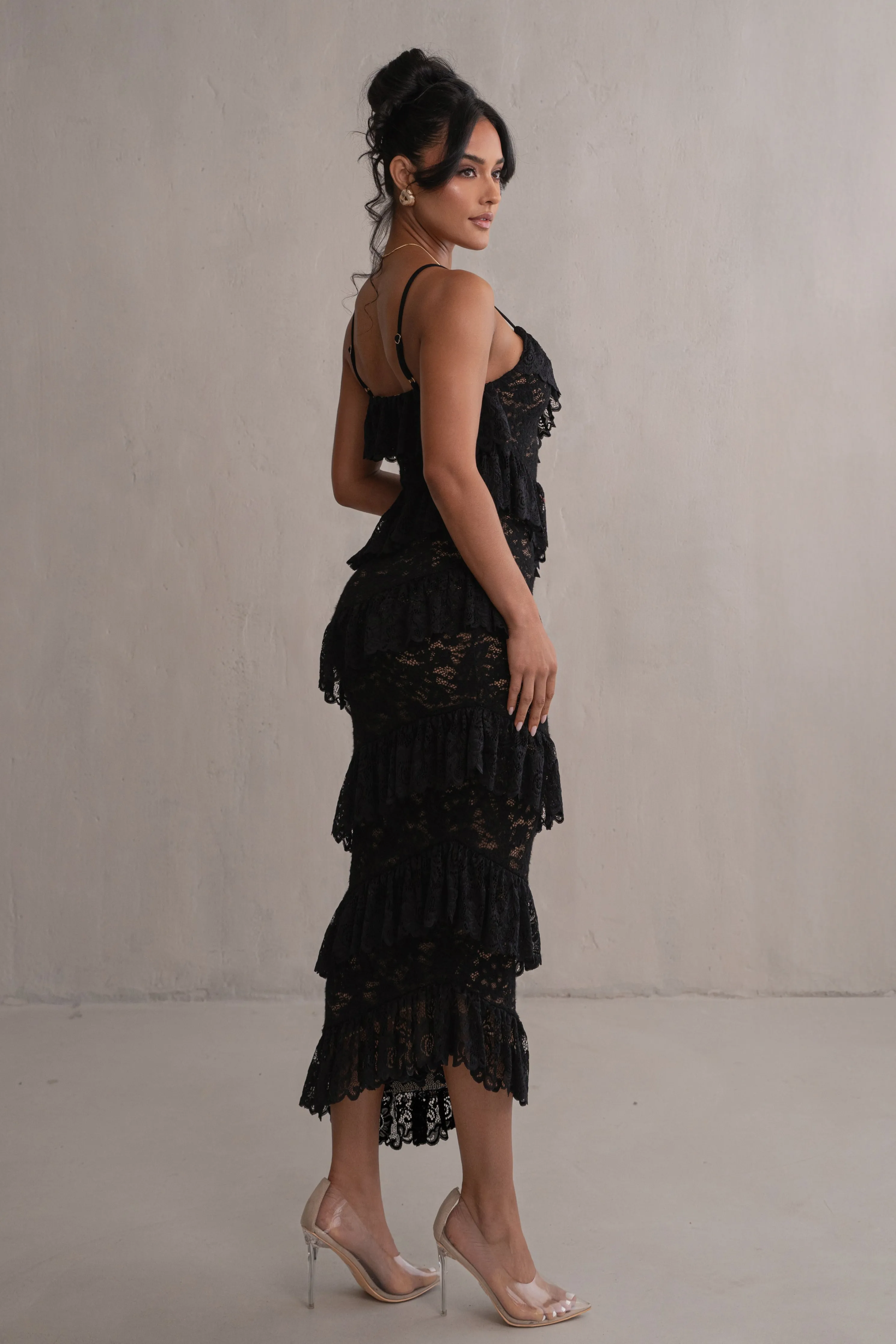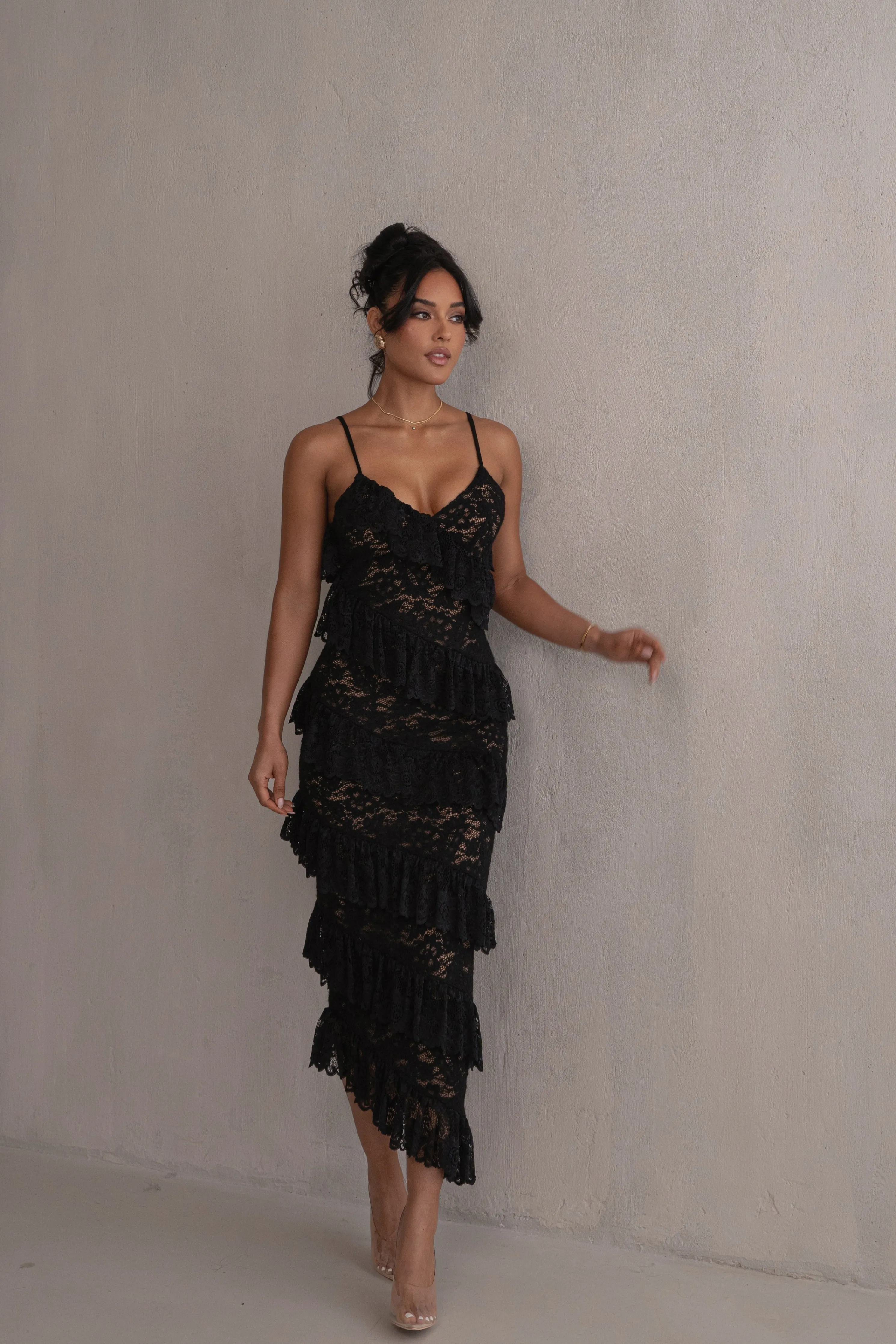 Designed for the JLUXLABEL Bridal Collection. Introducing the Black Feeling Of Forever Ruffle Dress, a masterpiece of elegance. Crafted from delicate lace with a nude underlining, this maxi dress exudes ethereal beauty. Its captivating ruffles cascade in an asymmetrical pattern, adding a touch of romance to your look. With a v-neckline and adjustable shoulder straps, it offers a flattering fit. Medium Stretch.