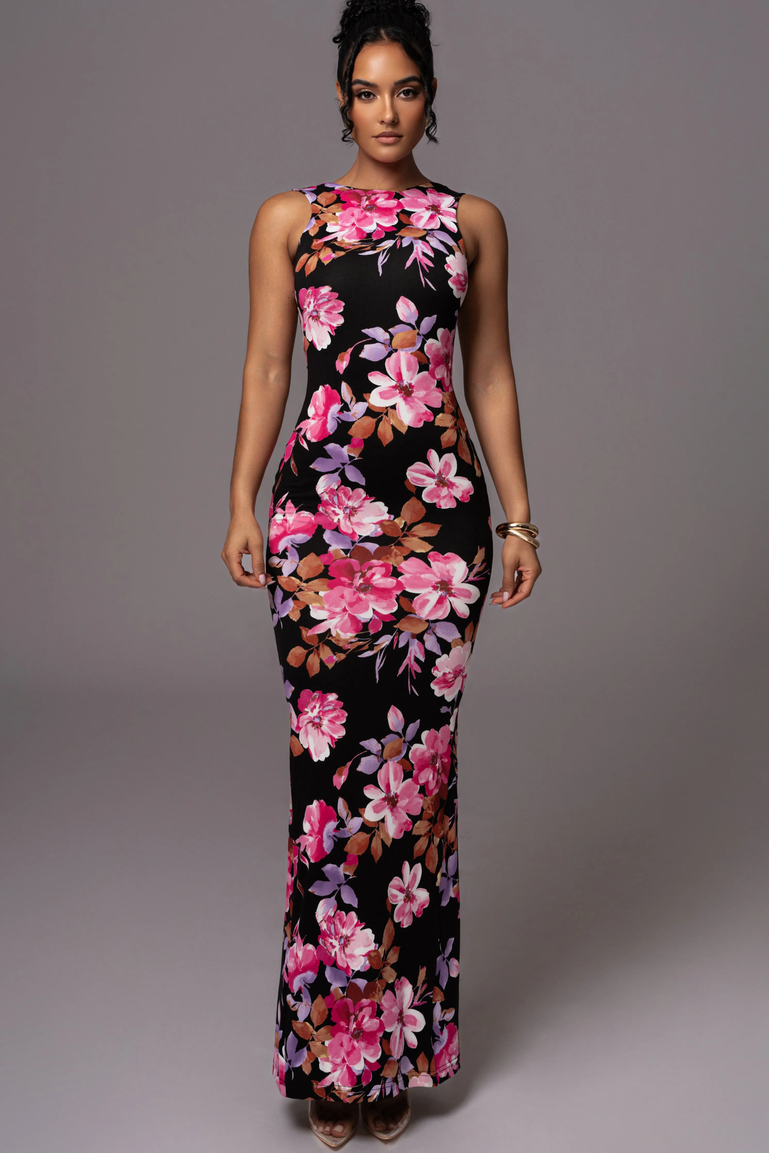 Our Black Floral Front and Center Maxi Dress gives Spring prints new meaning. One of our favorite dresses has been redesigned in a dreamy floral print adding a touch of nature to your wardrobe. Crafted from soft double lined fabric, this stretchy maxi dress features a fitted silhouette with classic neckline and an open back. Flattering ruching at the lower back heightens the allure of this design. Stretchy.