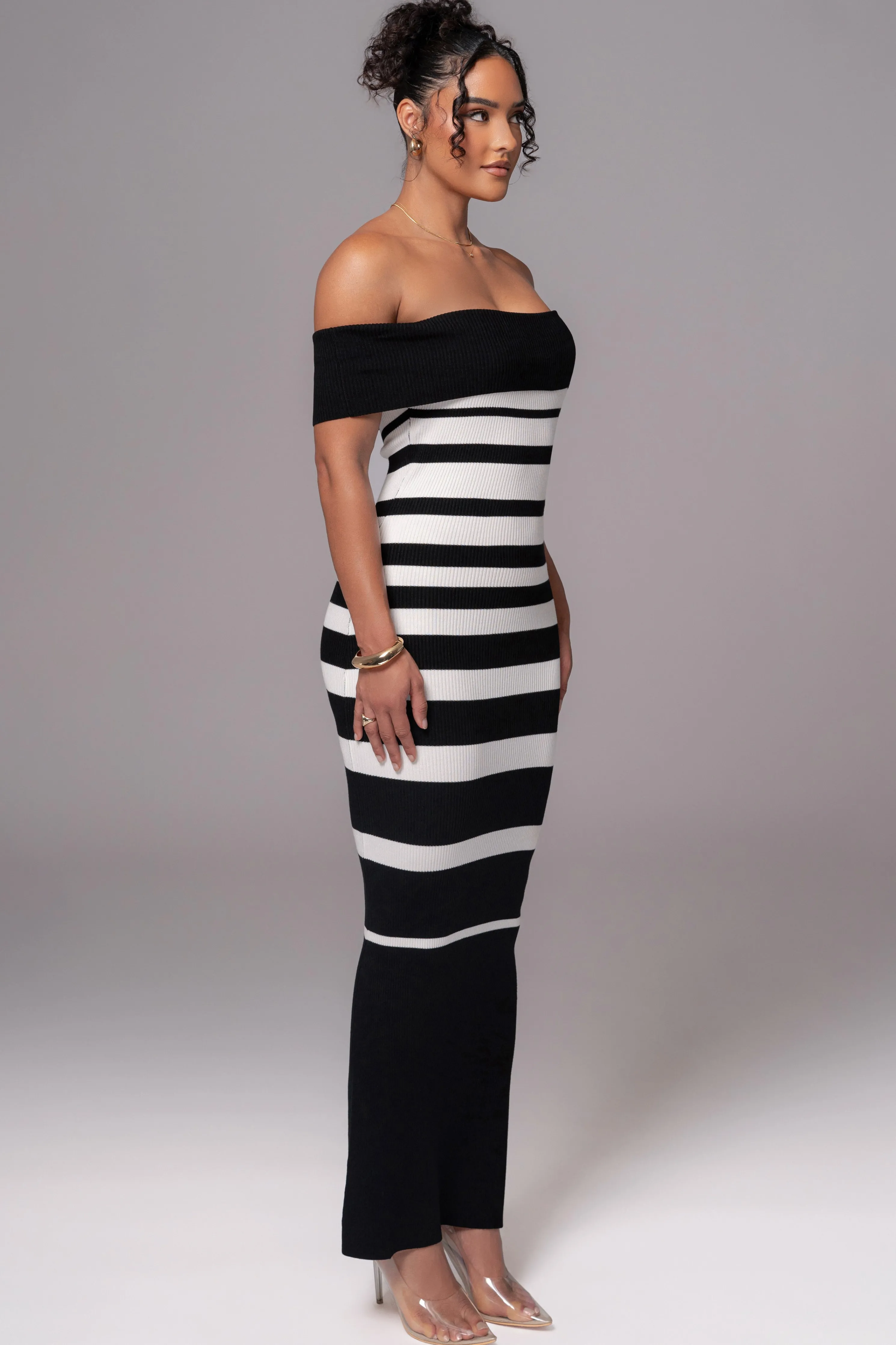 Redefine timeless elegance with our Black/Ivory Custom Striped Maxi Dress. Crafted from a ribbed fabric, this maxi dress features an off shoulder neckline with a timeless black and white striped design. Single lined. Stretchy.