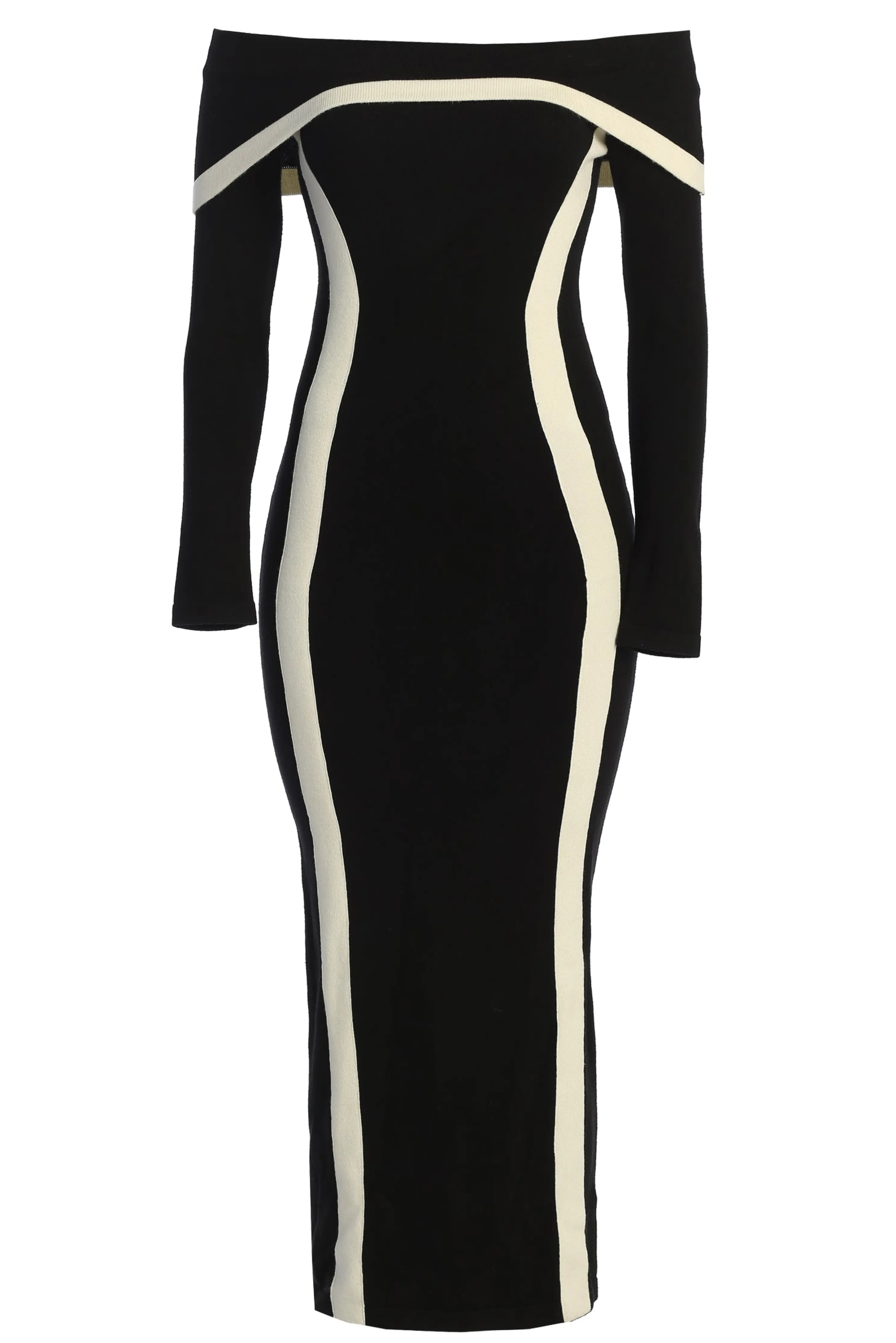 Be a vision of elegance and style in our Black Janet Off Shoulder Maxi Dress. Featuring a sophisticated contrast design with an off the shoulder neckline and fold-over edge. Crafted from a single lined knit fabric offering both comfort and style. Stretchy.