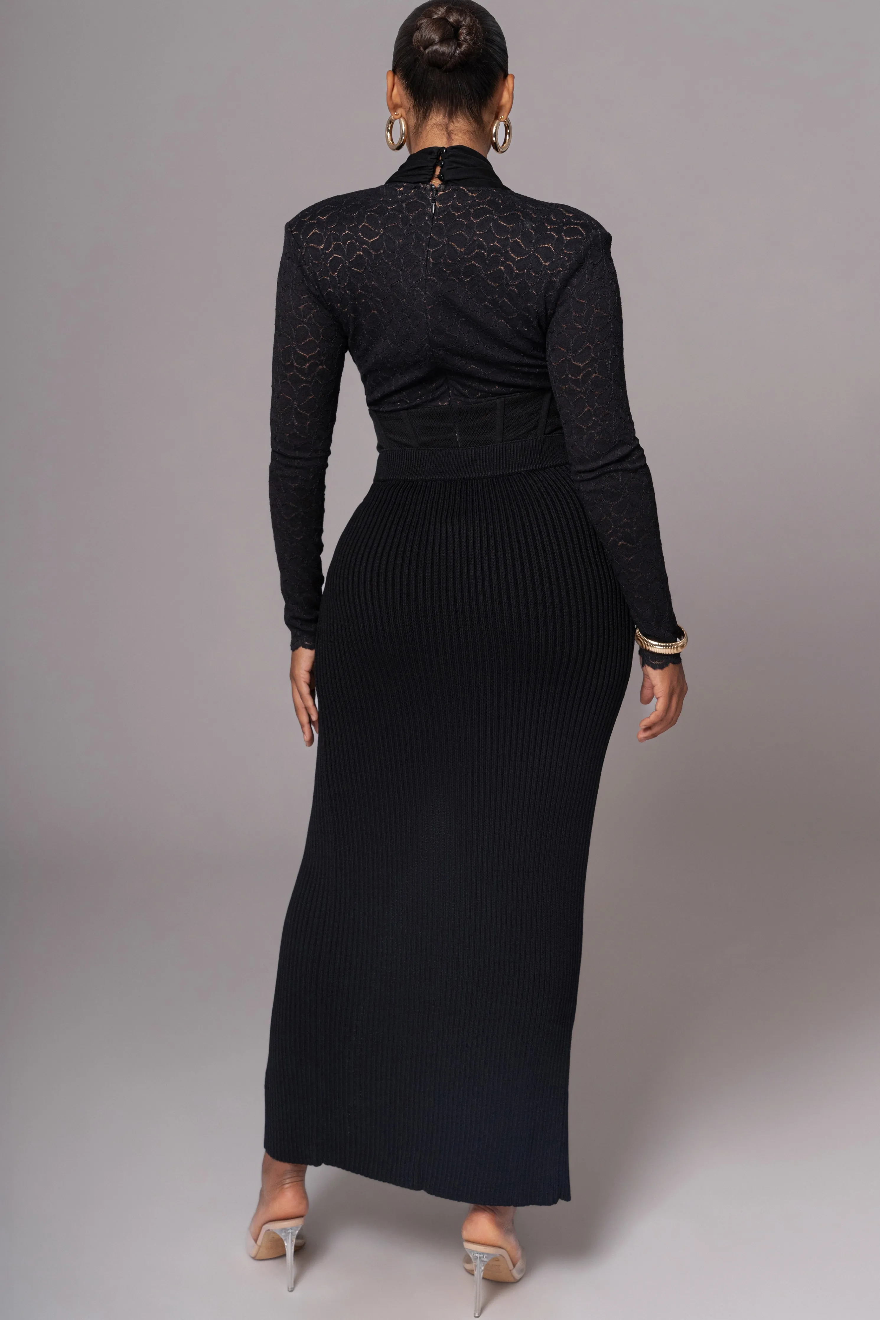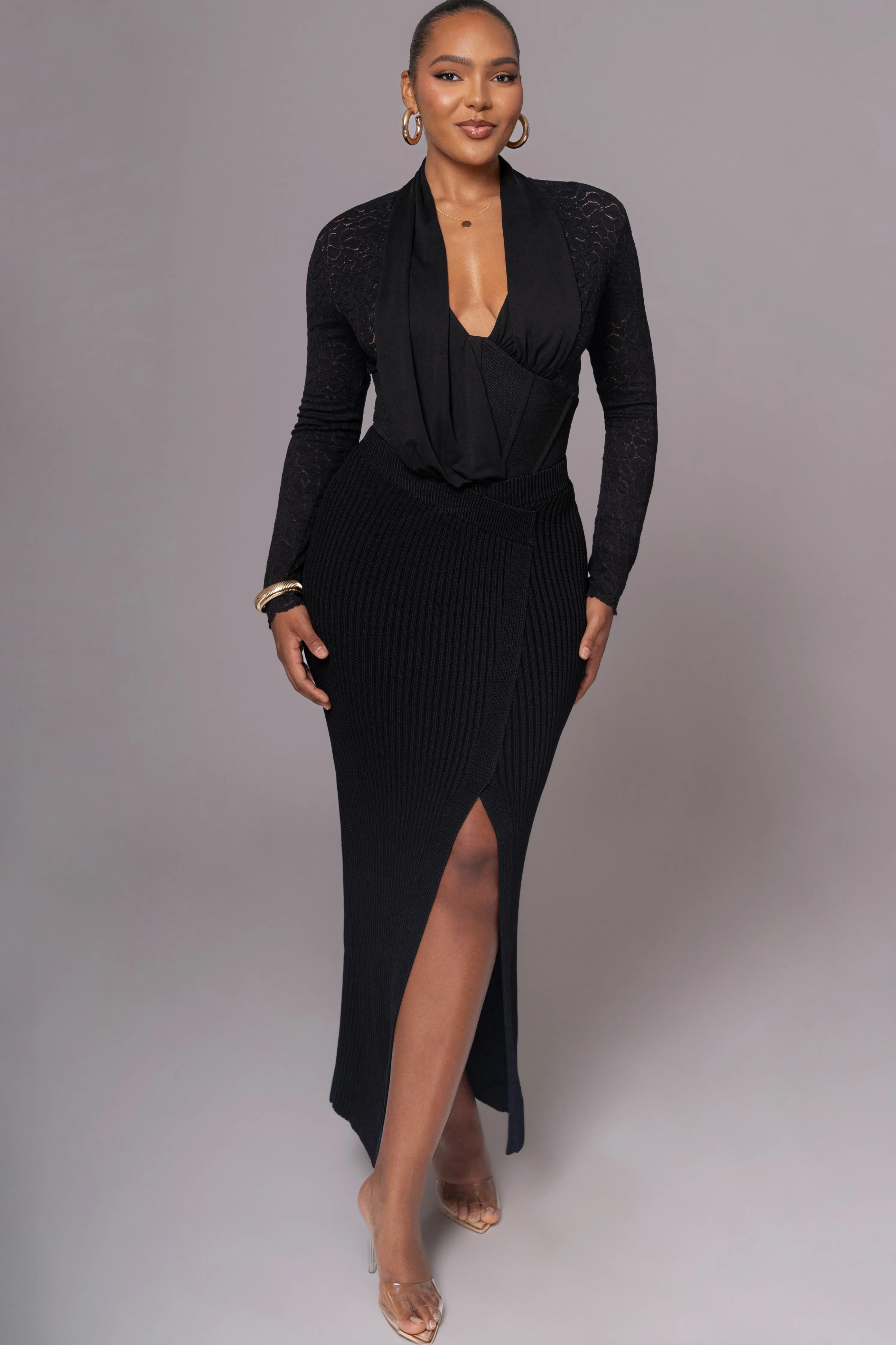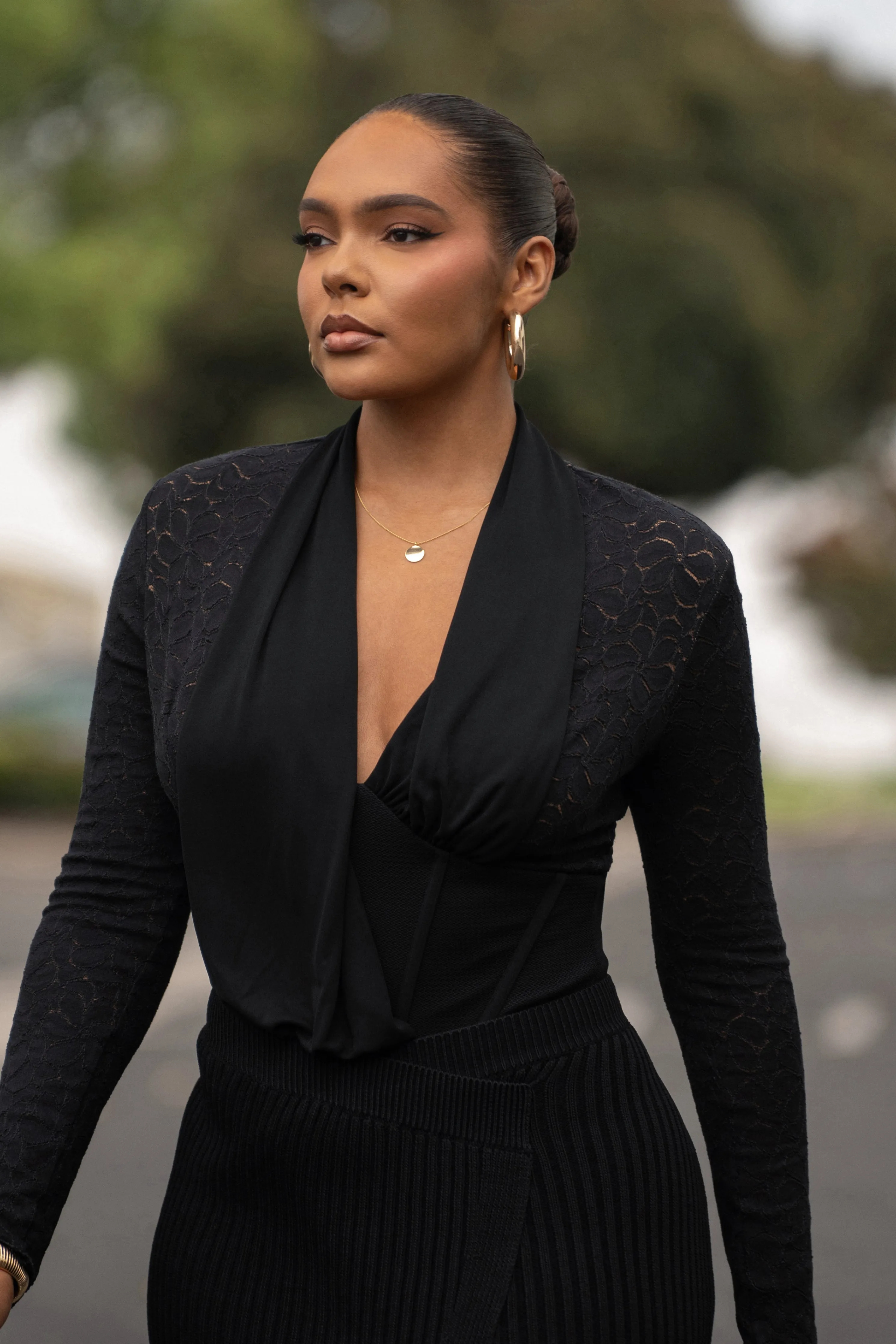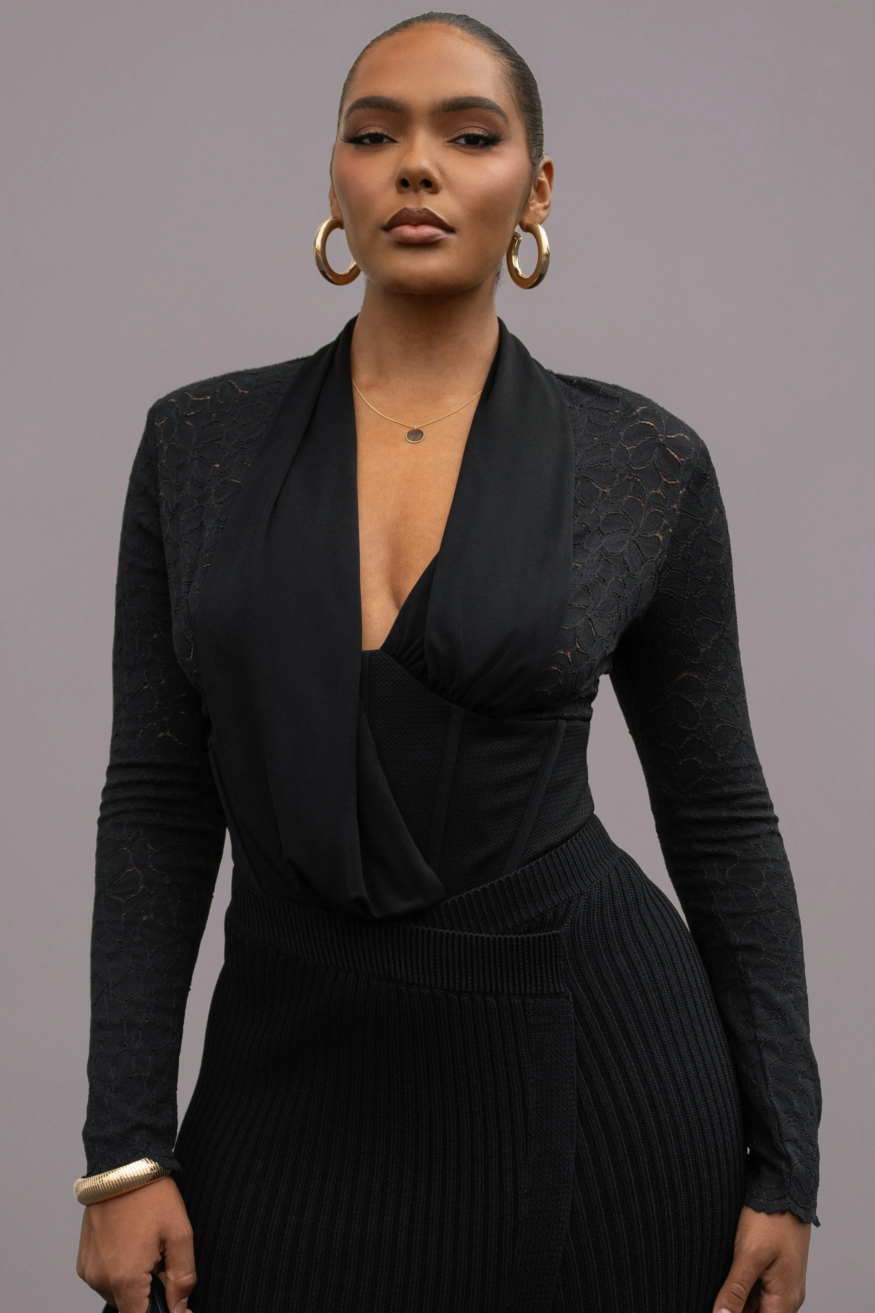Our Black Lace Corset Bodysuit offers a luxurious feel in a stretch lace material bringing a femme touch to your wardrobe. Featuring an elegant low drape neckline with fitted long sleeves, boning for structure, and a thong back with a double snap closure. The lower waist is crafted from a nude double-lined fabric for added comfort. Pair with our Hamptons Ribbed Slit Skirt for the full look. Minimal stretch.