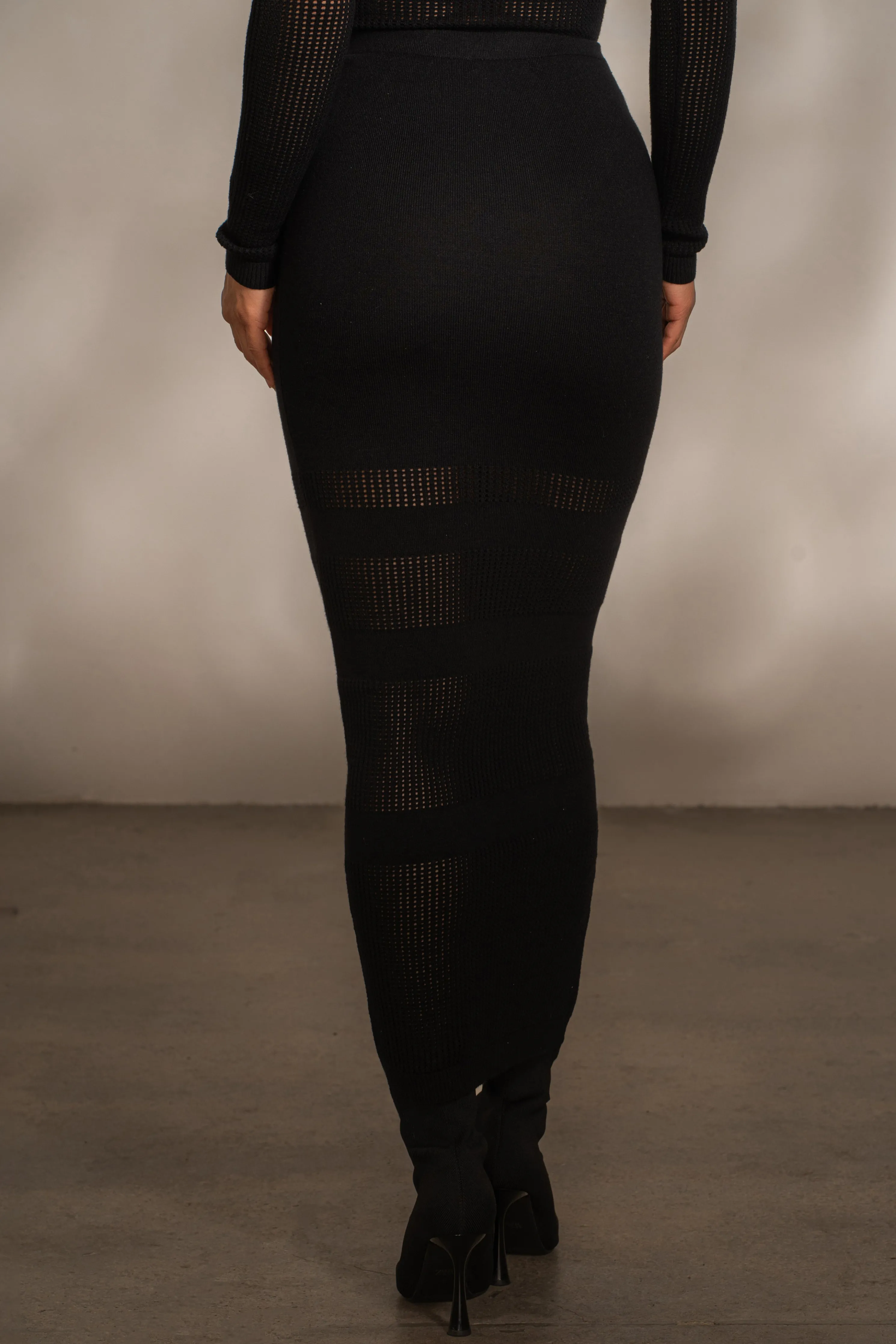 Indulge in unparalleled comfort with our Black Lina Knit Maxi Skirt. Crafted from soft ribbed sweater knit, our newest Winter skirt features a pencil style silhouette with an elastic waistband andmaxihem. Crafted in a contrast knit netting for contemporary style. Pair with our Klaudette Knit Bodysuit for the full look. Stretchy. Single lined. Not sold as set.
