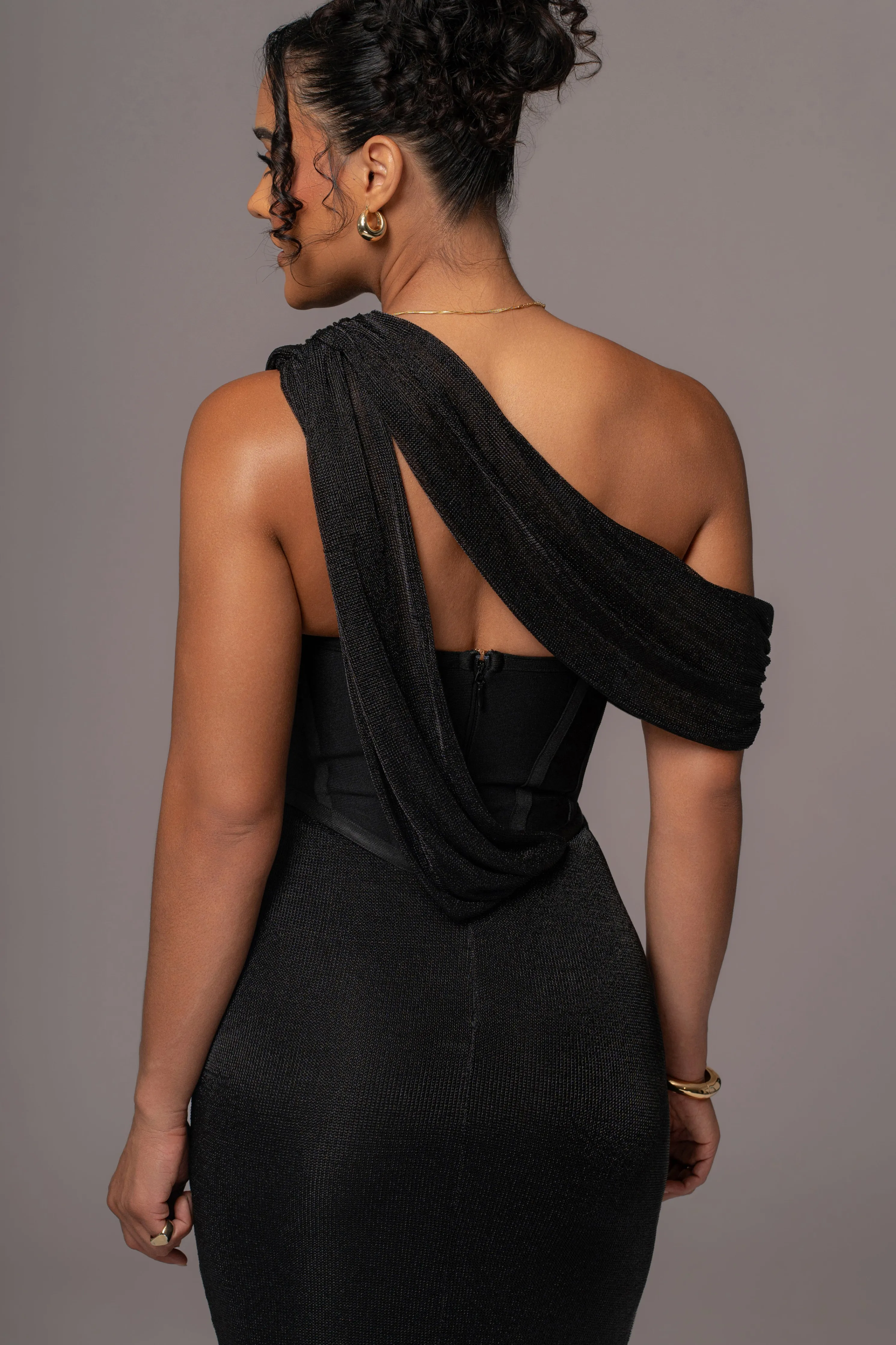 Our Black Metallic Celestina Draped Maxi Dress is sure to take your breath away with its asymmetric neckline, enchanting corset design, and elegantly draped waist. Crafted from a luxurious blend of bandage and metallic chain netting fabric, this stunning maxi dress features an adjustable shoulder strap, cup padding, and boning on each side for added structure. It’s finished with a back zipper closure and non-slip grip gel at the bust for a secure hold. Double-lined. Stretchy.
