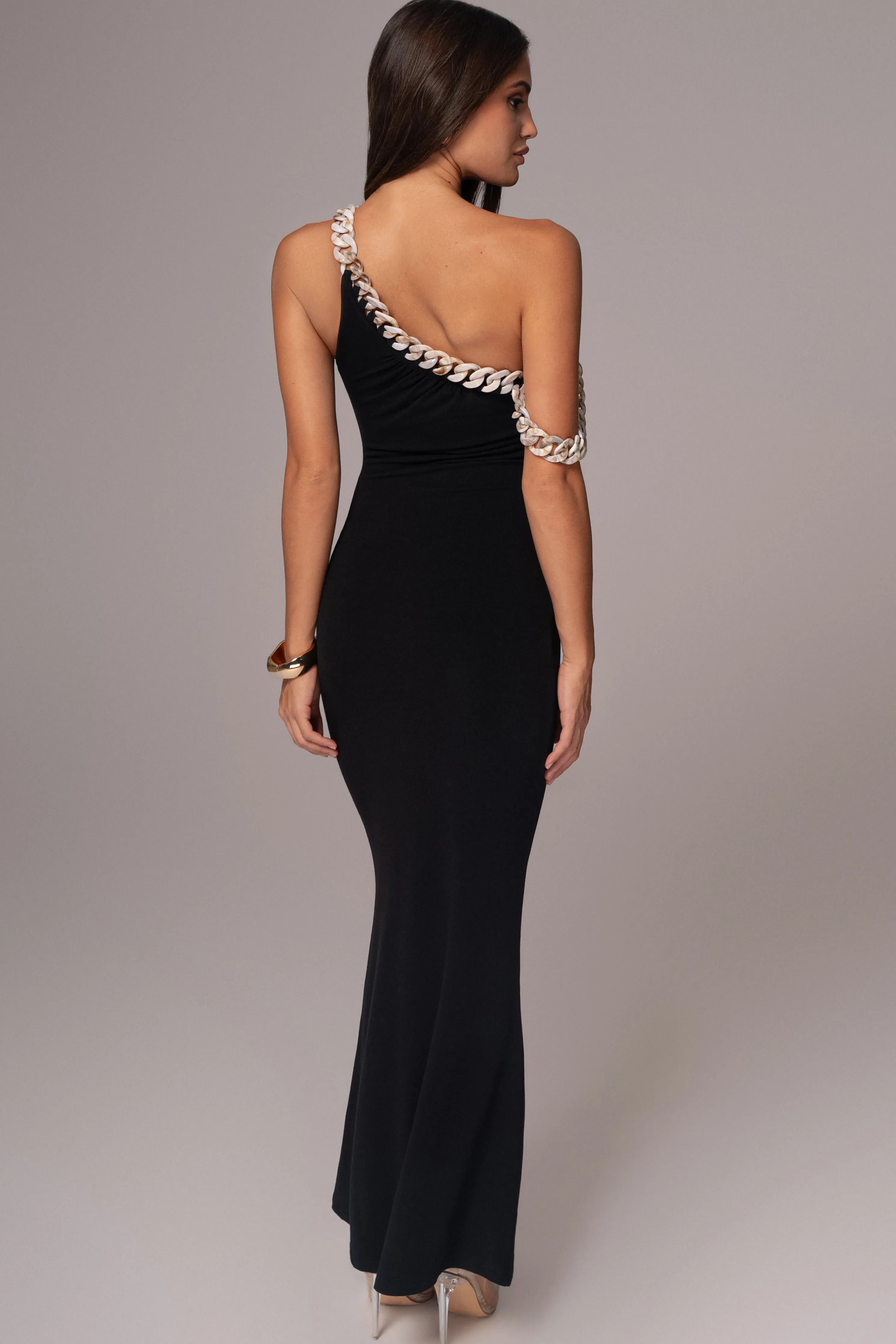 This season, redefine your style with our Black Monette Asymmetric Dress. This stunning maxi dress features an asymmetrical neckline with subtle ruching and elegant acrylic chain straps for added sophistication. Crafted from a soft double lined fabric ensuring a comfortable and flattering fit. Stretchy.