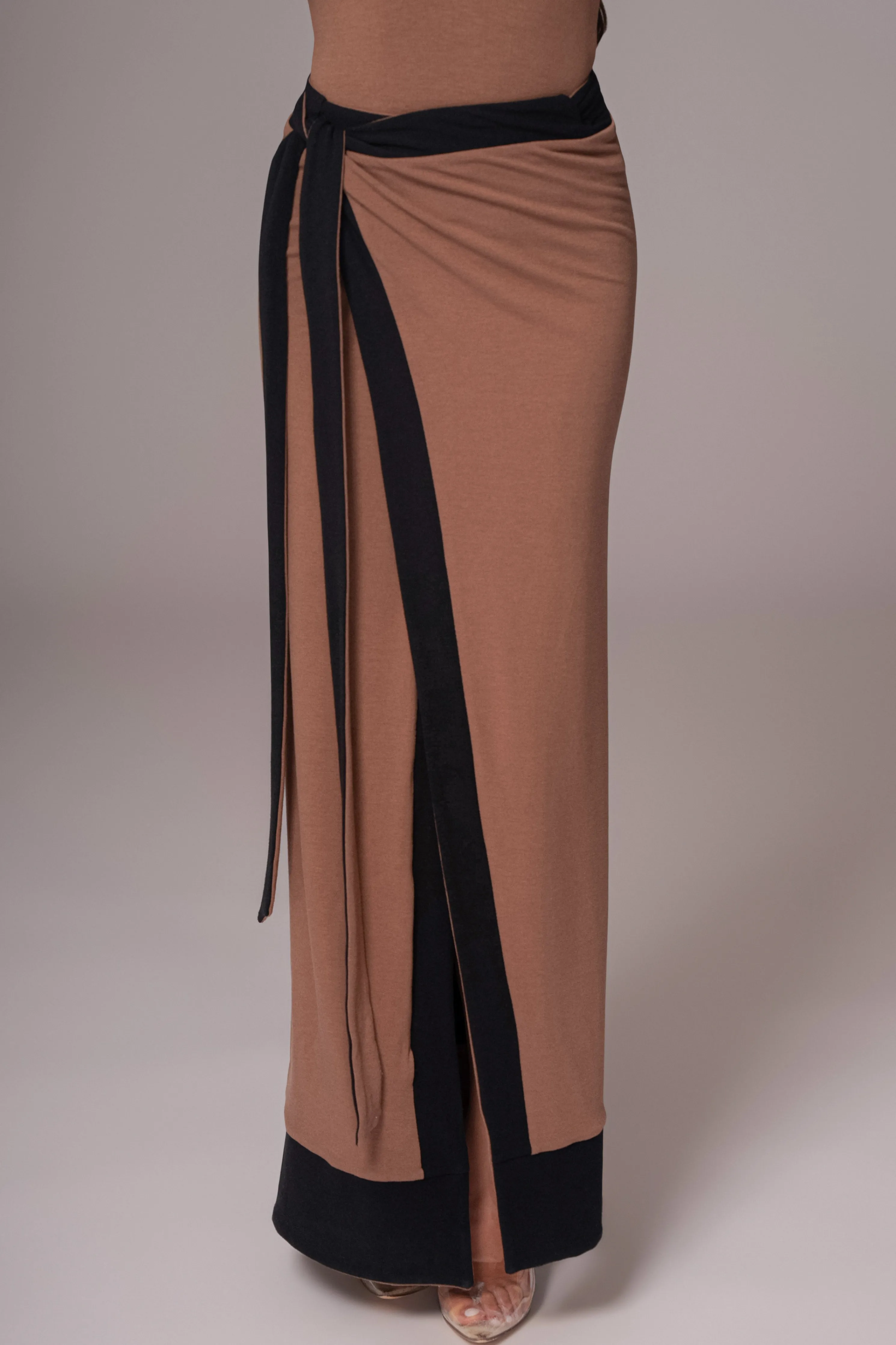 Unlock a world of style & versatility with our Reversible Collection. Introducing our favorite set this season, the Black/Pecan Contrast Kamie Reversible Skirt Set. This reversible skirt set features a fully lined bodysuit with plunging v-neck, bow-tie shoulder straps, and a thong back cut. The matching skirt features a sarong style design with side bow-tie closure and a maxi-length hem. Crafted in a smooth double-lined fabric, this set can be reversed to reveal a new look in a pecan and black shade. Stretchy. Sold as set.