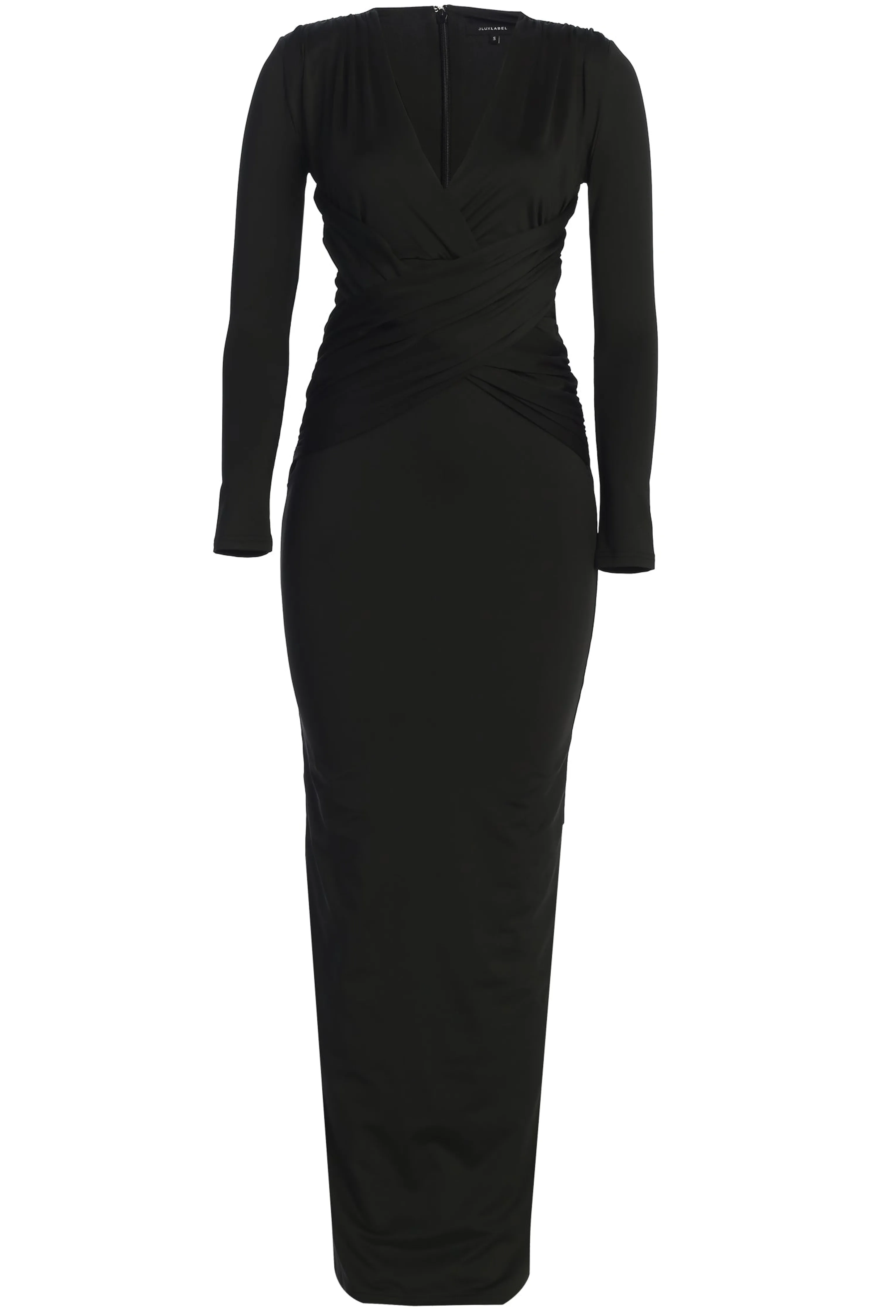 Experience sophistication at its finest with our Black Rowan Plunge Maxi Dress.Showcasing fitted long sleeves and a low v-neckline, this dress is accentuated with chic shirred detailing at the waist and a back slit hem. Craftedin smooth double-lined fabric, this elegant dressissure to become a timeless staple in your wardrobe. Stretchy. Back zipper closure.