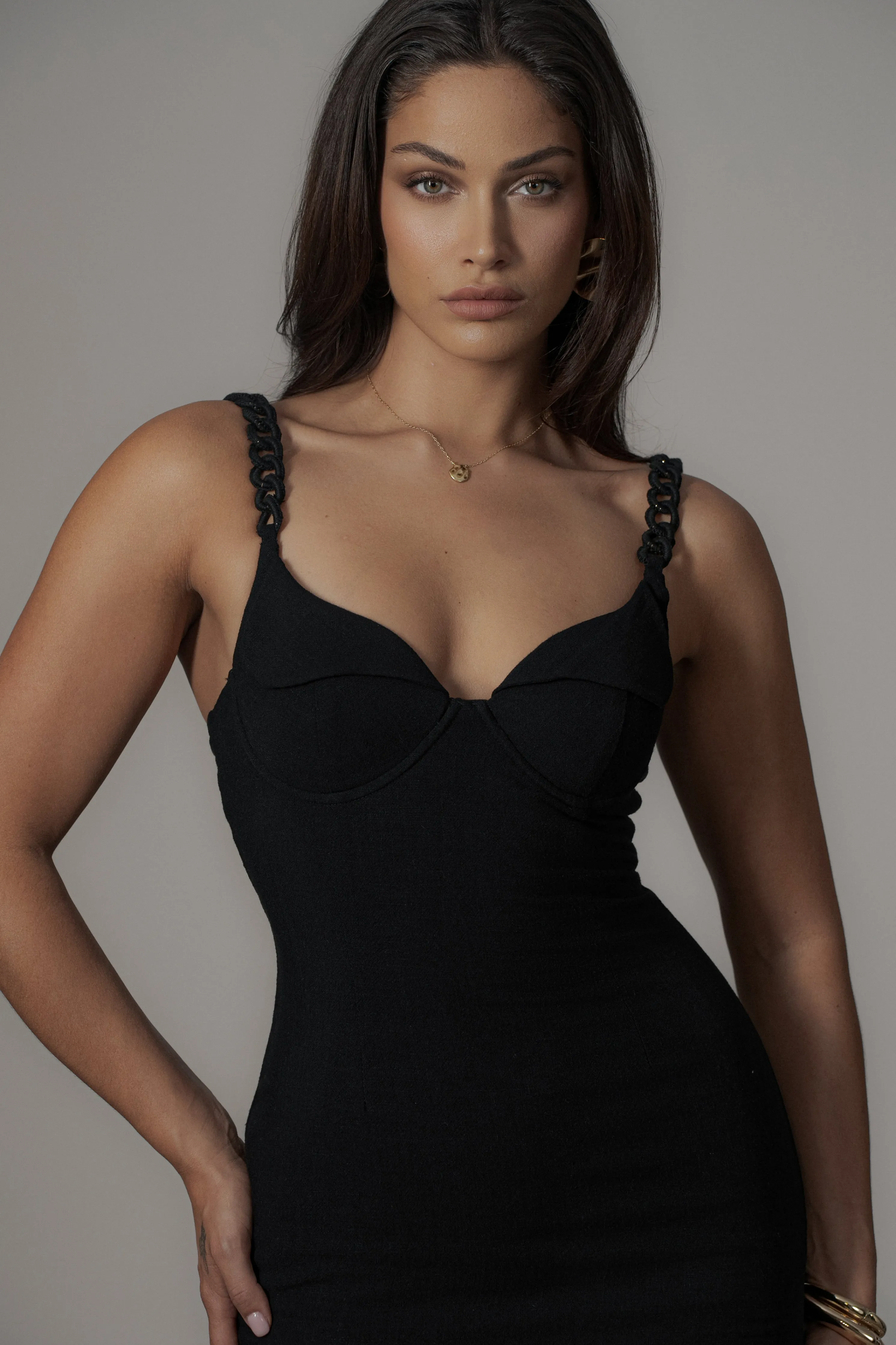 Escape in luxury with our Black Secret Hideout Linen Dress. Perfect for any occasion, this midi dress features a beautifully shaped fold over bust line, yarn-covered chain straps, and padded/wired bra cups. It’s finished with a hidden back zipper closure and a back-slit hem. Crafted from a fresh linen blend, perfect for summer outings. No stretch. Double lined.