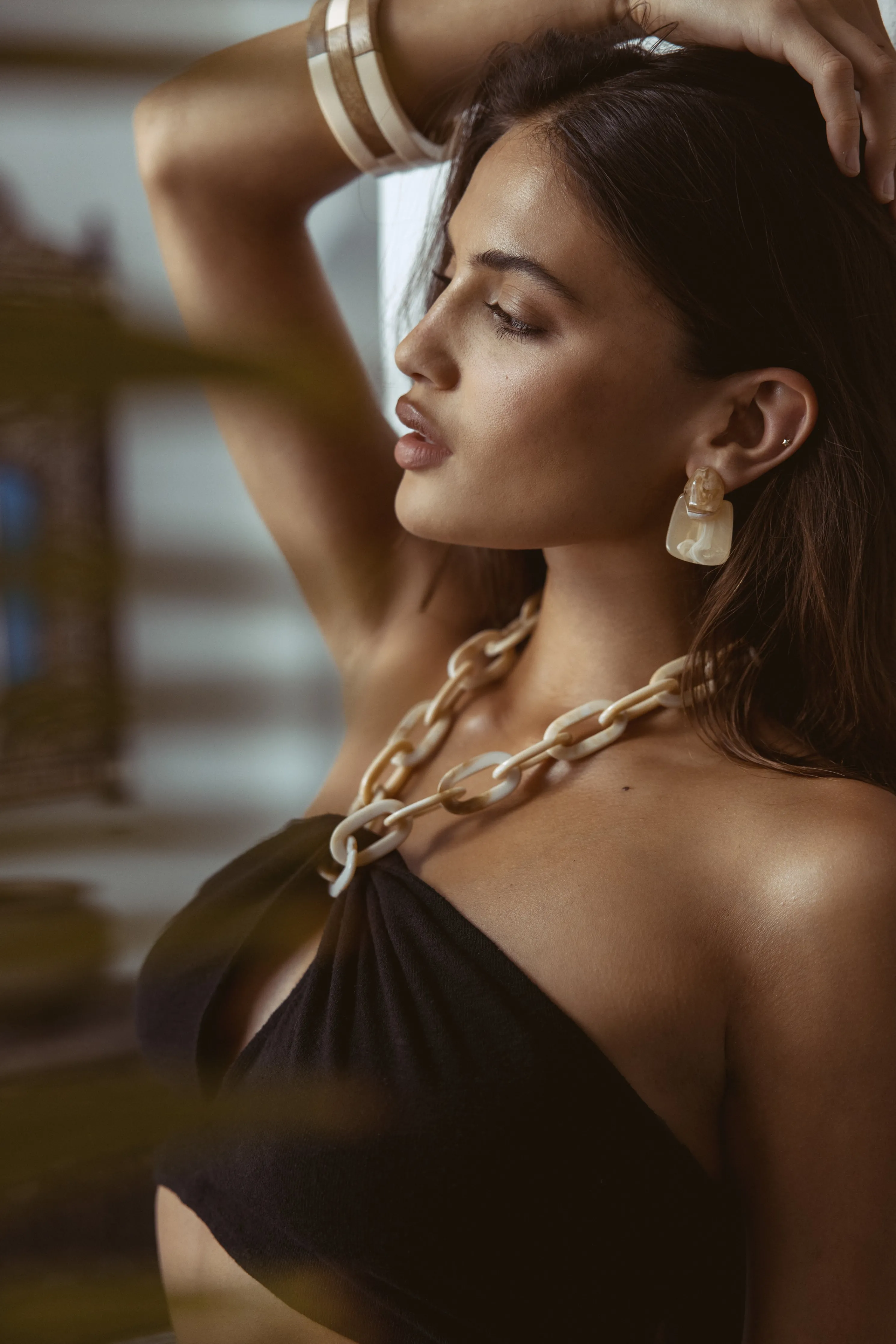 Embrace the luxury of summer days with our Black Summer Horizon Skirt Set. Made from a lightweight fabric, this two piece skirt set features a stylish crop top with removable marbled neck straps and a center keyhole. The matching skirt comes in a maxi hem and is adorned with a marbled chain strap, adding a touch of exclusivity to your summer wardrobe. Sold as set.