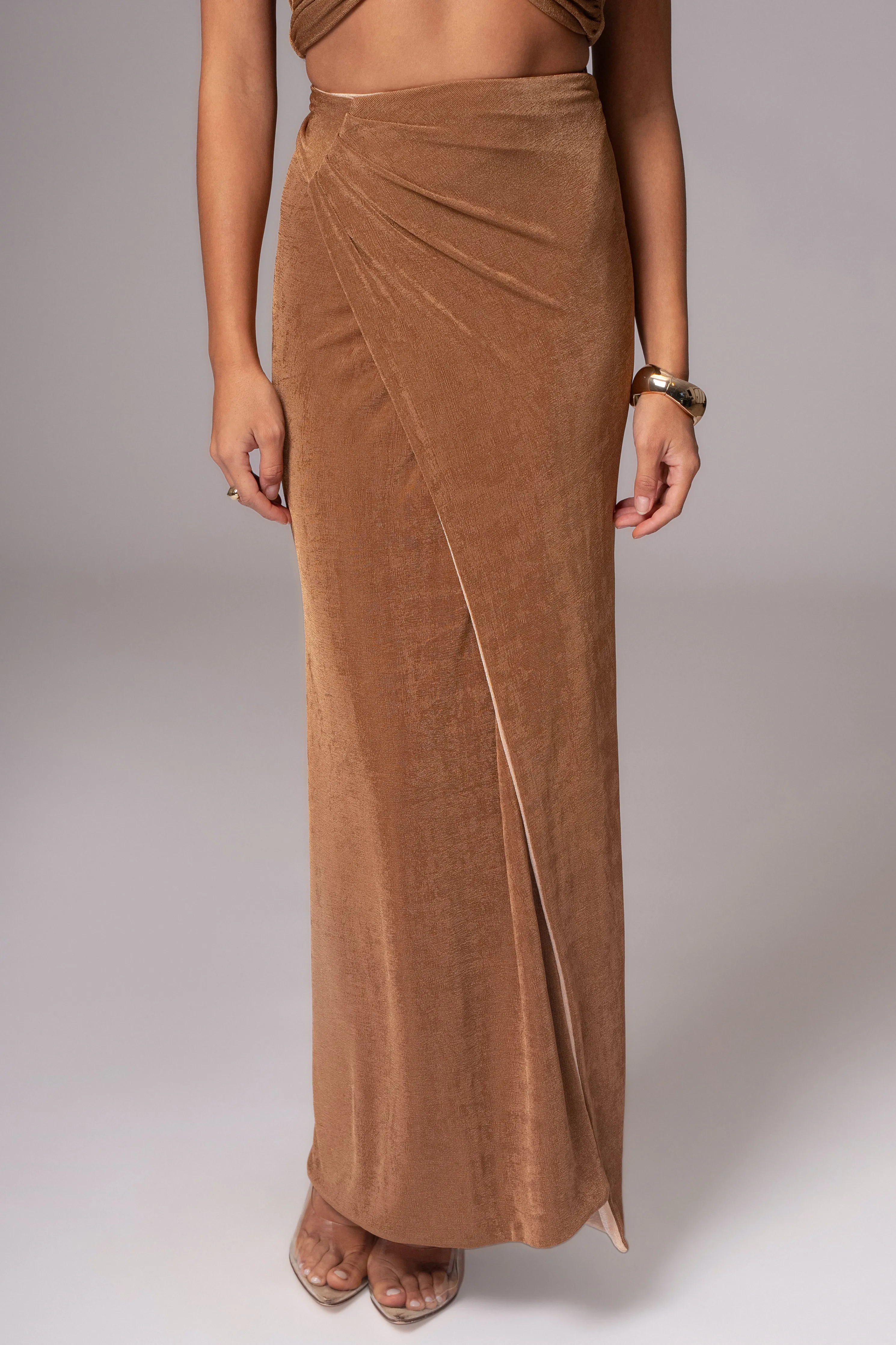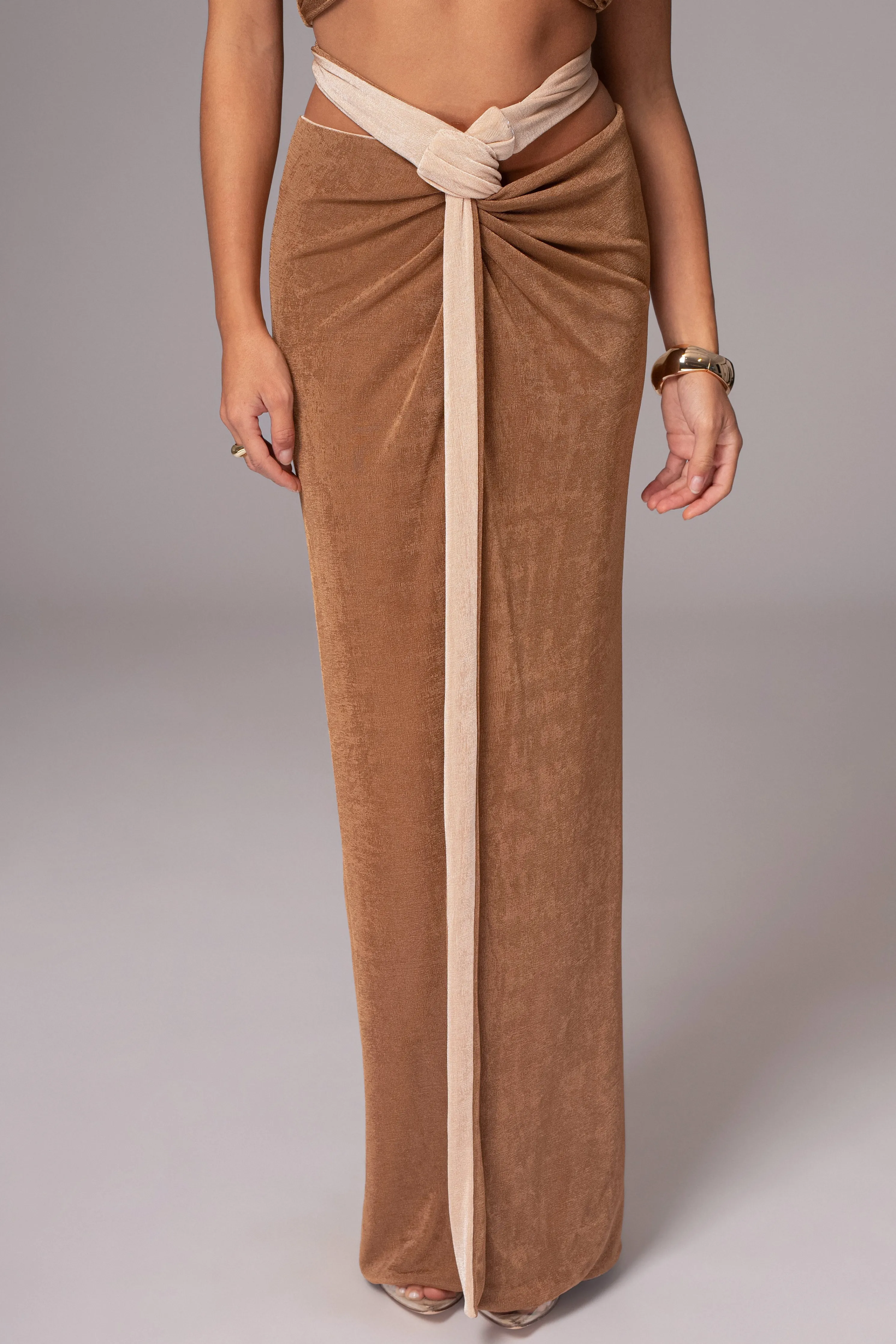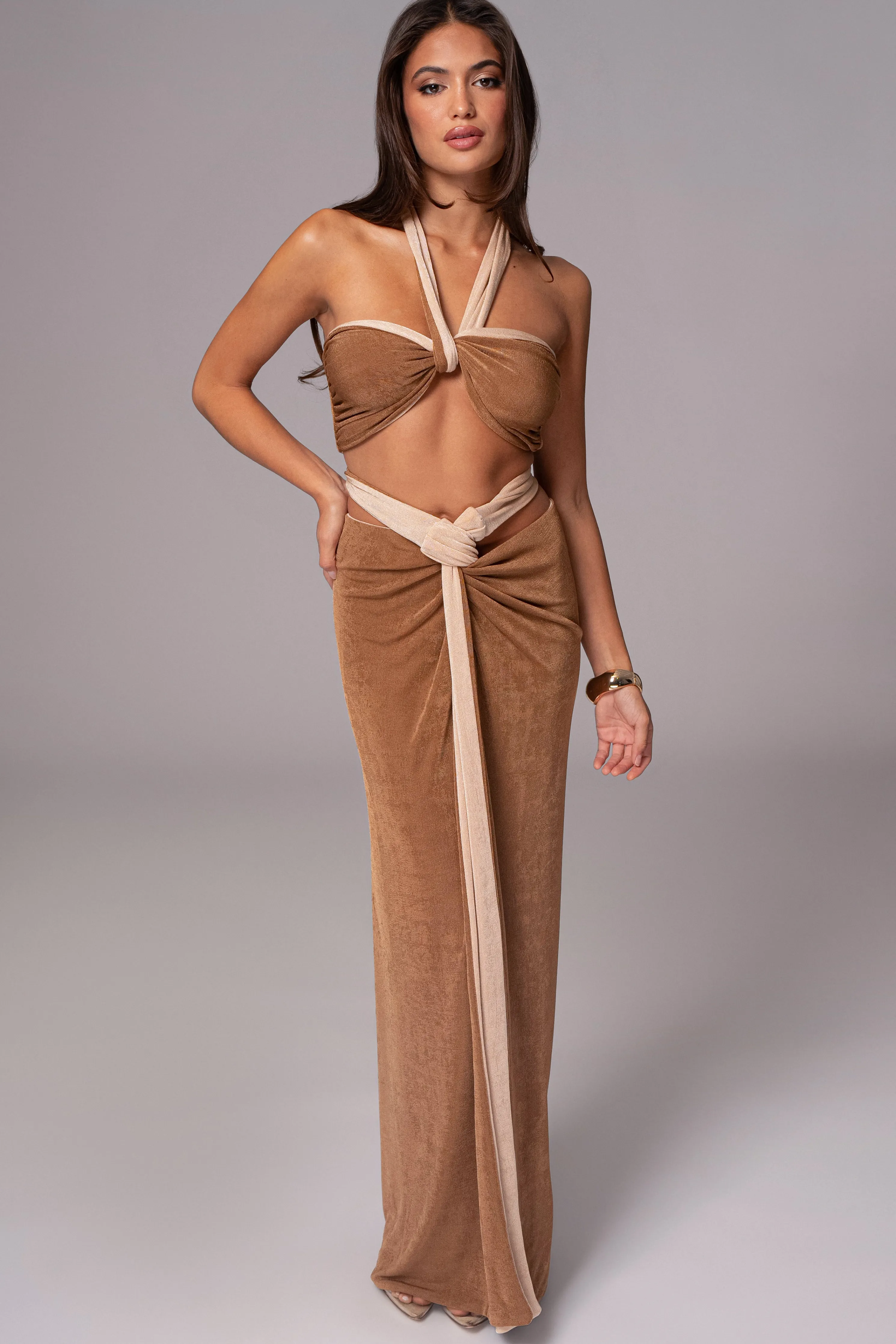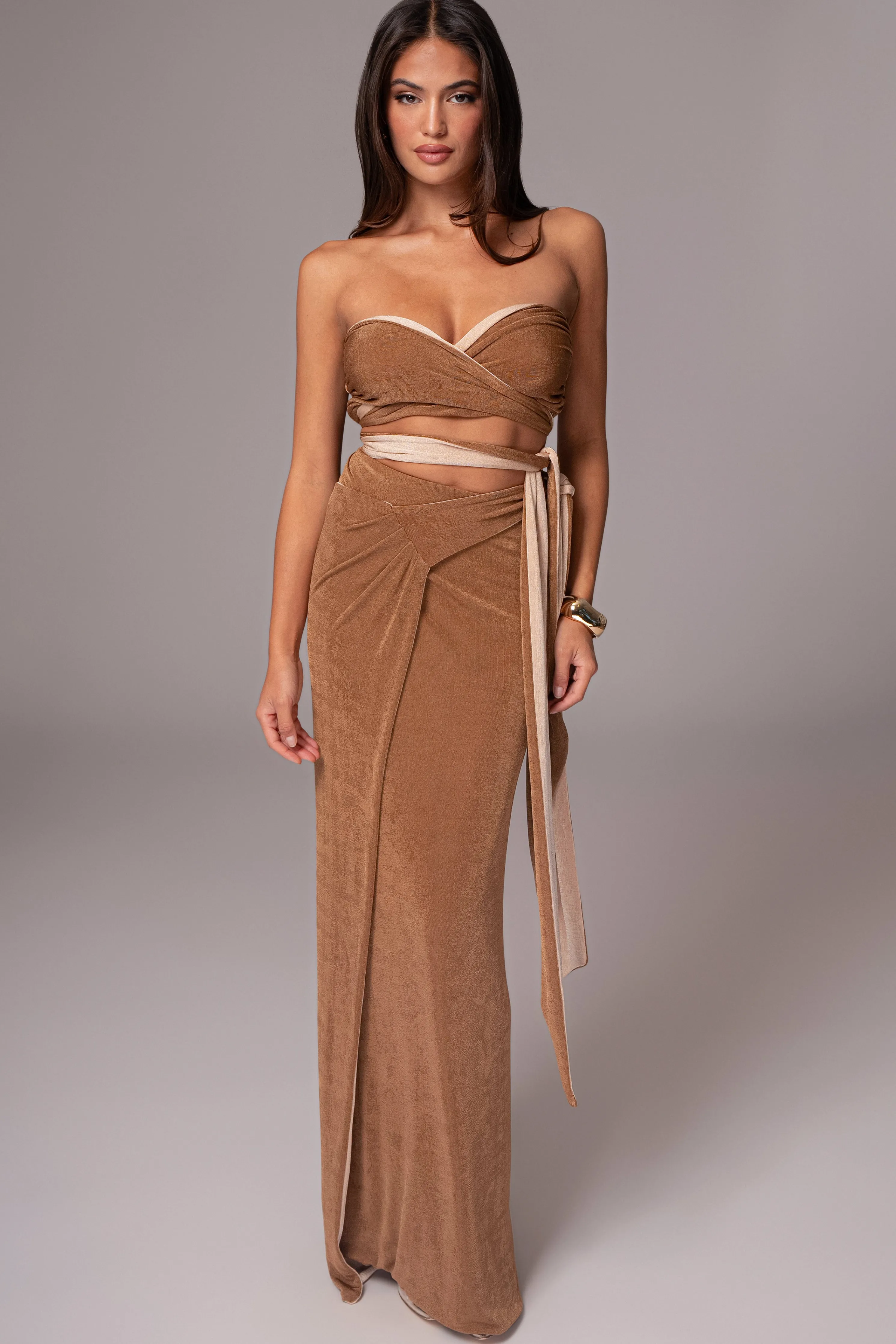 Unlock a world of style versatility with our Reversible Collection. Style meets versatility with our Brown/Beige Venus Reversible Skirt Set. This modern set includes a bandeau-style top with multi-way straps that can be wrapped in various ways for customizable looks. The matching high-waisted skirt features shirring and back tie straps that add a touch of elegance. Made from double-lined slinky fabric, this set can be reversed for a whole new look, giving you two styles in one. Sold as set. Stretchy.