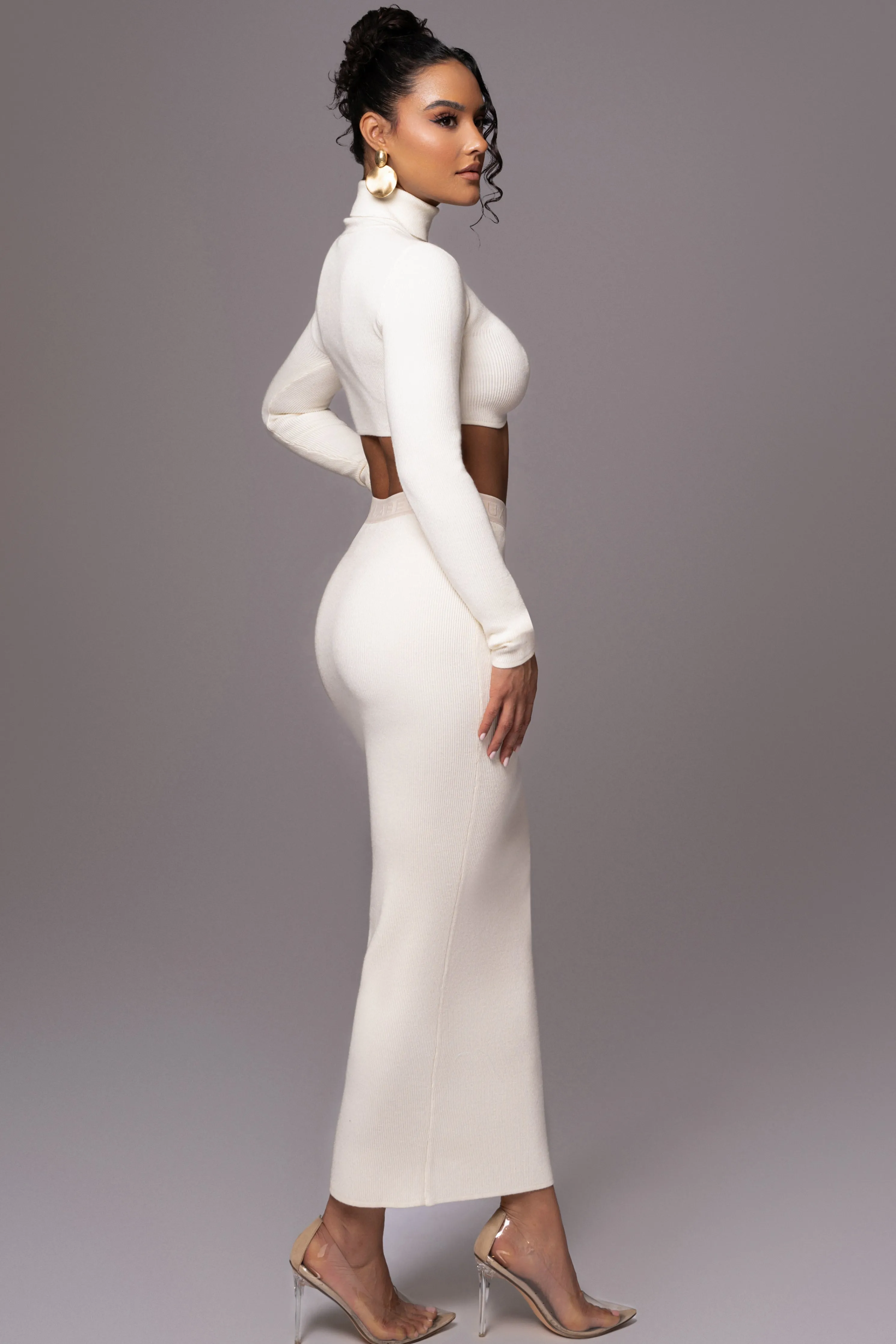 Our Buttercream Anise Ribbed Skirt Set is a winter essential. This versatile set includes a long-sleeve top with a turtleneck and cropped hem. The matching skirt highlights a pencil style silhouette with a high-waist and elastic waistband embossed with our Jluxlabel logo. Crafted from soft ribbed fabric, this set ensures comfort in any weather. Sold as a set. Single-lined. Stretchy.