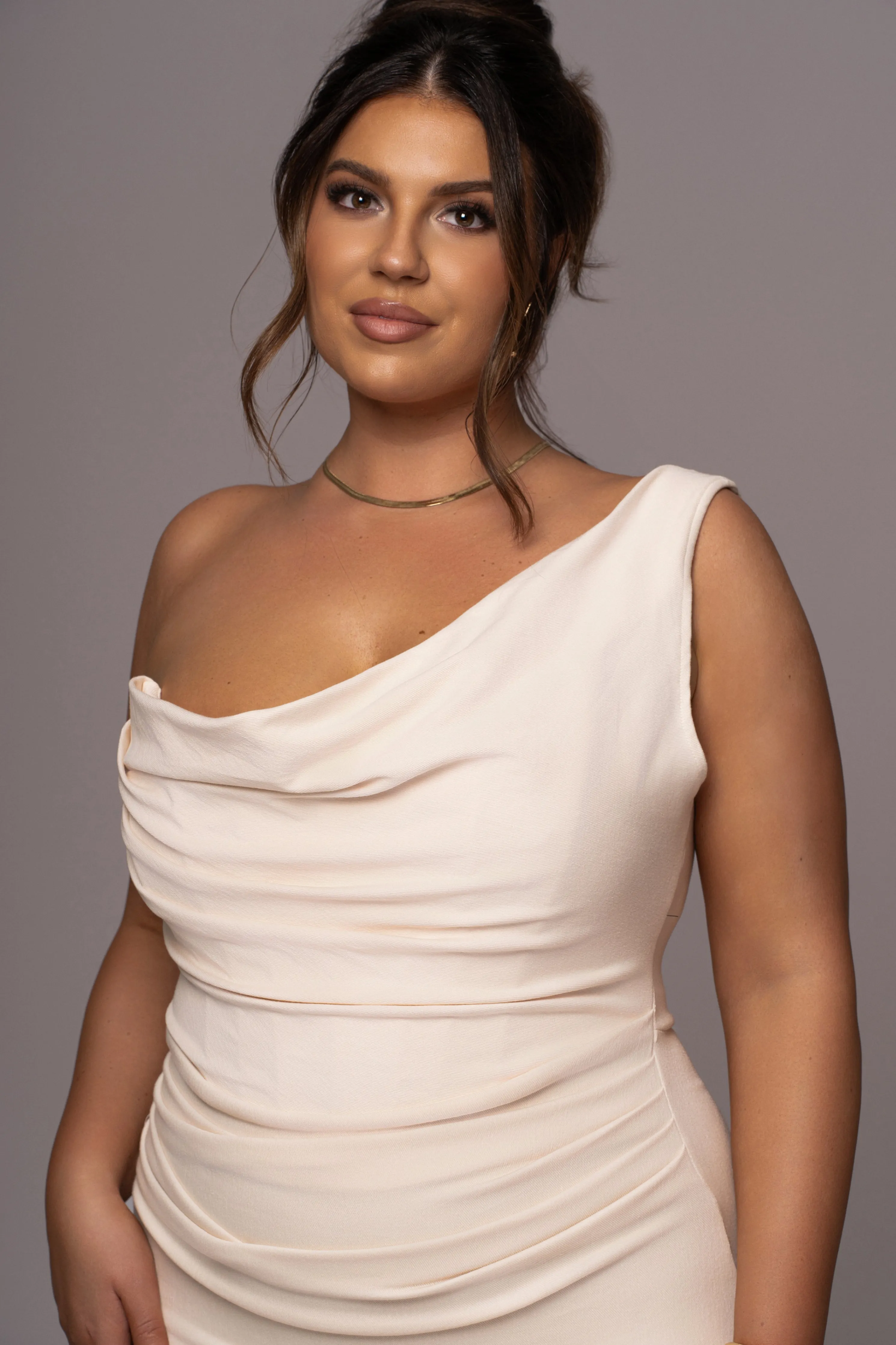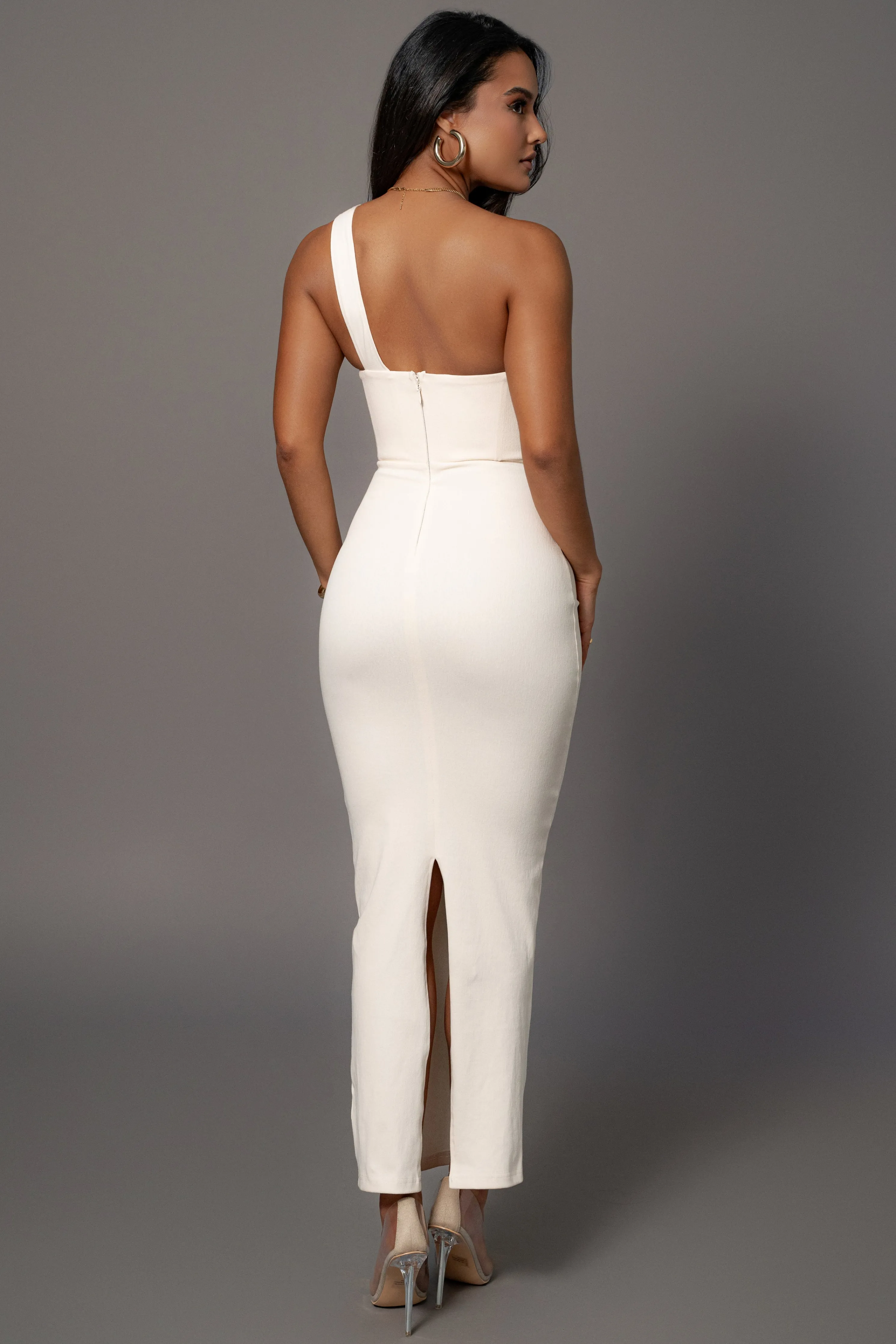 Step into the new season with our Buttercream Denim Krishna One Shoulder Maxi Dress This stunning maxi dress features a sleek one shoulder design and a built in corset under layer with boning for structure and cinching. Slight pleating at the waist and a back slit hem finish the look. Crafted in a stretch denim material for top comfort and quality. Hidden back zipper closure.
