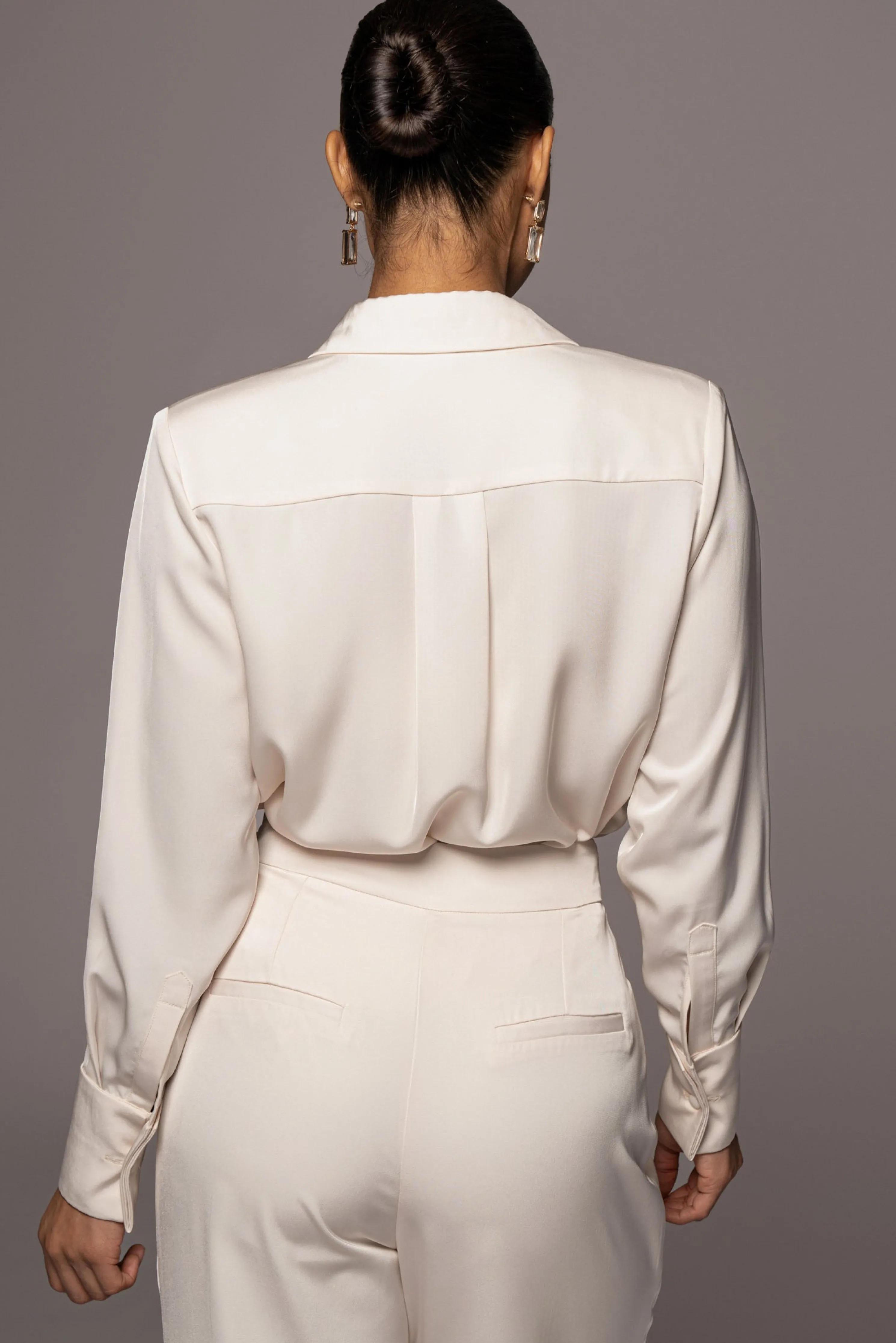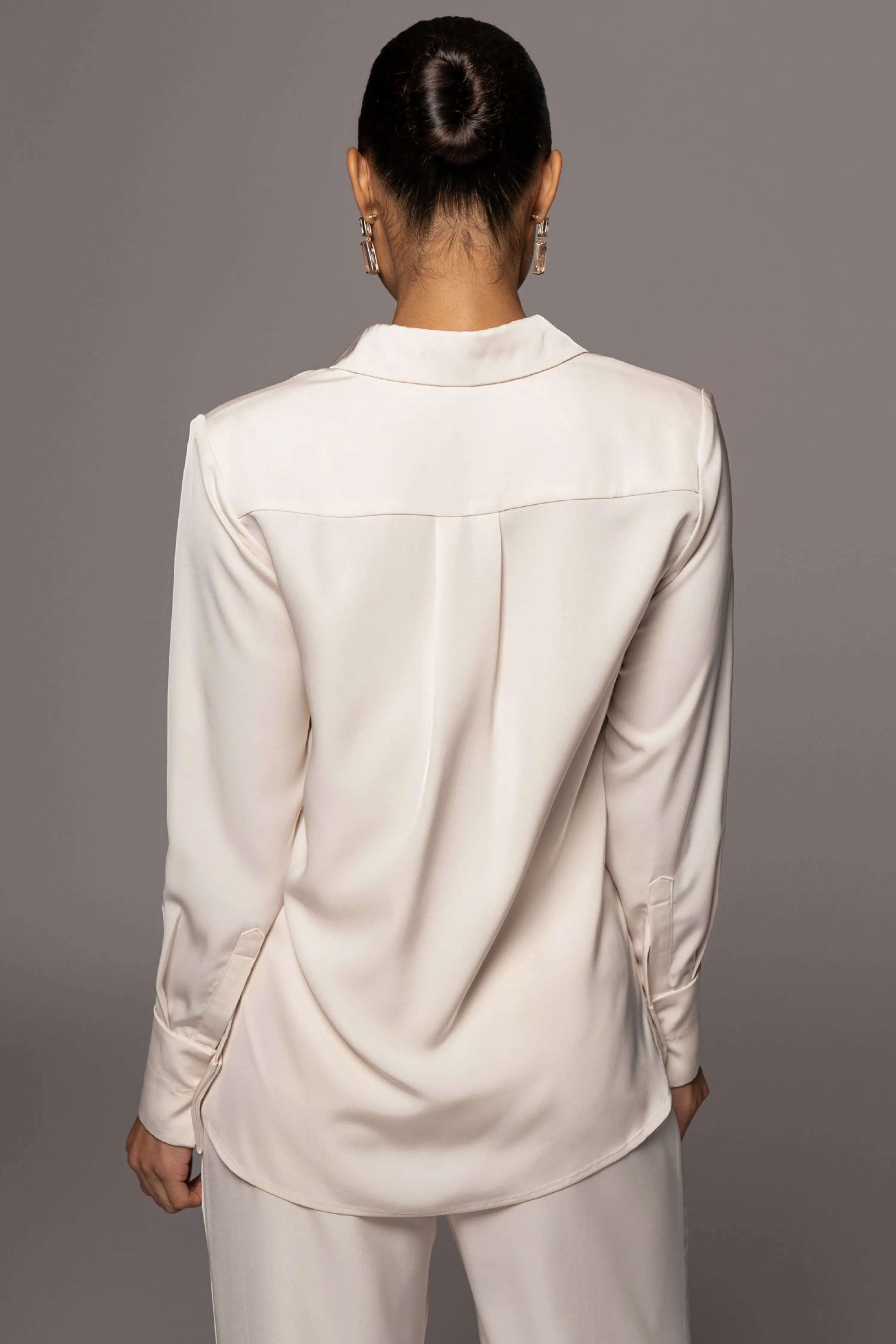 Keep things classic andchic with our Buttercream Misty Button Up This collared neck long sleeve top comes in a classic fit with two functional flap pockets and a button down front with button detailed cuffs. Style thissophisticatedtop tucked in for a workday look or wear tucked out on a day off for a casual approach. Coordinate the full look with ourCANDICE TROUSERS. Padded shoulders. No Stretch.